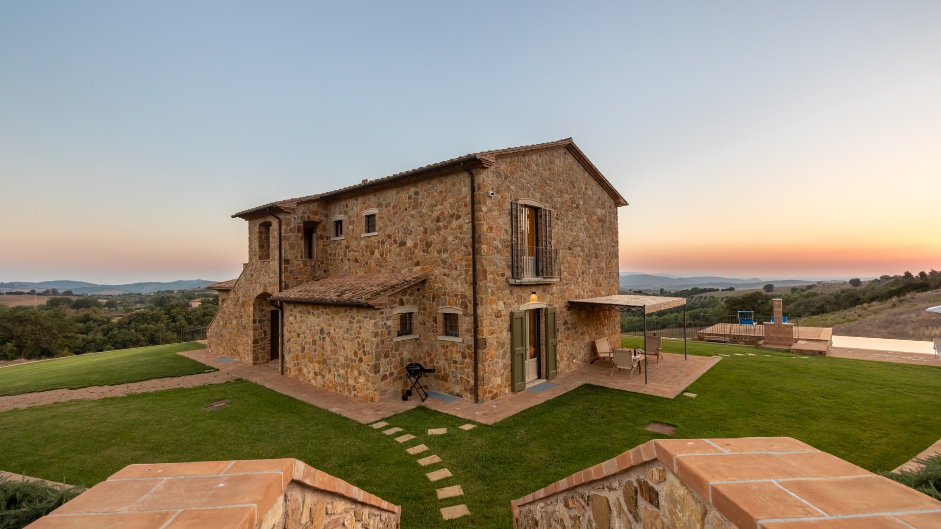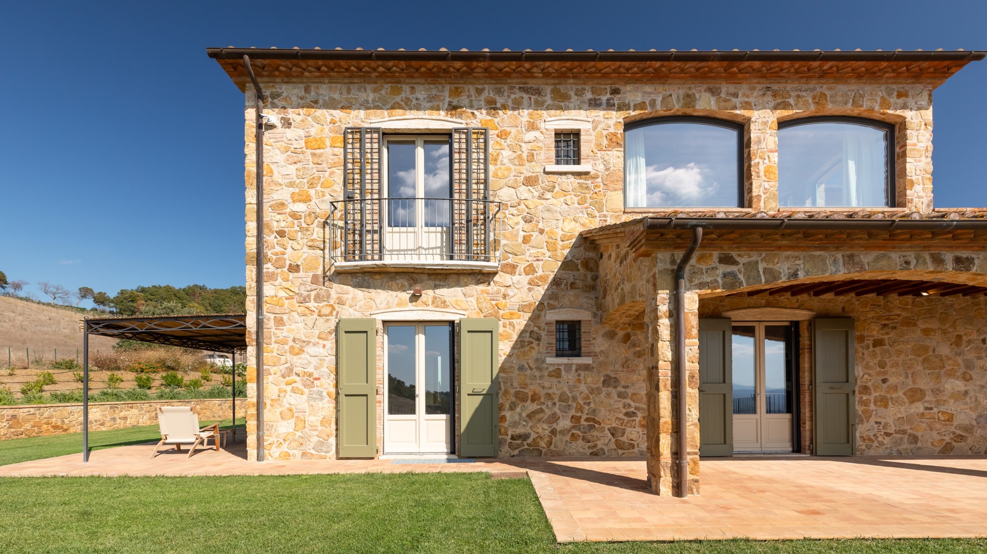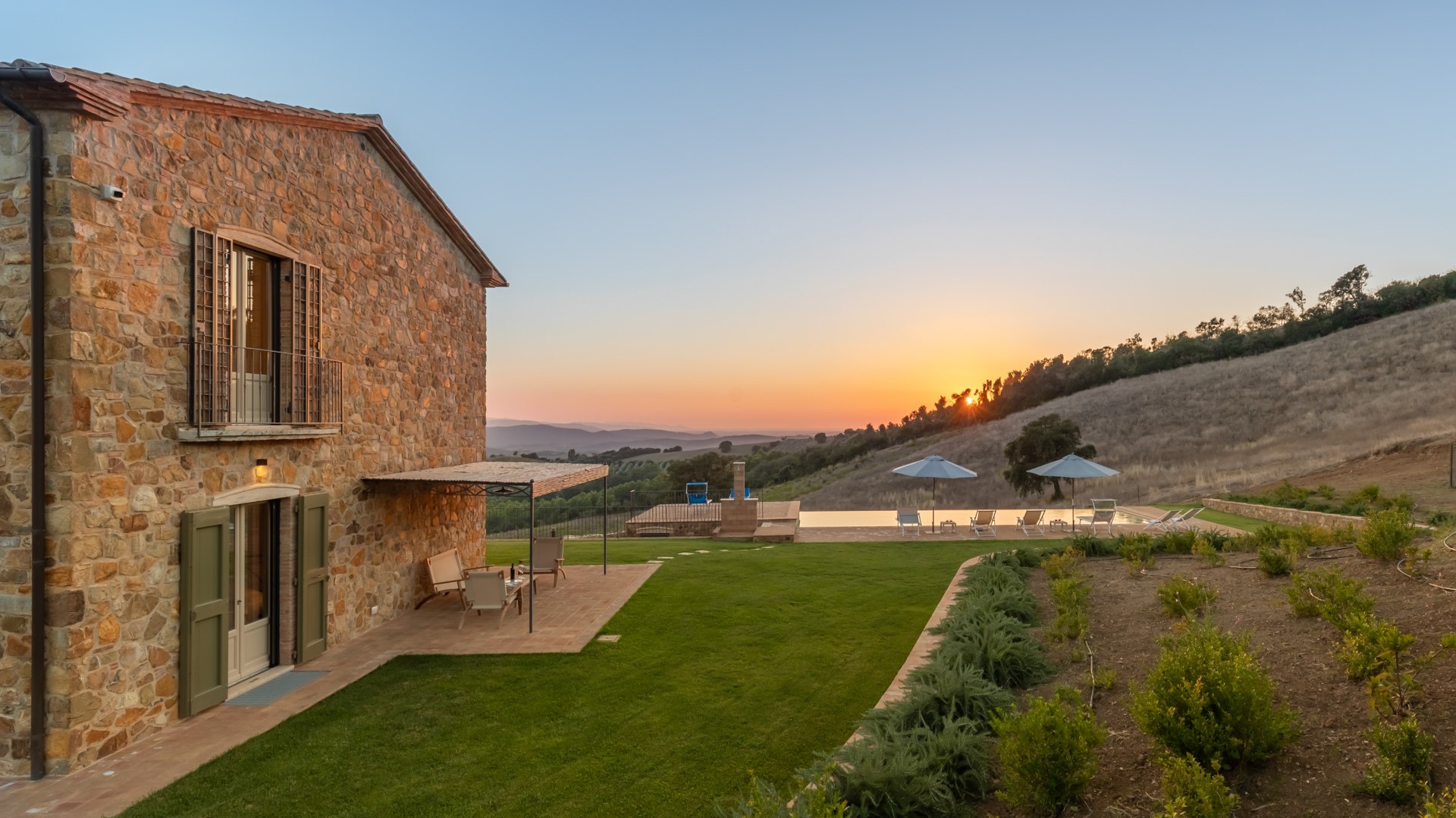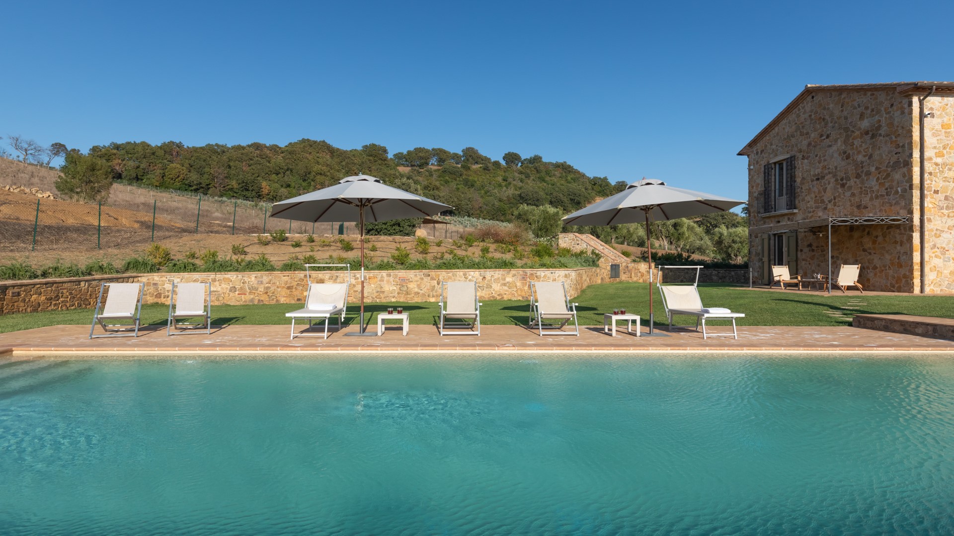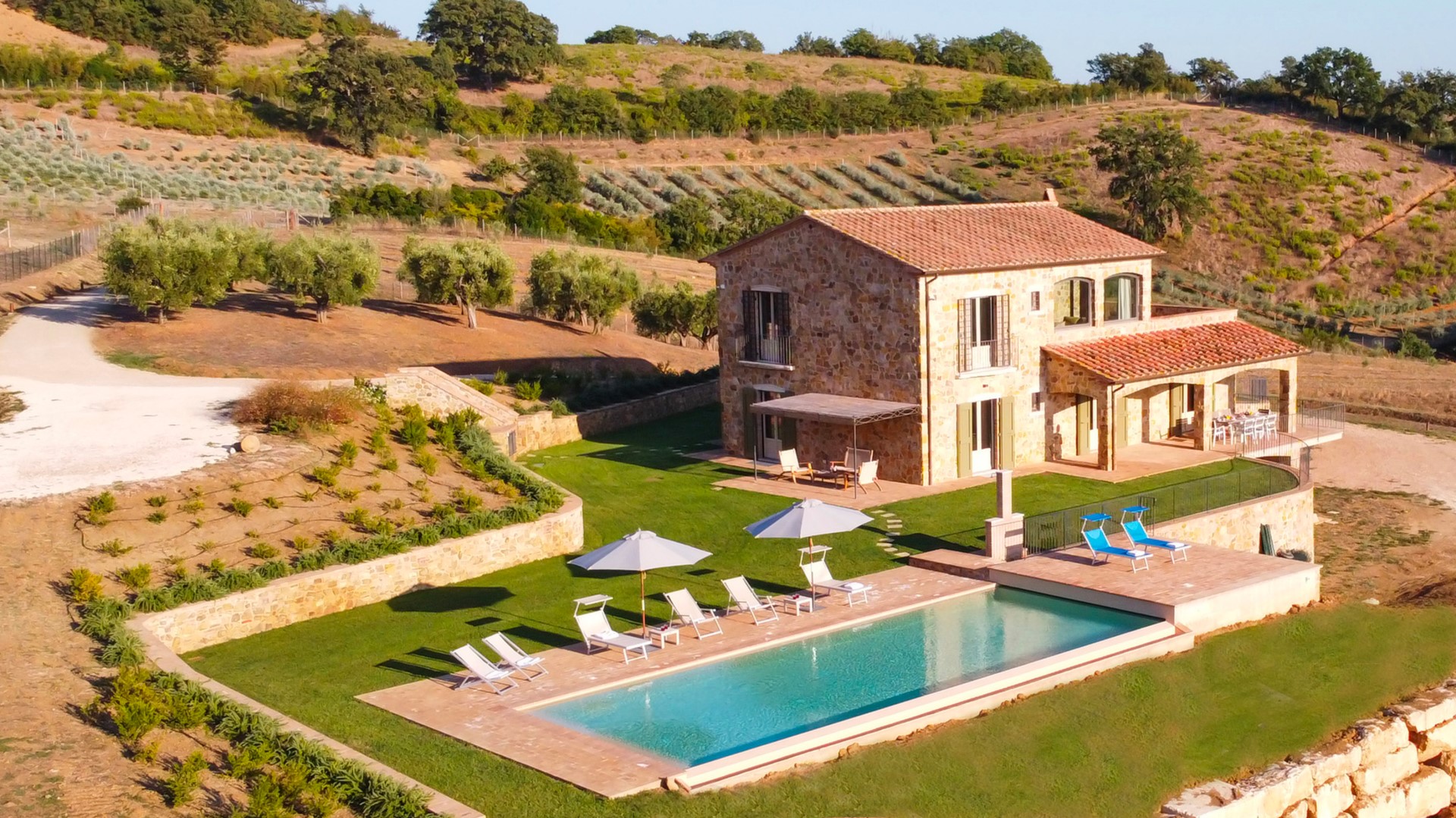 Das Anwesen von Casale Grottini erstreckt sich über 22 Hektar auf hügeligem Ackerland, das mit Olivenhainen und Weinbergen bepflanzt ist, die von Waldgebieten mit Stein- und Korkeichen durchsetzt sind, in der einzigartigen Umgebung dieser Gegend der toskanischen Maremma. Der nicht eingezäunte Park des Hauses (5000 qm) ist gekennzeichnet durch Kiesflächen, einen jungen Olivenhain, Waldstücke mit kontrollierter mediterraner Macchia und einen gepflegten Rasen, der das Haus und den Pool umgibt. Der Park erstreckt sich über mehrere Terrassenebenen mit Treppen und Stufen aus Travertin, umgeben von Mauern aus lokalem Stein und gesäumt von bunten Sträuchern und aromatischen Kräutern wie Lavendel, Rosmarin und Lorbeer. Vor den Fenstertüren des offenen Bereichs im Erdgeschoss befindet sich der Laubengang, der mit Tischen und Stühlen ausgestattet ist, um im Freien zu speisen und dabei den Blick auf das Meer am Horizont zwischen Argentario und Talamone und, an klaren Tagen, auf die wunderschöne Insel Montecristo zu genießen. Nur wenige Schritte vom Schwimmbad entfernt befindet sich die Bambus-Pergola mit Outdoor-Lounge und elektrischem Grill, ideal, um einen Aperitif zu genießen und dabei die bezaubernden Sonnenuntergänge zu bewundern. Die Außenbeleuchtung ist mit Dämmerungssensoren ausgestattet und wird durch Scheinwerfer und Laternen aus Corten mit einem sanften Licht gewährleistet, das alle von den Gästen genutzten Bereiche umgibt. 50 Meter hinter dem automatischen Fahrzeugtor befindet sich der mit Bambus überdachte Parkplatz für 3 Autos sowie ein offener Parkplatz; von hier aus erreicht man das Erdgeschoss des Hauses, indem man 11 Stufen hinuntersteigt und über Travertinplatten auf dem Rasen geht, dann weiter über die Pflasterung bis zur Außentreppe mit 17 Stufen in den ersten Stock.Bitte beachten Sie, dass die Fotos im Frühling aufgenommen wurden, also in der Blütezeit der Blumen, und dass die Farben des Grases im Garten zum Zeitpunkt Ihrer Ankunft in der Villa anders sein können.