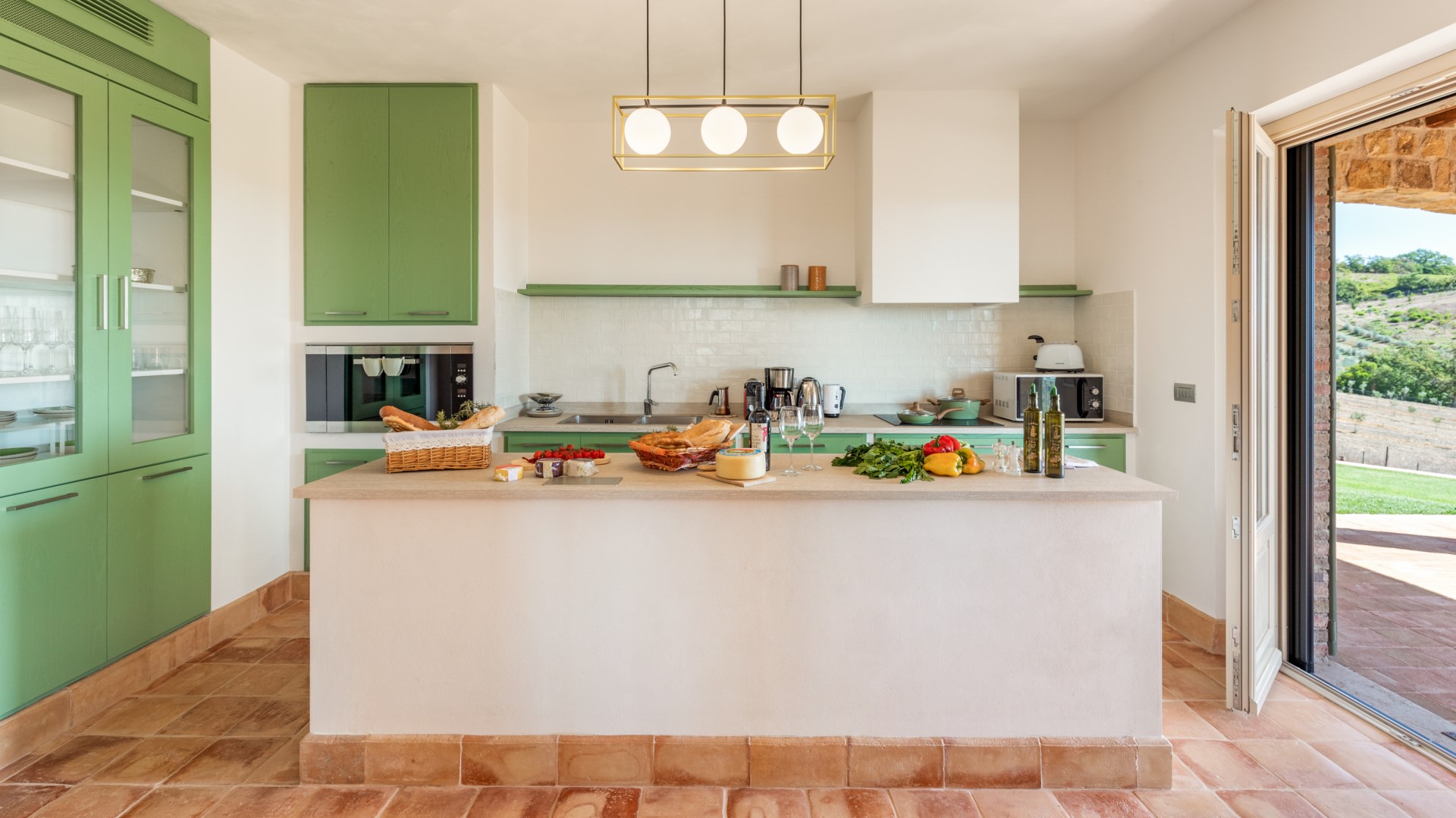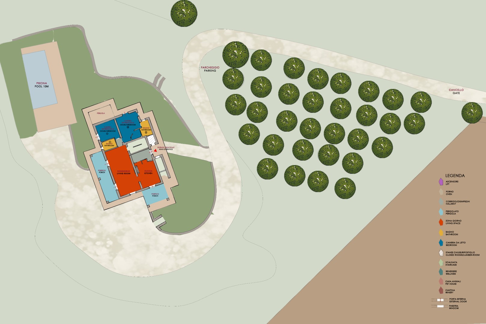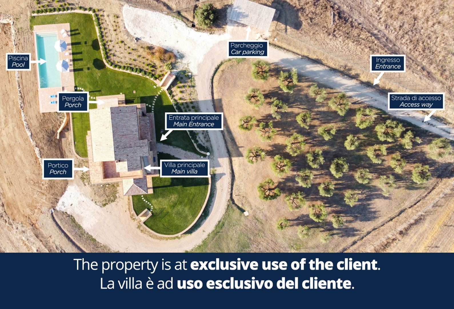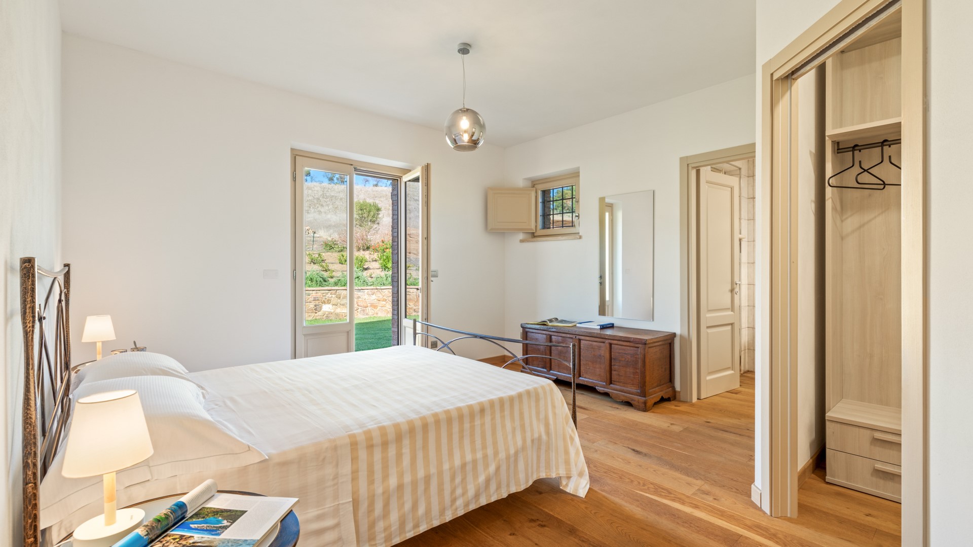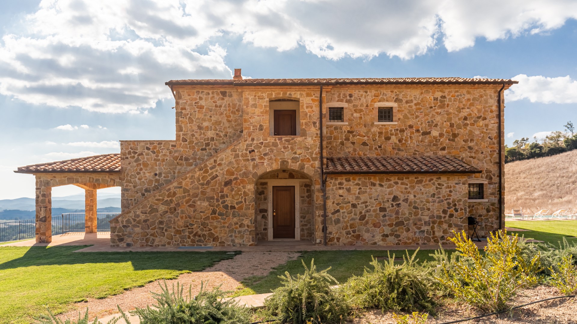 Das Anwesen von Casale Grottini erstreckt sich über 22 Hektar auf hügeligem Ackerland, das mit Olivenhainen und Weinbergen bepflanzt ist, die von Waldgebieten mit Stein- und Korkeichen durchsetzt sind, in der einzigartigen Umgebung dieser Gegend der toskanischen Maremma. Der nicht eingezäunte Park des Hauses (5000 qm) ist gekennzeichnet durch Kiesflächen, einen jungen Olivenhain, Waldstücke mit kontrollierter mediterraner Macchia und einen gepflegten Rasen, der das Haus und den Pool umgibt. Der Park erstreckt sich über mehrere Terrassenebenen mit Treppen und Stufen aus Travertin, umgeben von Mauern aus lokalem Stein und gesäumt von bunten Sträuchern und aromatischen Kräutern wie Lavendel, Rosmarin und Lorbeer. Vor den Fenstertüren des offenen Bereichs im Erdgeschoss befindet sich der Laubengang, der mit Tischen und Stühlen ausgestattet ist, um im Freien zu speisen und dabei den Blick auf das Meer am Horizont zwischen Argentario und Talamone und, an klaren Tagen, auf die wunderschöne Insel Montecristo zu genießen. Nur wenige Schritte vom Schwimmbad entfernt befindet sich die Bambus-Pergola mit Outdoor-Lounge und elektrischem Grill, ideal, um einen Aperitif zu genießen und dabei die bezaubernden Sonnenuntergänge zu bewundern. Die Außenbeleuchtung ist mit Dämmerungssensoren ausgestattet und wird durch Scheinwerfer und Laternen aus Corten mit einem sanften Licht gewährleistet, das alle von den Gästen genutzten Bereiche umgibt. 50 Meter hinter dem automatischen Fahrzeugtor befindet sich der mit Bambus überdachte Parkplatz für 3 Autos sowie ein offener Parkplatz; von hier aus erreicht man das Erdgeschoss des Hauses, indem man 11 Stufen hinuntersteigt und über Travertinplatten auf dem Rasen geht, dann weiter über die Pflasterung bis zur Außentreppe mit 17 Stufen in den ersten Stock.Bitte beachten Sie, dass die Fotos im Frühling aufgenommen wurden, also in der Blütezeit der Blumen, und dass die Farben des Grases im Garten zum Zeitpunkt Ihrer Ankunft in der Villa anders sein können.