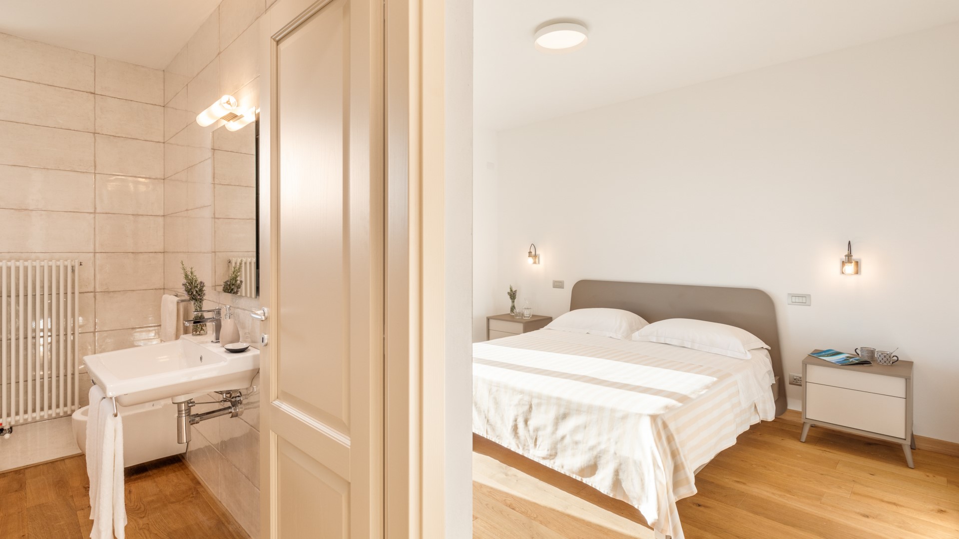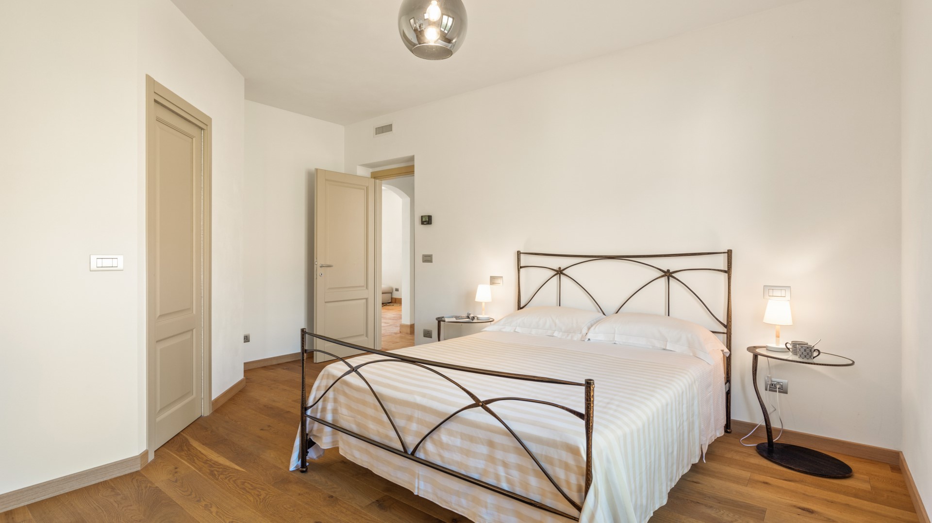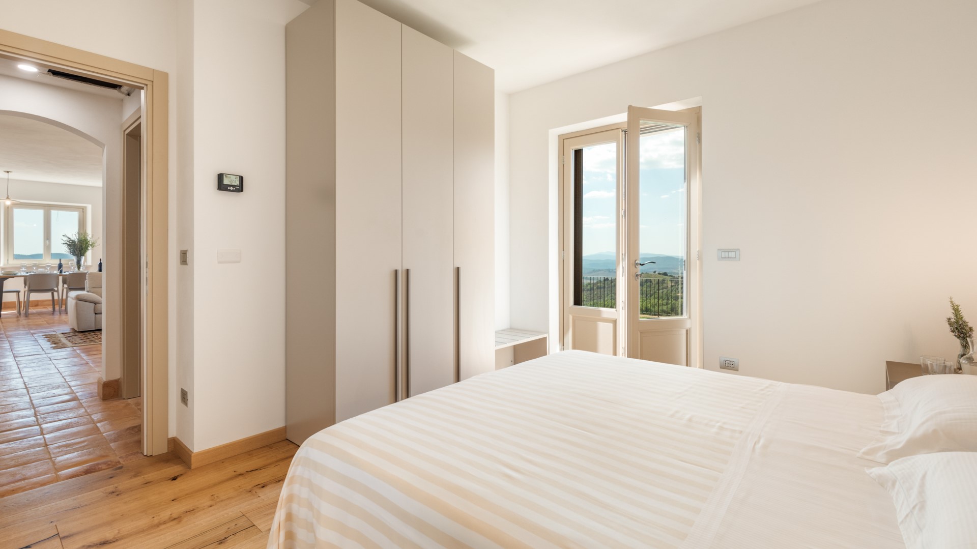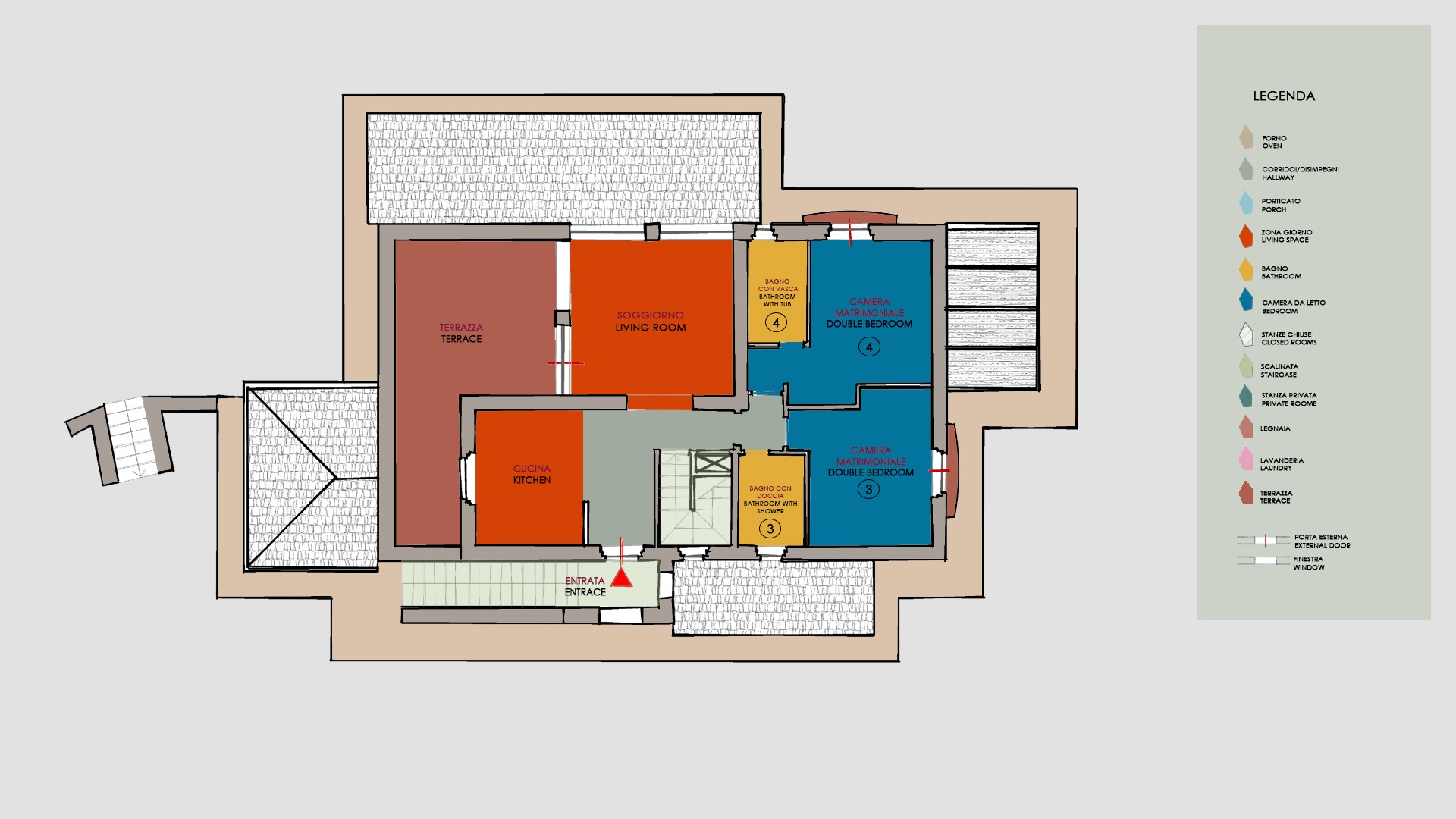 Casale Grottini (250 qm) besteht aus drei Etagen, die durch Innen- und Außentreppen verbunden sind. Der Haupteingang führt in den hellen, offenen Bereich im Erdgeschoss, der aus einem Wohnzimmer mit Smart-TV und einem Esszimmer mit einem holzbefeuerten Thermokamin besteht, der von der Küche geteilt wird, die mit dem offenen Bereich durch zwei Kassettentüren in einem Konzept der kreisförmigen Nutzung dieser großen Umgebung verbunden ist. Dieser offene Bereich verfügt über zwei Fenstertüren mit Ausgängen zum Panoramabalkon mit seitlichem Blick auf den Pool, der als Essbereich im Freien genutzt wird. Von der voll ausgestatteten Küche mit Insel führt eine Fenstertür zu einem zweiten Laubengang neben der Außentreppe (17 Stufen), die in den ersten Stock führt. Das Erdgeschoss besteht aus einem Badezimmer mit Dusche, einem Doppelzimmer mit direktem Ausgang zum Garten und einem Doppelzimmer mit begehbarem Kleiderschrank, eigenem Badezimmer mit Badewanne und direktem Ausgang zum Garten neben der Pergola. Vom offenen Bereich im Erdgeschoss führt die Innentreppe (16 Stufen) in den ersten Stock, der aus einer kompletten Küche mit Esstisch und Eingang von der Außentreppe, einem Wohnzimmer mit Smart-TV und Ausgang zur Panoramaterrasse besteht. Die erste Etage wird durch ein Badezimmer mit Dusche, ein Schlafzimmer mit Doppelbett und ein weiteres Schlafzimmer mit Doppelbett und eigenem Bad mit Badewanne mit Blick auf den Pool vervollständigt. Im Untergeschoss, nur intern verbunden (16 Stufen zum Erdgeschoss), ist ein Raum mit Heimtrainer und andere Räume für die ausschließliche Verwendung des Eigentums. Die Waschküche befindet sich im Erdgeschoss mit Zugang von außen, neben der Eingangstür.