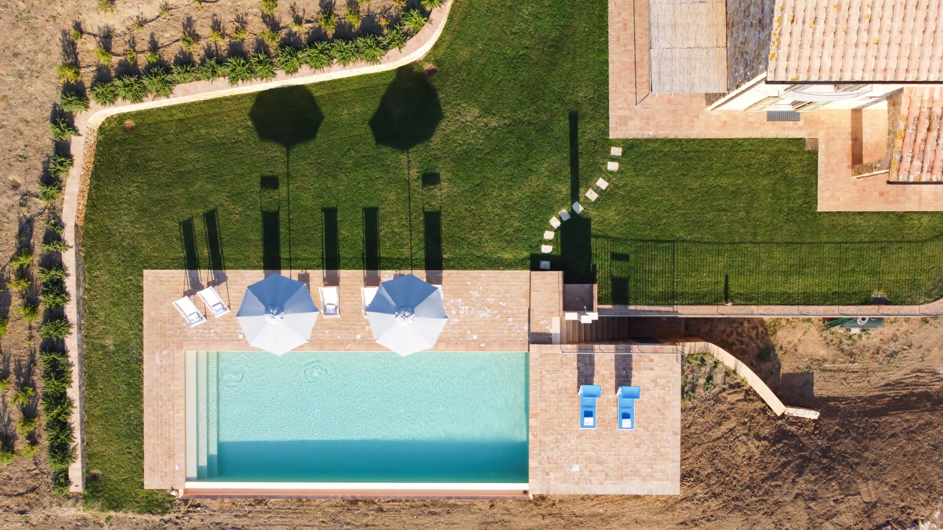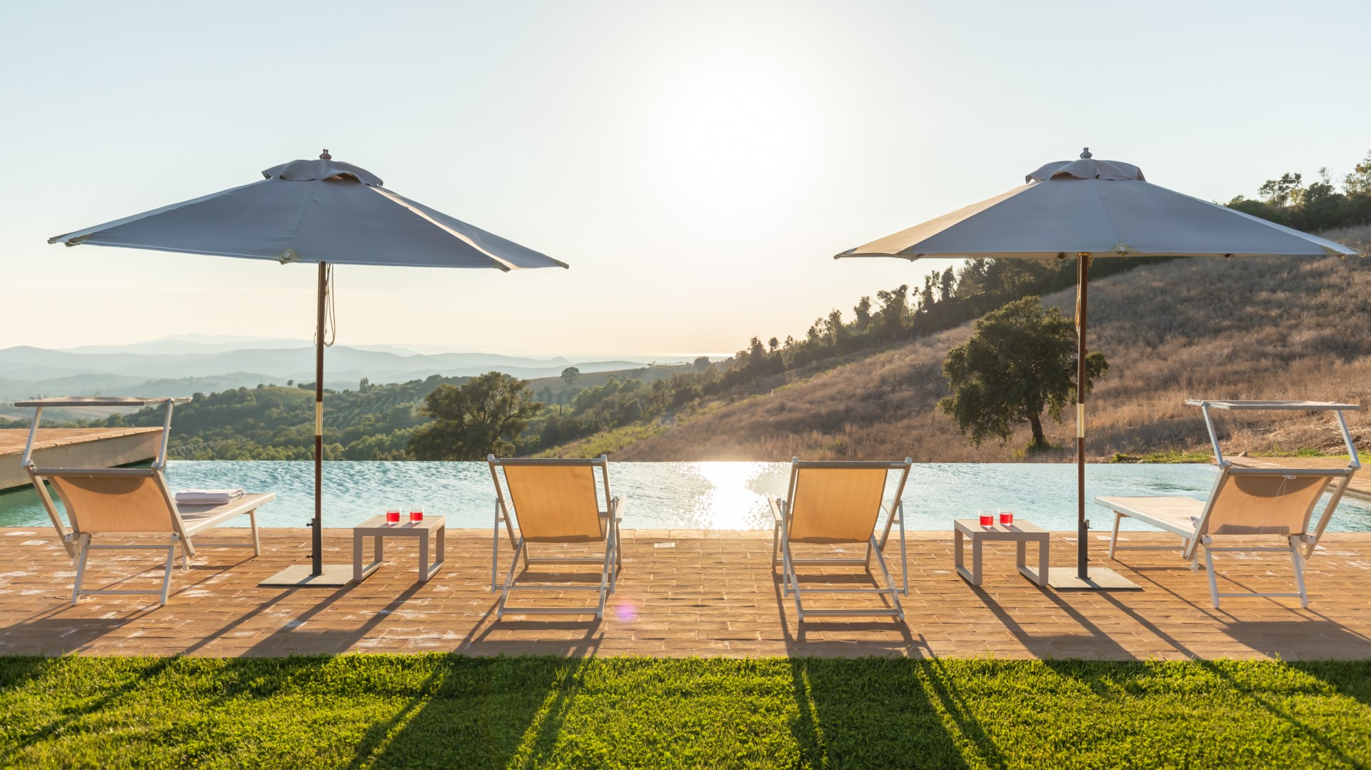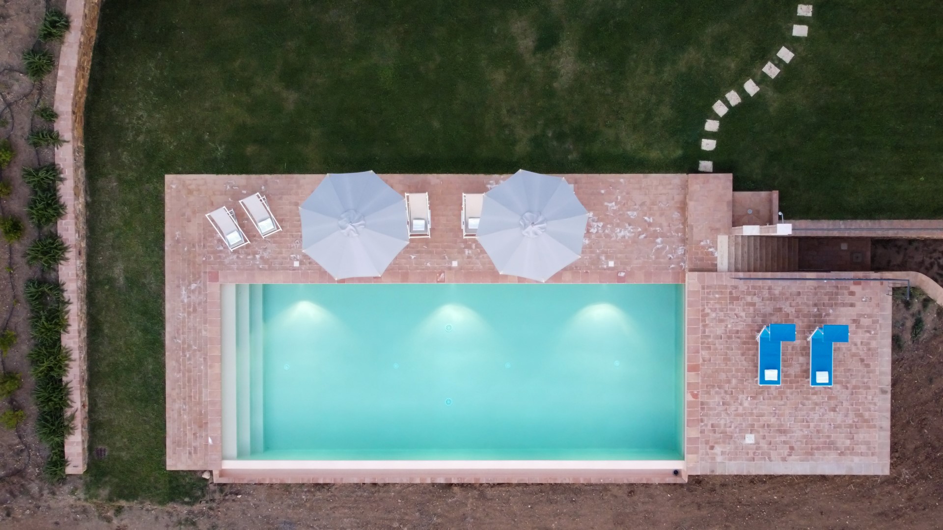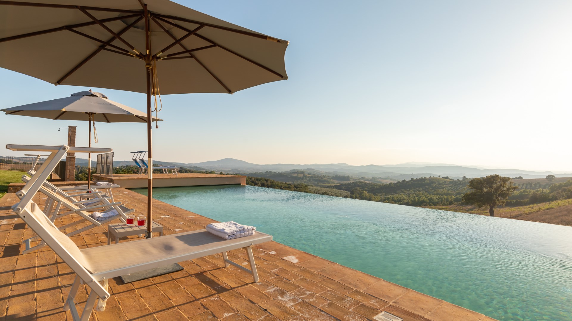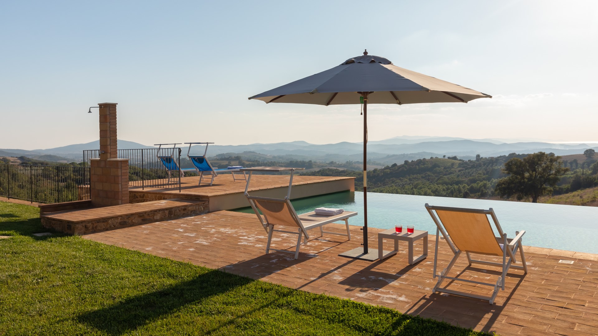Das exklusive Schwimmbad von Casale Grottini befindet sich auf der gleichen Ebene wie das Erdgeschoss und ist vom Portikus (20 m) und von der Pergola (10 m) aus über 2 Stufen leicht erreichbar. Auf der Talseite befindet sich der rechteckige Infinity-Pool mit einer Größe von 13 x 5 m und einer konstanten Tiefe von 1,4 m. Er hat einen Rand aus Terrakotta, ist mit einem sandfarbenen Touch-PVC ausgekleidet und verfügt über eine Salzreinigung und drei Stufen an einer der kurzen Seiten für den Zugang zum Wasser. Der Pool ist immer der Sonne ausgesetzt und bietet einen Panoramablick auf das Tal mit den Hügeln am Horizont und dem Meer im Hintergrund. Die Sonnenterrasse aus handgefertigter Terrakotta, die von einem üppigen Rasen umrahmt wird, ist mit 2 Sonnenschirmen, Sonnenliegen, Liegestühlen und einer Warmwasserdusche ausgestattet. Der Pool ist sowohl von innen (LED-Lichter mit manueller Zündung) als auch von außen im Solarium (Lichter mit Dämmerungssensor) beleuchtet. Das Schwimmbad ist vom letzten Samstag im April bis zum ersten Samstag im Oktober geöffnet.