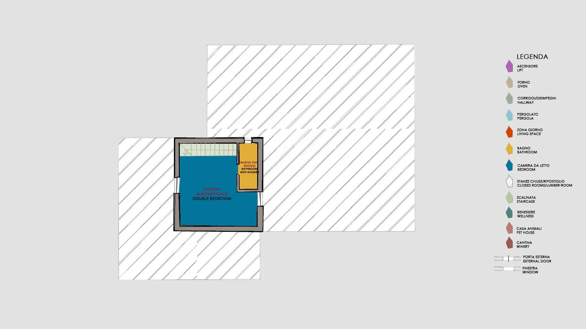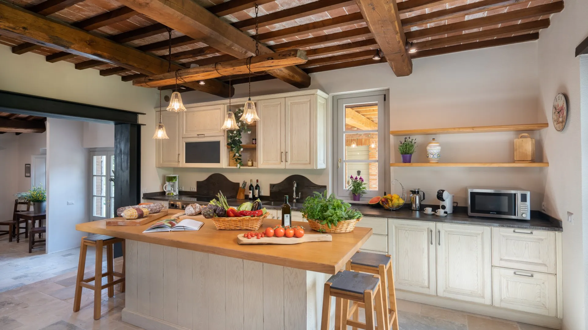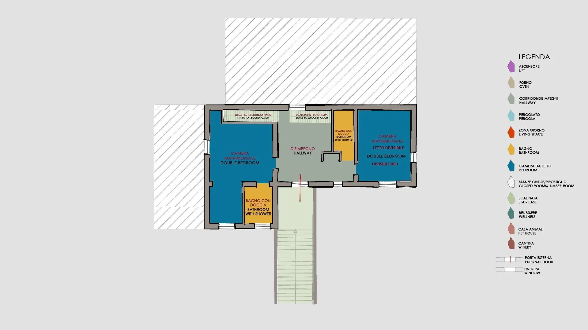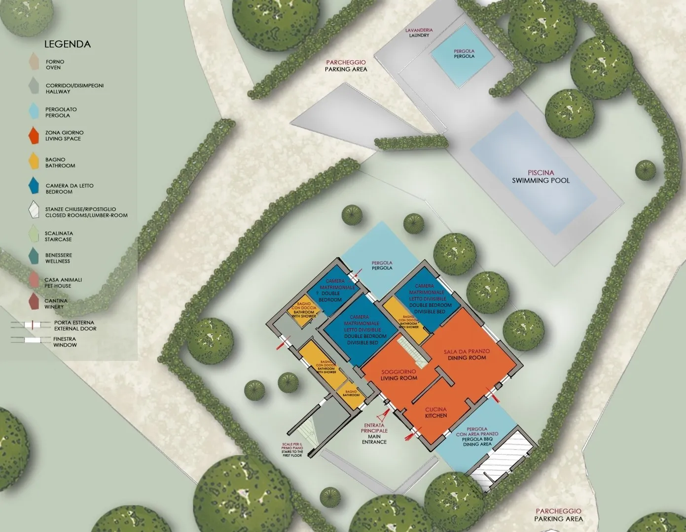 Le Colombelline verfügt über drei Etagen mit einer Gesamtfläche von ca. 300 m², die durch eine interne Holztreppe verbunden sind. Das Erdgeschoss und der erste Stock sind auch durch eine externe Terrakotta-Treppe (20 Stufen) mit einer Loggia verbunden. Der Eingang im Erdgeschoss führt in das Wohnzimmer mit Satelliten- und Smart-TV, das mit der Küche verbunden ist und über zwei Stufen mit dem Esszimmer verbunden ist. Die Küche, mit direktem Ausgang zum Garten, ist über zwei Stufen mit dem Esszimmer verbunden, das einen direkten Ausgang zum externen Essbereich hat und an das Doppelzimmer mit teilbaren Betten und eigenem Bad mit Dusche angrenzt, das für Menschen mit körperlichen Behinderungen geeignet ist. Vom Wohnzimmer aus gelangt man über zwei Stufen in einen langen Flur, von dem aus man in ein Gästebad, ein Doppelschlafzimmer mit teilbaren Betten und gegenüber in ein Bad mit Dusche, ein Doppelschlafzimmer mit eigenem Bad mit Dusche und Ausgang zur Pergola mit Blick auf den Pool gelangt. Am Ende des Flurs führt eine Balkontür in den Garten. Vom Wohnzimmer aus führt eine Innentreppe (14 Stufen) in den ersten Stock, wo sich die Kochnische, die Tür nach draußen, ein Doppelschlafzimmer mit eigenem Bad mit Dusche, ein Doppelschlafzimmer mit teilbaren Betten und ein angrenzendes Bad mit Dusche befinden. Die Treppe (15 Stufen) führt dann weiter in den zweiten Stock mit einem Doppelschlafzimmer mit eigenem Bad mit Dusche. (Bitte beachten Sie: Ofen und Kamin sind Ziergegenstände)