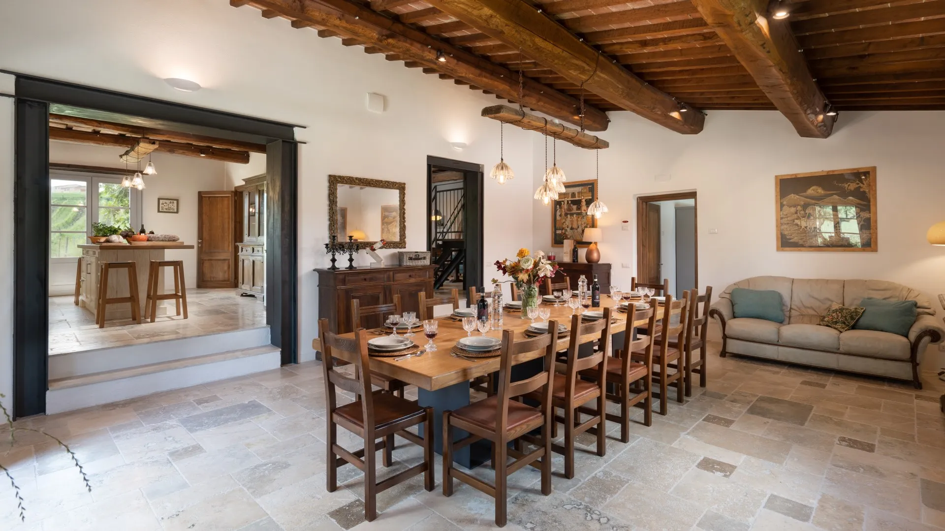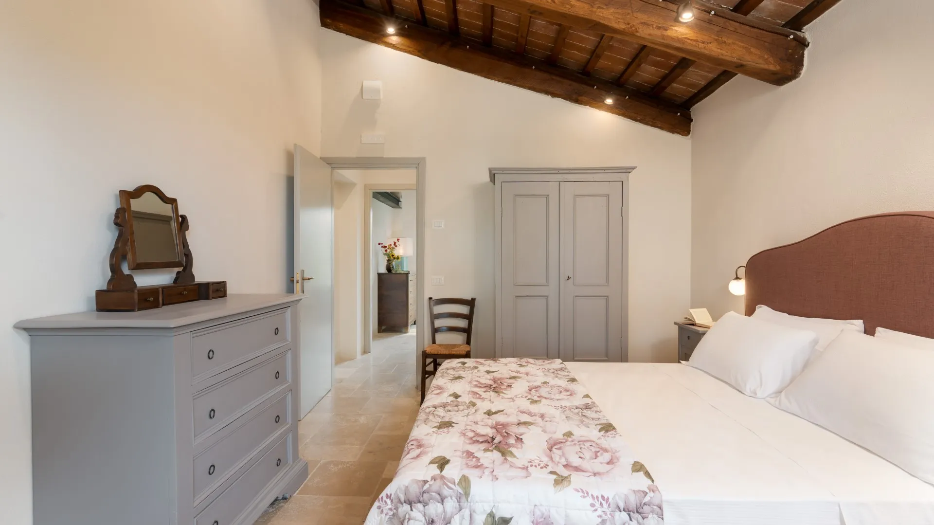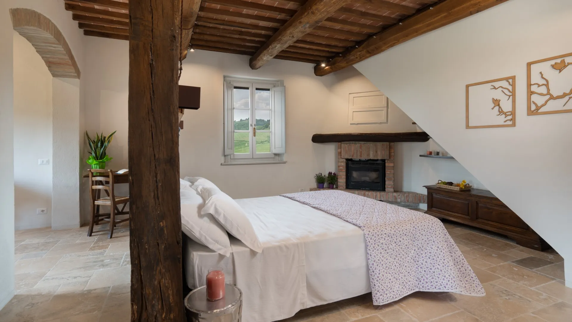 Le Colombelline verfügt über drei Etagen mit einer Gesamtfläche von ca. 300 m², die durch eine interne Holztreppe verbunden sind. Das Erdgeschoss und der erste Stock sind auch durch eine externe Terrakotta-Treppe (20 Stufen) mit einer Loggia verbunden. Der Eingang im Erdgeschoss führt in das Wohnzimmer mit Satelliten- und Smart-TV, das mit der Küche verbunden ist und über zwei Stufen mit dem Esszimmer verbunden ist. Die Küche, mit direktem Ausgang zum Garten, ist über zwei Stufen mit dem Esszimmer verbunden, das einen direkten Ausgang zum externen Essbereich hat und an das Doppelzimmer mit teilbaren Betten und eigenem Bad mit Dusche angrenzt, das für Menschen mit körperlichen Behinderungen geeignet ist. Vom Wohnzimmer aus gelangt man über zwei Stufen in einen langen Flur, von dem aus man in ein Gästebad, ein Doppelschlafzimmer mit teilbaren Betten und gegenüber in ein Bad mit Dusche, ein Doppelschlafzimmer mit eigenem Bad mit Dusche und Ausgang zur Pergola mit Blick auf den Pool gelangt. Am Ende des Flurs führt eine Balkontür in den Garten. Vom Wohnzimmer aus führt eine Innentreppe (14 Stufen) in den ersten Stock, wo sich die Kochnische, die Tür nach draußen, ein Doppelschlafzimmer mit eigenem Bad mit Dusche, ein Doppelschlafzimmer mit teilbaren Betten und ein angrenzendes Bad mit Dusche befinden. Die Treppe (15 Stufen) führt dann weiter in den zweiten Stock mit einem Doppelschlafzimmer mit eigenem Bad mit Dusche. (Bitte beachten Sie: Ofen und Kamin sind Ziergegenstände)