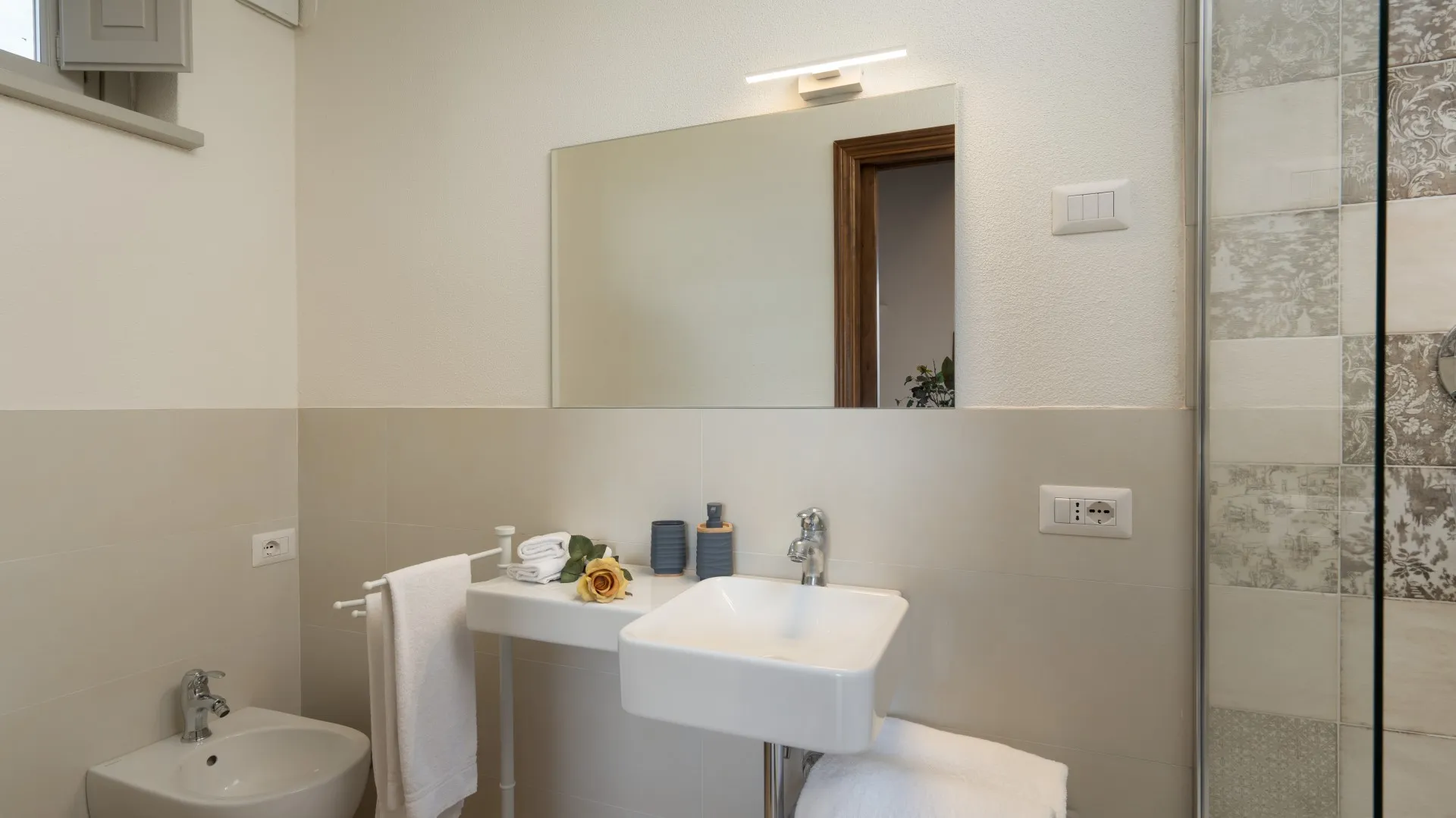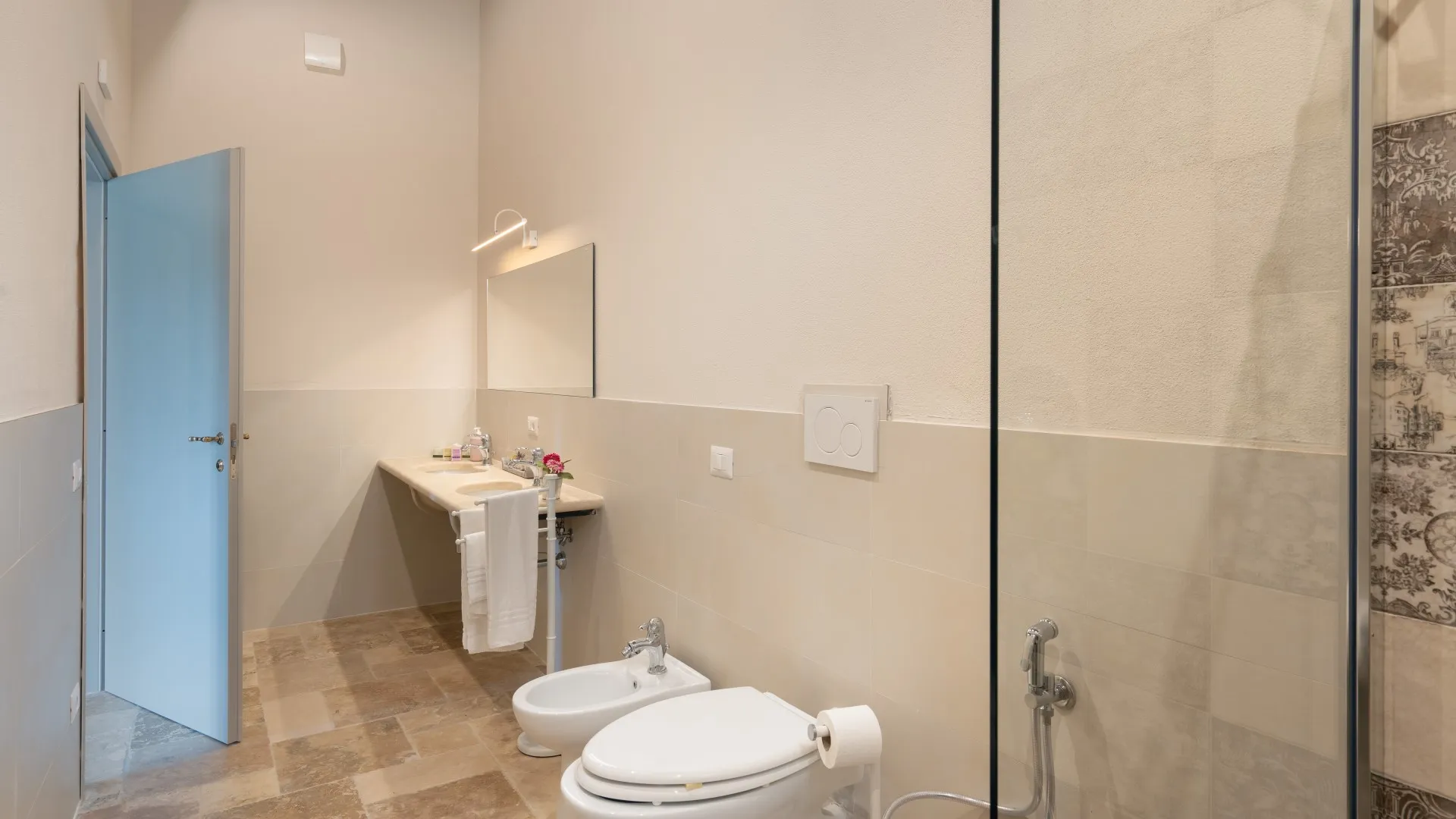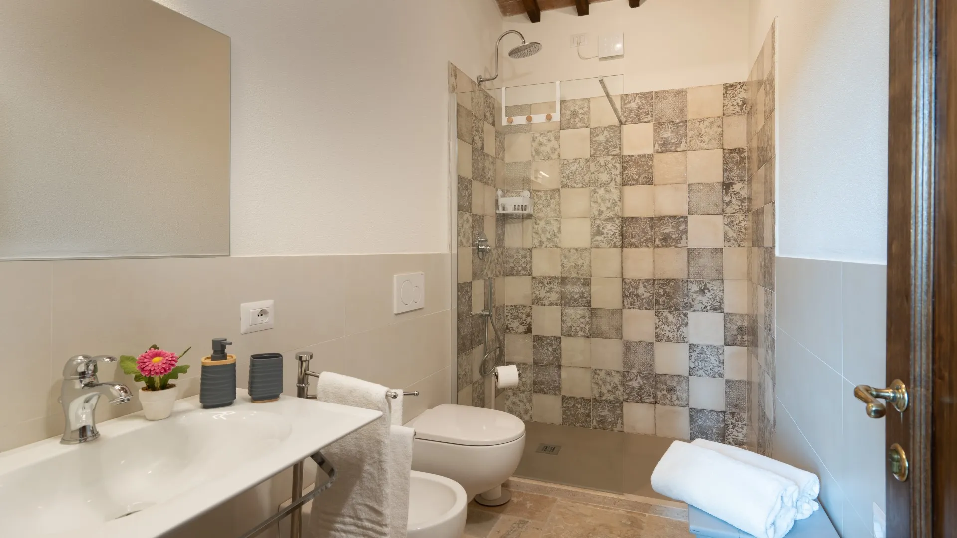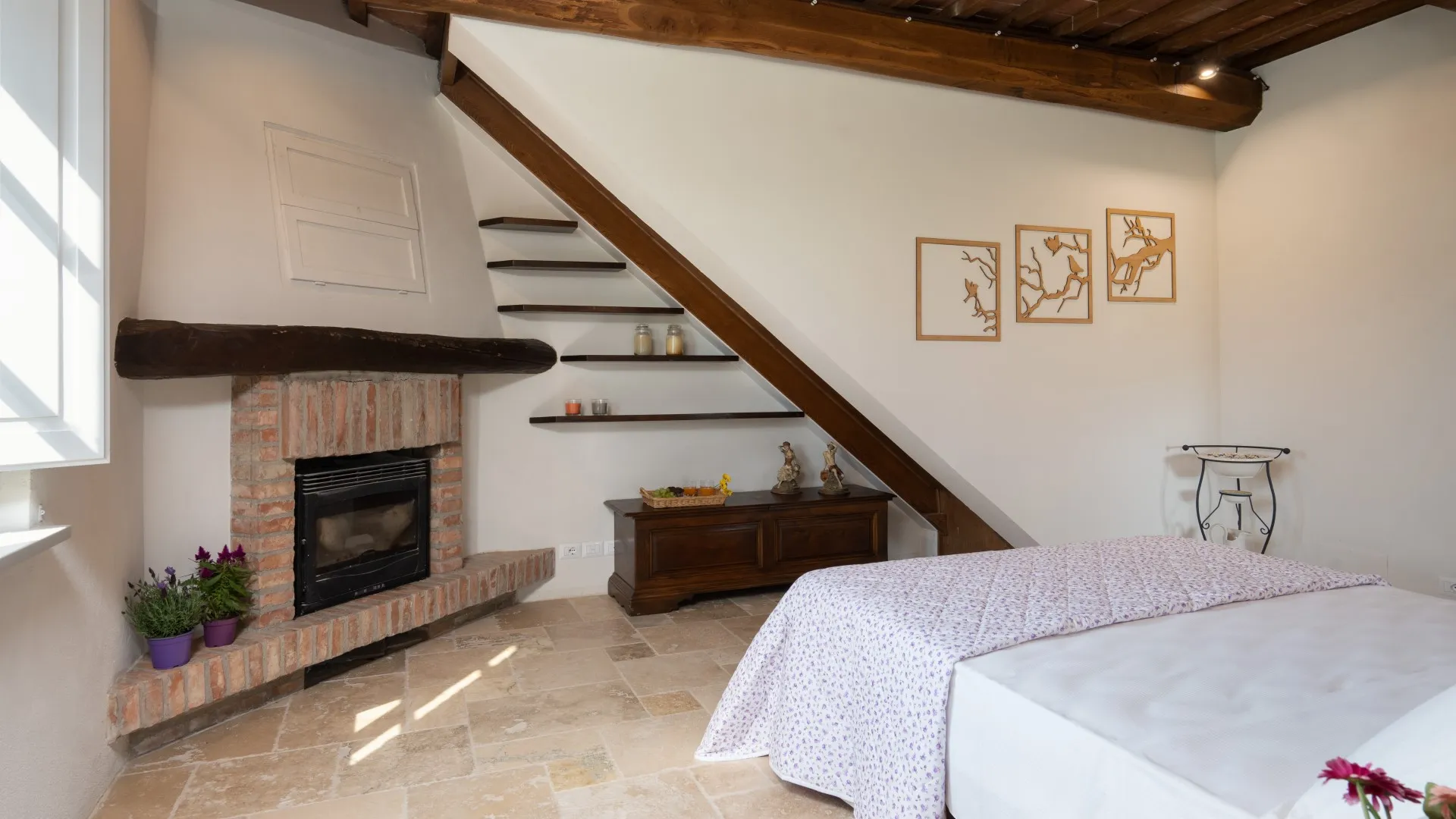 Le Colombelline verfügt über drei Etagen mit einer Gesamtfläche von ca. 300 m², die durch eine interne Holztreppe verbunden sind. Das Erdgeschoss und der erste Stock sind auch durch eine externe Terrakotta-Treppe (20 Stufen) mit einer Loggia verbunden. Der Eingang im Erdgeschoss führt in das Wohnzimmer mit Satelliten- und Smart-TV, das mit der Küche verbunden ist und über zwei Stufen mit dem Esszimmer verbunden ist. Die Küche, mit direktem Ausgang zum Garten, ist über zwei Stufen mit dem Esszimmer verbunden, das einen direkten Ausgang zum externen Essbereich hat und an das Doppelzimmer mit teilbaren Betten und eigenem Bad mit Dusche angrenzt, das für Menschen mit körperlichen Behinderungen geeignet ist. Vom Wohnzimmer aus gelangt man über zwei Stufen in einen langen Flur, von dem aus man in ein Gästebad, ein Doppelschlafzimmer mit teilbaren Betten und gegenüber in ein Bad mit Dusche, ein Doppelschlafzimmer mit eigenem Bad mit Dusche und Ausgang zur Pergola mit Blick auf den Pool gelangt. Am Ende des Flurs führt eine Balkontür in den Garten. Vom Wohnzimmer aus führt eine Innentreppe (14 Stufen) in den ersten Stock, wo sich die Kochnische, die Tür nach draußen, ein Doppelschlafzimmer mit eigenem Bad mit Dusche, ein Doppelschlafzimmer mit teilbaren Betten und ein angrenzendes Bad mit Dusche befinden. Die Treppe (15 Stufen) führt dann weiter in den zweiten Stock mit einem Doppelschlafzimmer mit eigenem Bad mit Dusche. (Bitte beachten Sie: Ofen und Kamin sind Ziergegenstände)