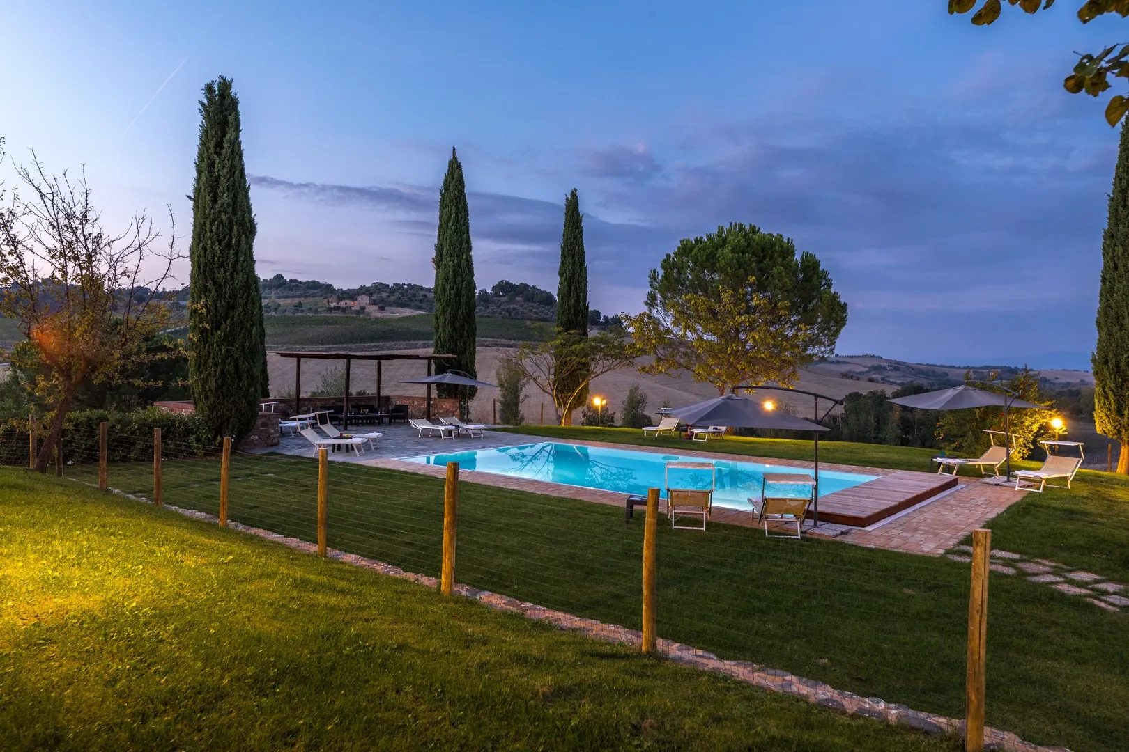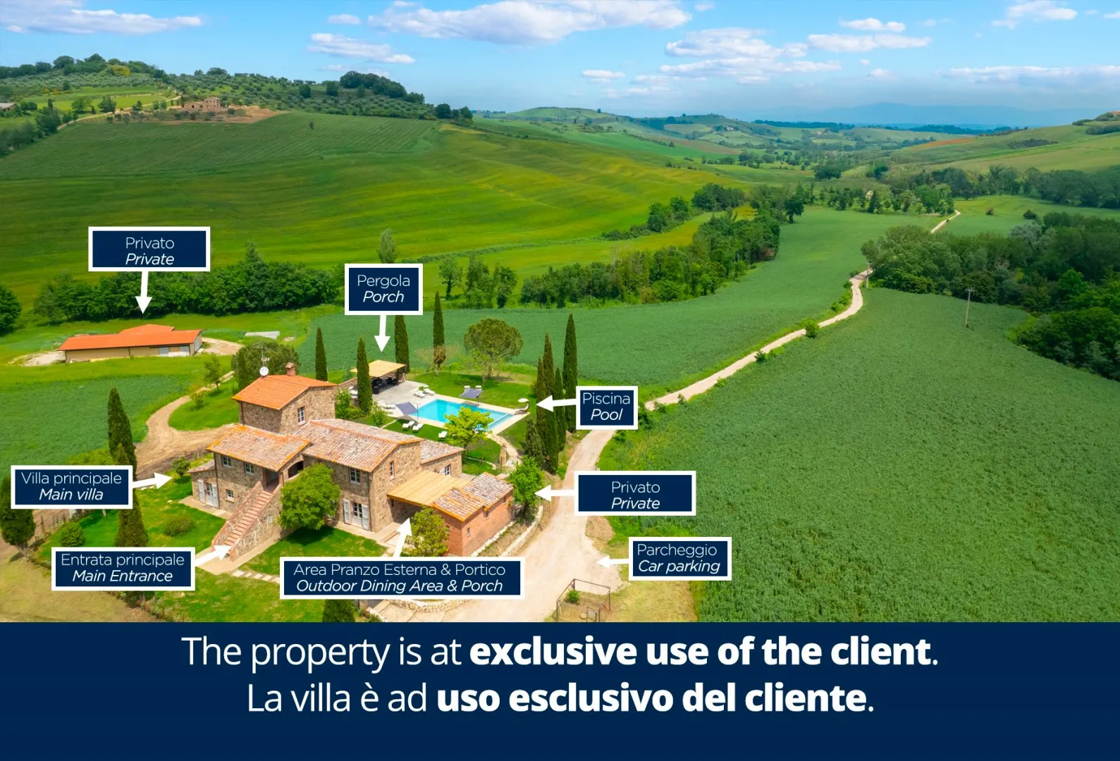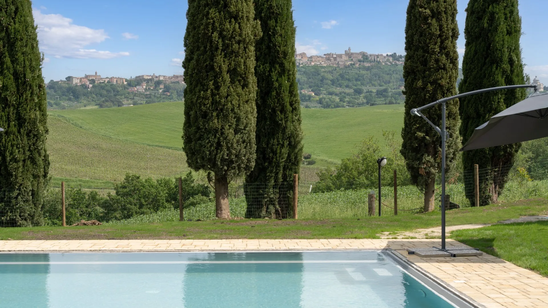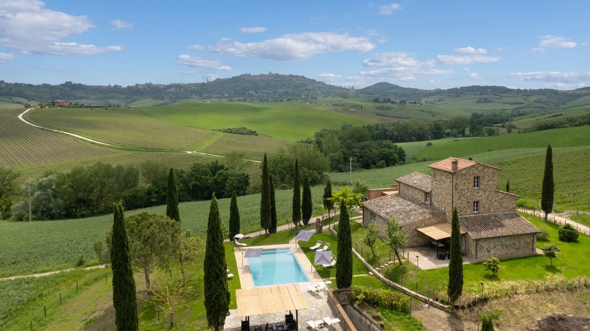 Das Anwesen erstreckt sich über etwa 15 Hektar nicht eingezäuntes Gelände mit Weinbergen und Ackerland. Der Teil um das Haus und das Schwimmbad (1800 m²) ist mit Rasen, Olivenbäumen, Steineichen und Zypressen, Rosmarin, Kräutern und Lorbeeren bewachsen. Der Essbereich im Freien, zwischen dem Esszimmer und dem Nebengebäude (für die private Nutzung des Anwesens), wird von einem natürlichen Schilfdach beschattet, das den landschaftlichen Gegebenheiten der Gegend entspricht; er wird vom gemauerten Grill bedient und befindet sich nur wenige Meter von der Küche entfernt neben dem Steinpflaster, das zum Schwimmbad führt. Eines der Schlafzimmer im Erdgeschoss hat einen direkten Ausgang zur Pergola, die auf den Pool ausgerichtet ist und eine Sitzecke im Freien bietet, wo die Gäste entspannende Aperitifs mit den toskanischen Hügeln im Hintergrund genießen können. Der Zugang zum Grundstück erfolgt über ein hölzernes Fußgängertor mit manueller Öffnung. Ein Freiluftparkplatz für 4 Autos befindet sich außerhalb des Grundstücks, wo zwei lokale Feldwege zusammenlaufen, die typisch für die Postkartenlandschaft der Hügel von Montepulciano sind. Die Waschküche befindet sich neben dem Parkplatz und ist von außen zugänglich. Im abfallenden Teil des Grundstücks befinden sich junge Olivenbäume, die gerade erst gepflanzt wurden, der Weinberg und die für die toskanische Hügellandschaft typischen Waldstücke. Die zahlreichen direkten Ausgänge zum Garten ermöglichen eine einfache Nutzung dieser exklusiven Residenz in einer der schönsten ländlichen Gegenden Italiens.Bitte beachten Sie, dass die Fotos im Frühling aufgenommen wurden, also in der Blütezeit der Blumen, und dass die Farben des Grases im Garten zum Zeitpunkt Ihrer Ankunft in der Villa anders sein können.