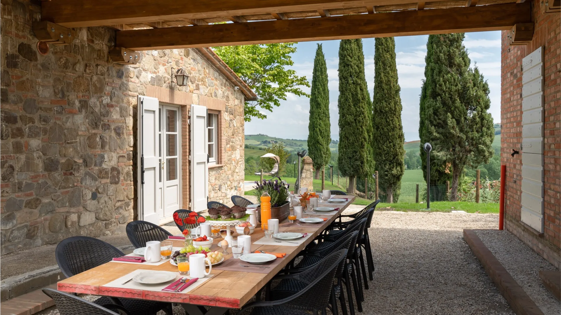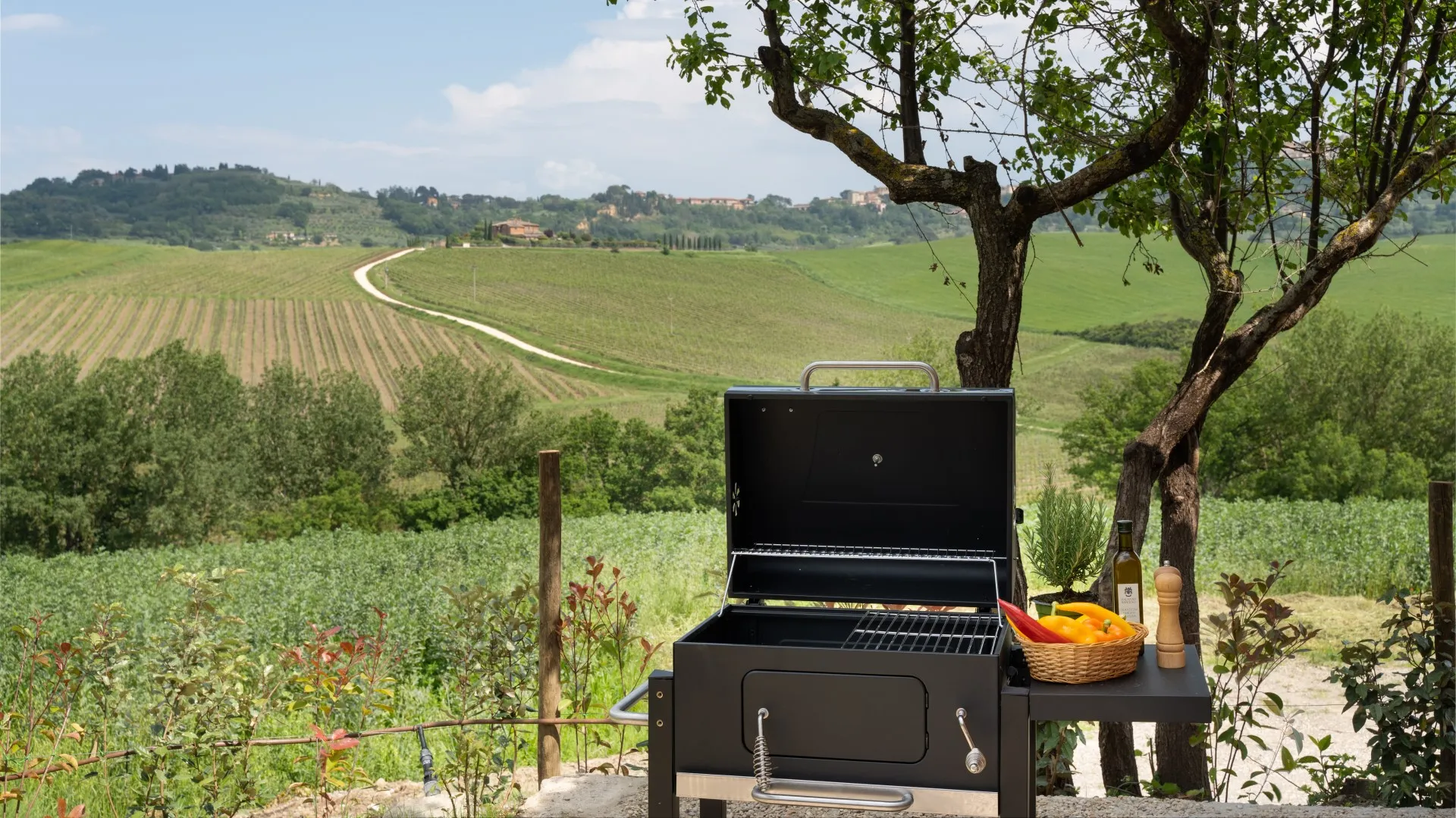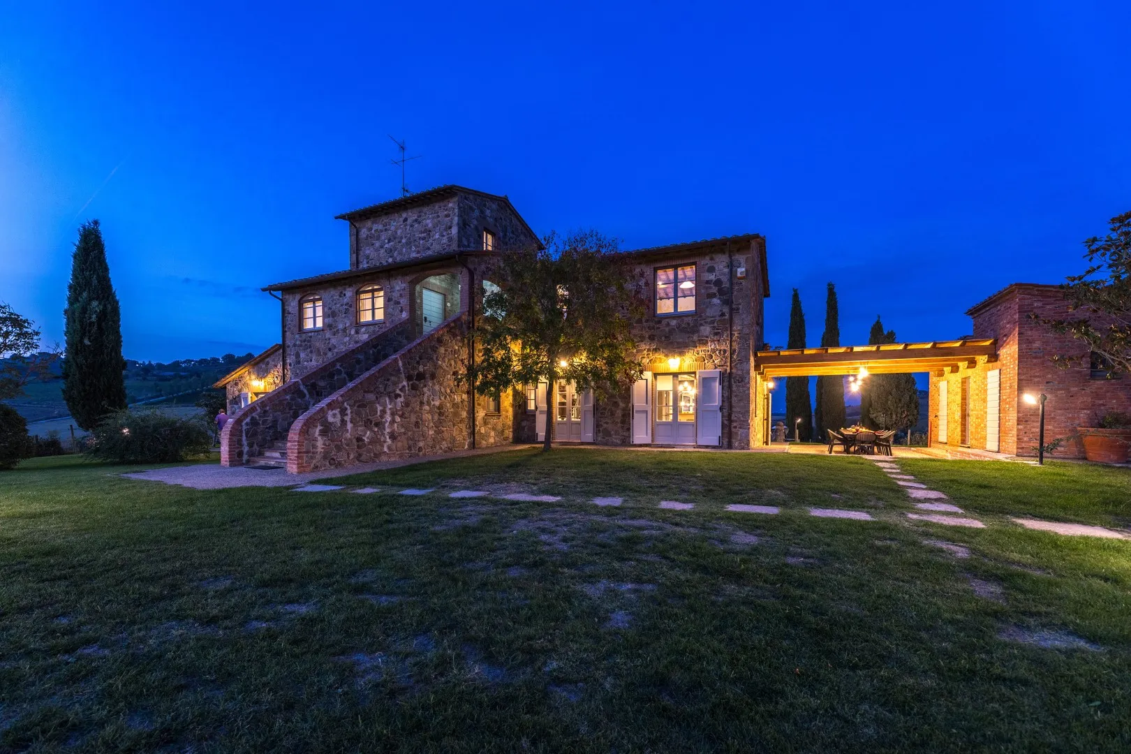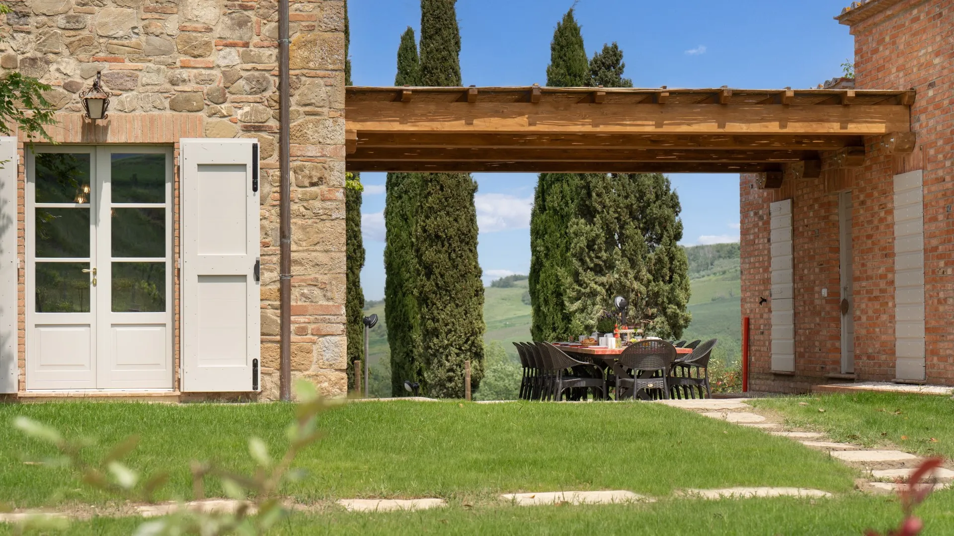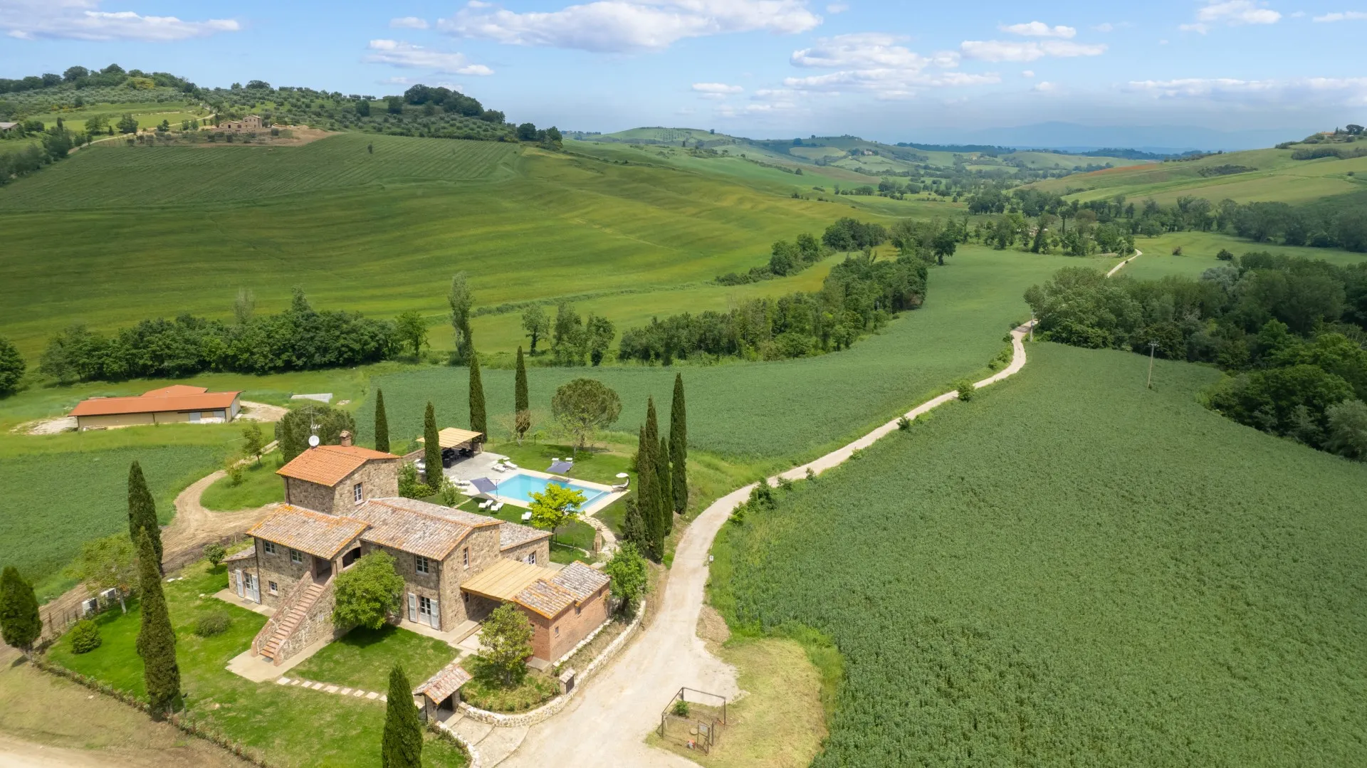 Das Anwesen erstreckt sich über etwa 15 Hektar nicht eingezäuntes Gelände mit Weinbergen und Ackerland. Der Teil um das Haus und das Schwimmbad (1800 m²) ist mit Rasen, Olivenbäumen, Steineichen und Zypressen, Rosmarin, Kräutern und Lorbeeren bewachsen. Der Essbereich im Freien, zwischen dem Esszimmer und dem Nebengebäude (für die private Nutzung des Anwesens), wird von einem natürlichen Schilfdach beschattet, das den landschaftlichen Gegebenheiten der Gegend entspricht; er wird vom gemauerten Grill bedient und befindet sich nur wenige Meter von der Küche entfernt neben dem Steinpflaster, das zum Schwimmbad führt. Eines der Schlafzimmer im Erdgeschoss hat einen direkten Ausgang zur Pergola, die auf den Pool ausgerichtet ist und eine Sitzecke im Freien bietet, wo die Gäste entspannende Aperitifs mit den toskanischen Hügeln im Hintergrund genießen können. Der Zugang zum Grundstück erfolgt über ein hölzernes Fußgängertor mit manueller Öffnung. Ein Freiluftparkplatz für 4 Autos befindet sich außerhalb des Grundstücks, wo zwei lokale Feldwege zusammenlaufen, die typisch für die Postkartenlandschaft der Hügel von Montepulciano sind. Die Waschküche befindet sich neben dem Parkplatz und ist von außen zugänglich. Im abfallenden Teil des Grundstücks befinden sich junge Olivenbäume, die gerade erst gepflanzt wurden, der Weinberg und die für die toskanische Hügellandschaft typischen Waldstücke. Die zahlreichen direkten Ausgänge zum Garten ermöglichen eine einfache Nutzung dieser exklusiven Residenz in einer der schönsten ländlichen Gegenden Italiens.Bitte beachten Sie, dass die Fotos im Frühling aufgenommen wurden, also in der Blütezeit der Blumen, und dass die Farben des Grases im Garten zum Zeitpunkt Ihrer Ankunft in der Villa anders sein können.