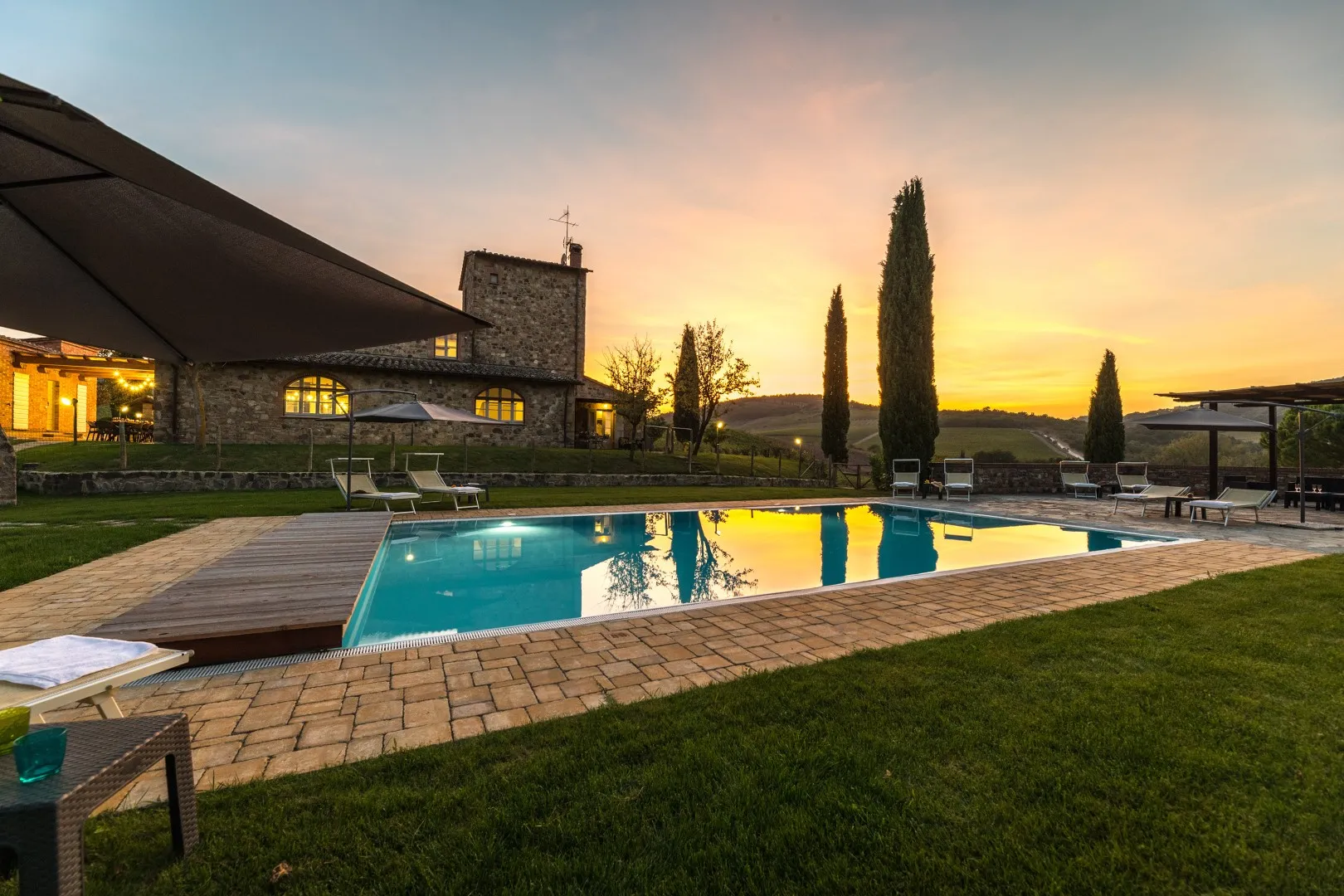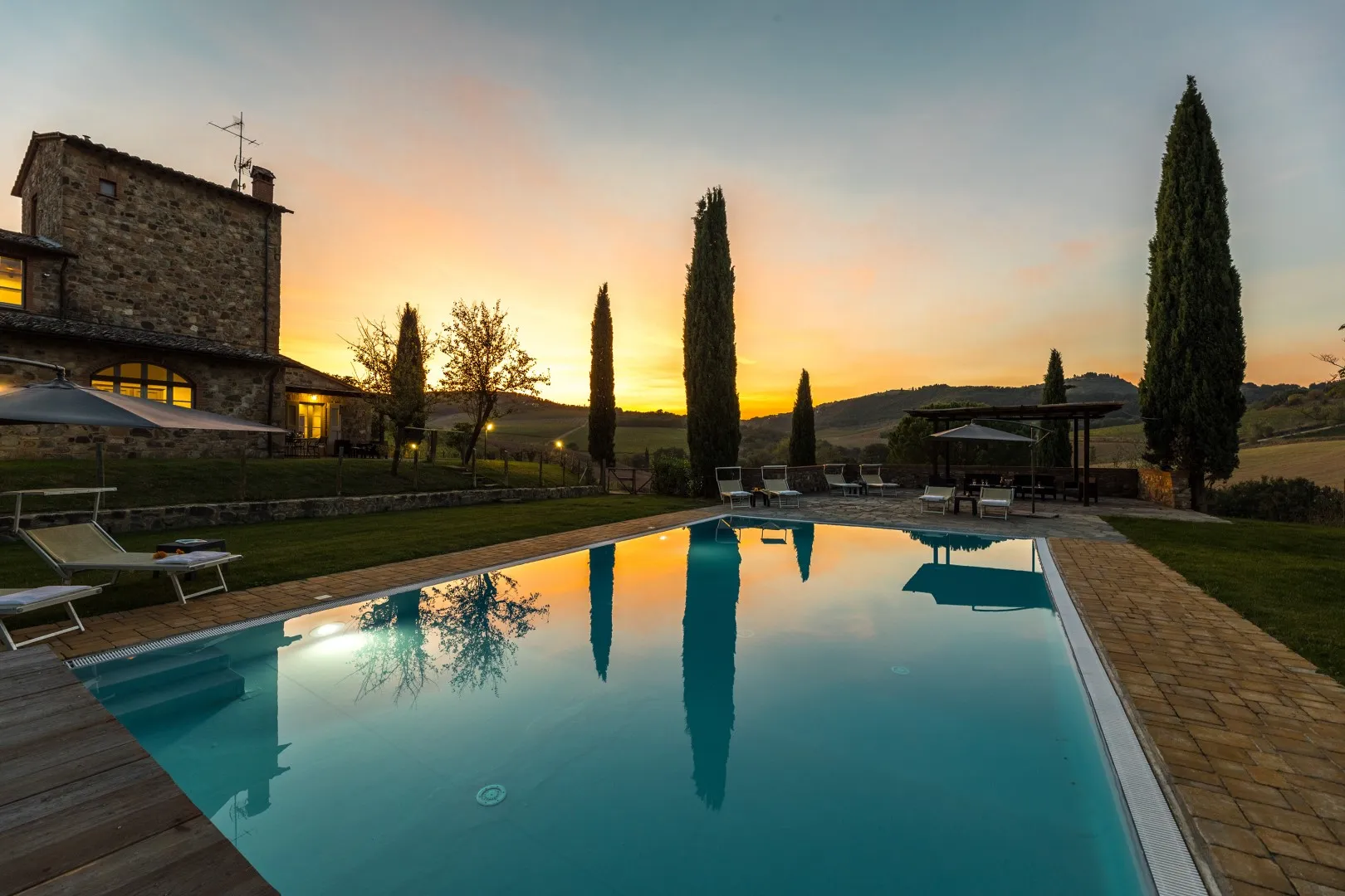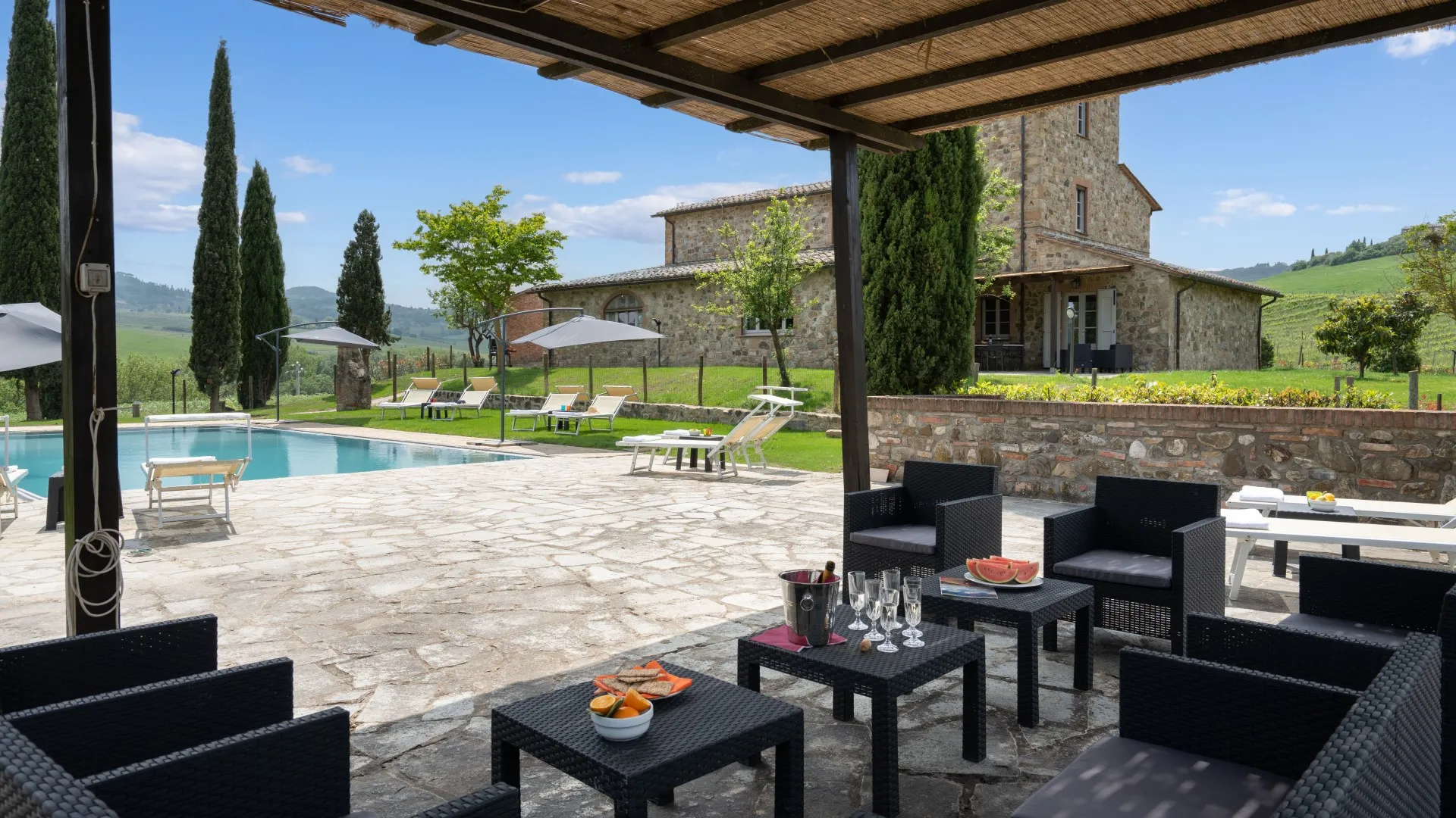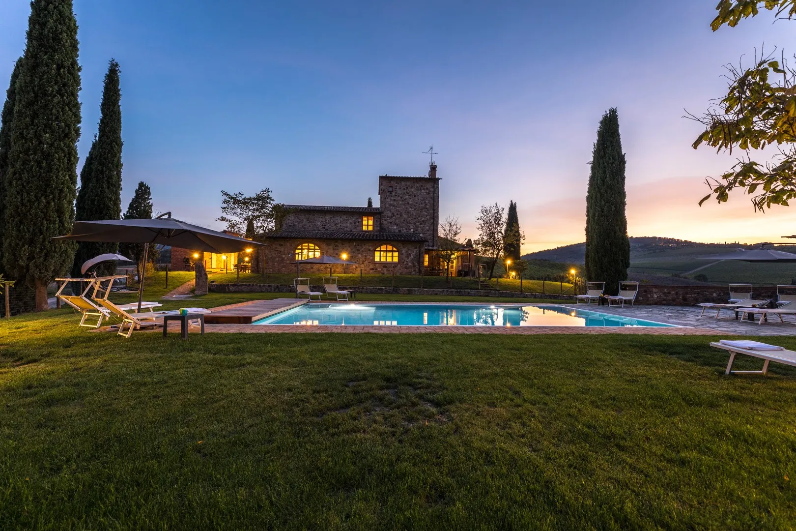 Das eingezäunte Schwimmbad liegt 15 m vom Haus entfernt, auf einer Terrasse, die etwas niedriger als das Erdgeschoss ist. Man erreicht ihn vom Essbereich im Freien aus über eine Pflasterung aus mattiertem Barberino-Stein und Ziegeln und über eine Reihe von Steinstufen vom Schlafzimmer mit Fenstertür aus. Der rechteckige Pool mit den Maßen 12 x 6 m und einer Tiefe von 0,90 bis 1,40 m ist mit perlgrauem PVC ausgekleidet und hat eine Umrandung aus porösem Stein, eine Chlorreinigung und zwei große Stufen für den Zugang zum Wasser. Die von Rasen umgebene Steinsonnenterrasse ist mit Sonnenliegen, Sonnenschirmen, kleinen Tischen und einer Pergola mit Sitzgelegenheiten im Freien ausgestattet. Es gibt eine Kaltwasserdusche und der Pool ist sowohl von innen als auch von außen mit Dämmerungslicht beleuchtet. Durch seine Lage im Südosten ist er immer der Sonne ausgesetzt und bietet einen entspannenden und romantischen Blick auf die umliegenden Weinberge. Der Pool steht den Gästen vom letzten Samstag im April bis zum ersten Samstag im Oktober zur Verfügung.