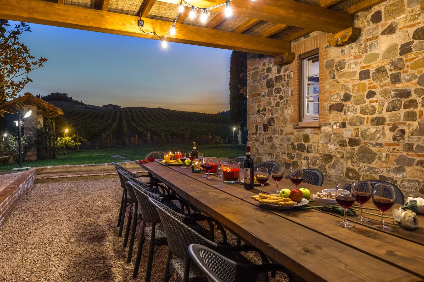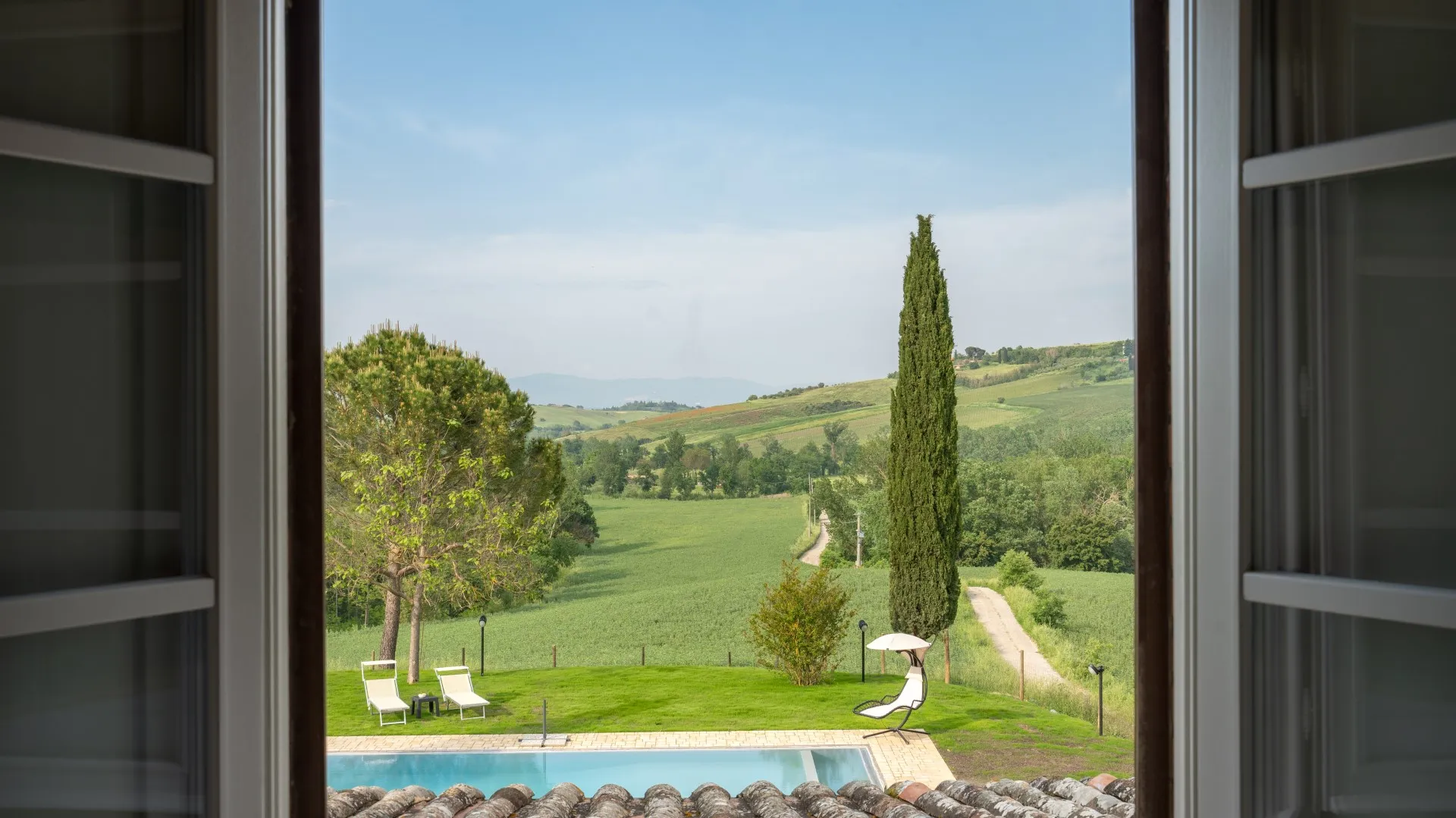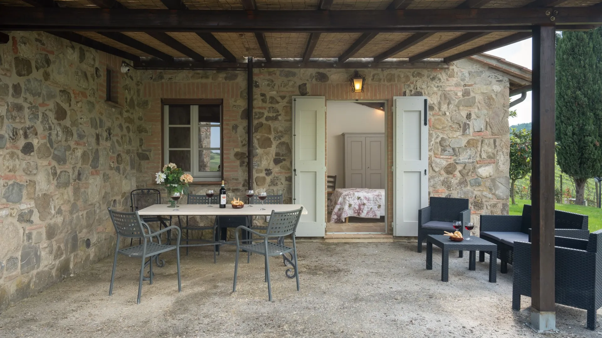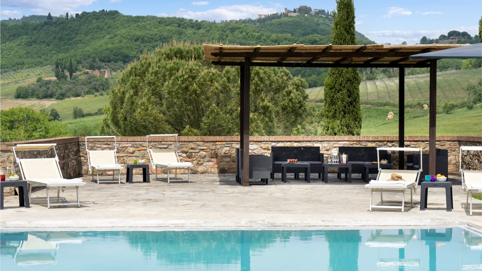 Das eingezäunte Schwimmbad liegt 15 m vom Haus entfernt, auf einer Terrasse, die etwas niedriger als das Erdgeschoss ist. Man erreicht ihn vom Essbereich im Freien aus über eine Pflasterung aus mattiertem Barberino-Stein und Ziegeln und über eine Reihe von Steinstufen vom Schlafzimmer mit Fenstertür aus. Der rechteckige Pool mit den Maßen 12 x 6 m und einer Tiefe von 0,90 bis 1,40 m ist mit perlgrauem PVC ausgekleidet und hat eine Umrandung aus porösem Stein, eine Chlorreinigung und zwei große Stufen für den Zugang zum Wasser. Die von Rasen umgebene Steinsonnenterrasse ist mit Sonnenliegen, Sonnenschirmen, kleinen Tischen und einer Pergola mit Sitzgelegenheiten im Freien ausgestattet. Es gibt eine Kaltwasserdusche und der Pool ist sowohl von innen als auch von außen mit Dämmerungslicht beleuchtet. Durch seine Lage im Südosten ist er immer der Sonne ausgesetzt und bietet einen entspannenden und romantischen Blick auf die umliegenden Weinberge. Der Pool steht den Gästen vom letzten Samstag im April bis zum ersten Samstag im Oktober zur Verfügung.