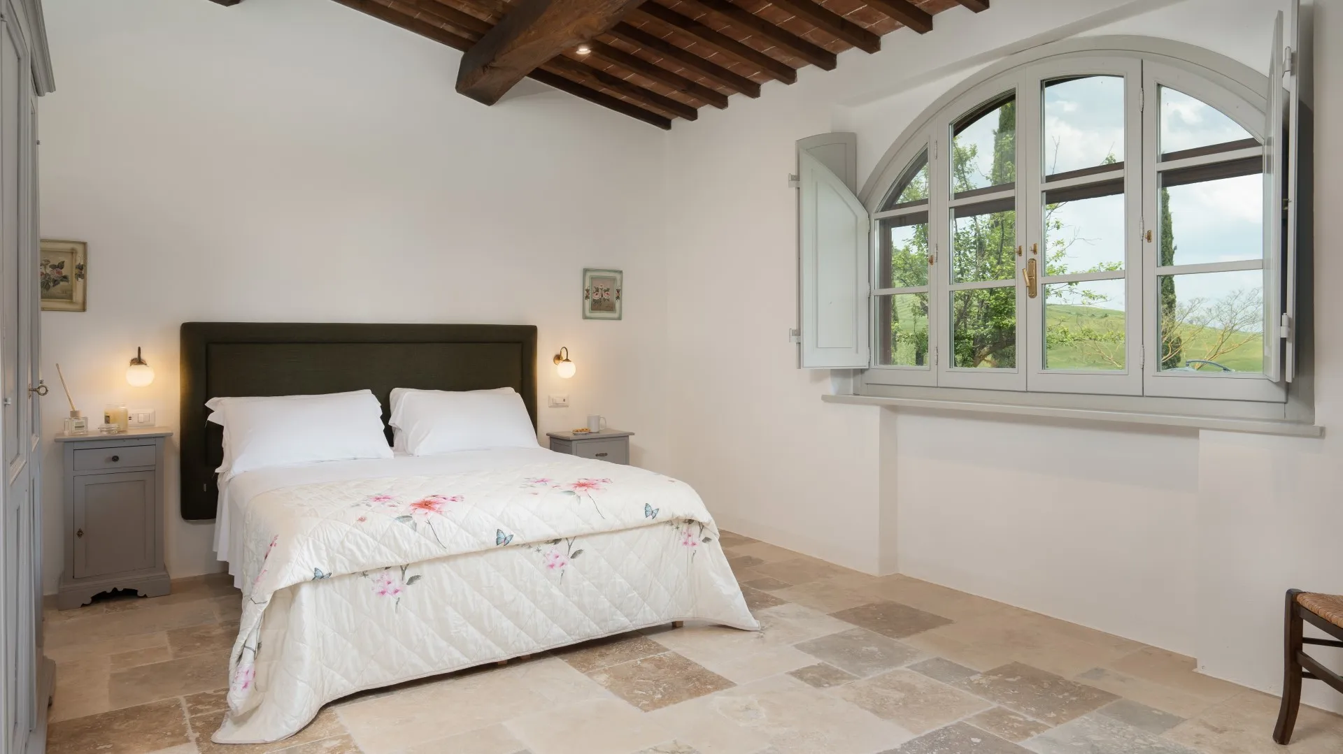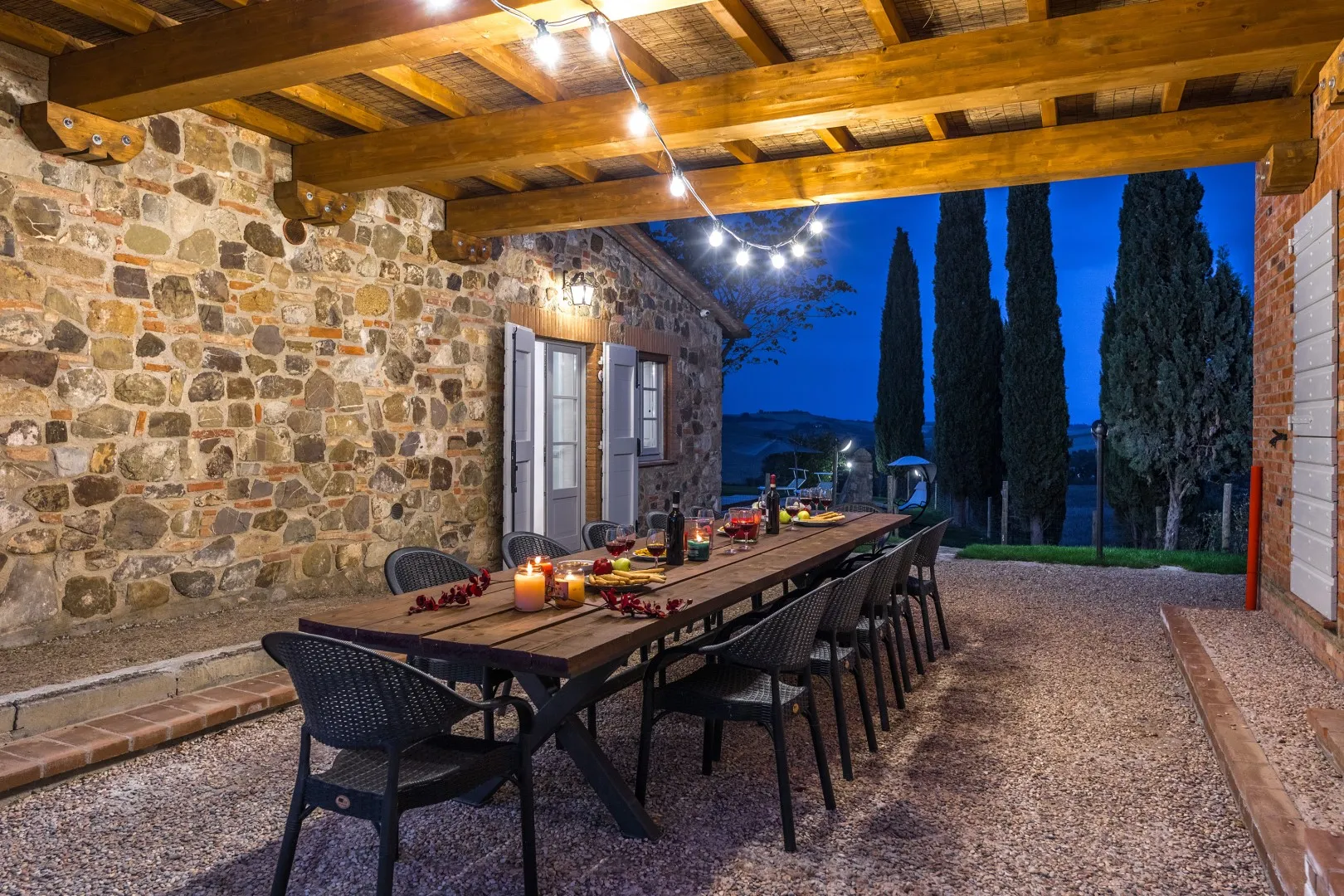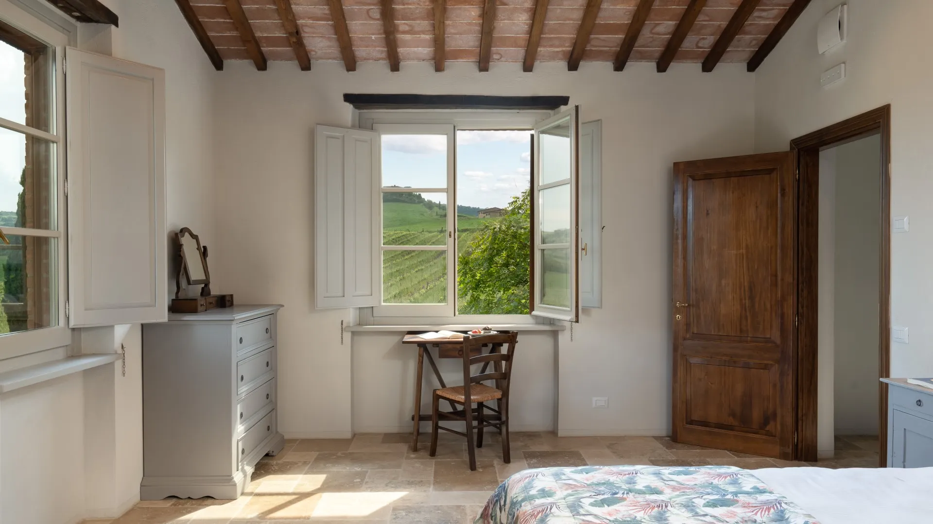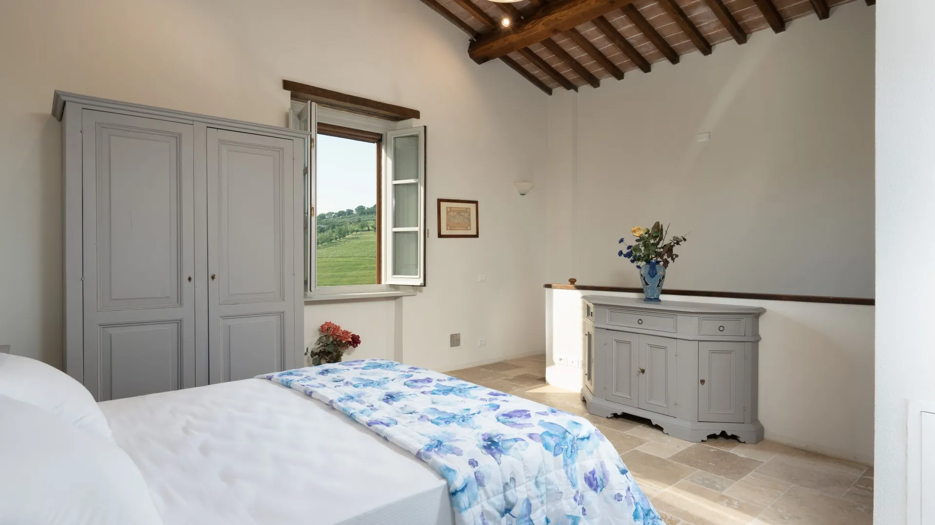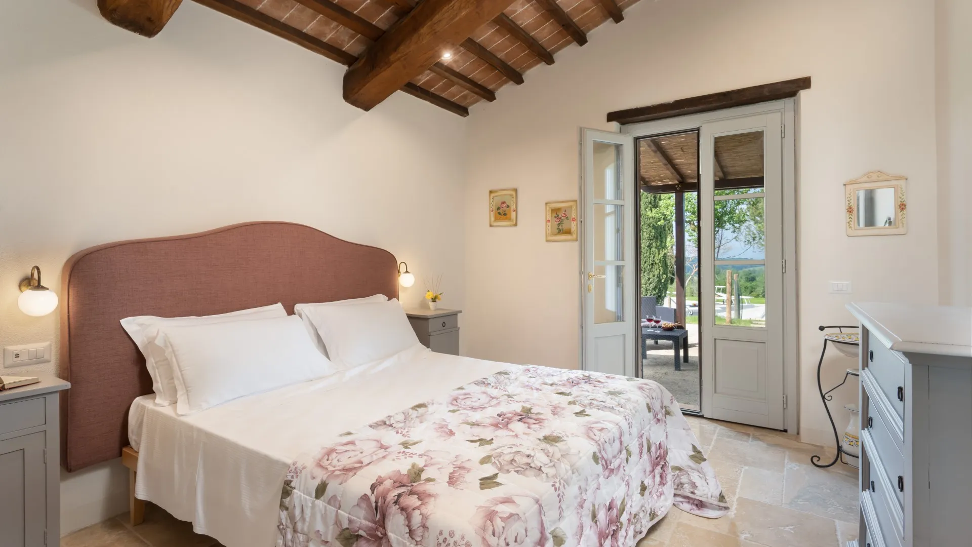 Das eingezäunte Schwimmbad liegt 15 m vom Haus entfernt, auf einer Terrasse, die etwas niedriger als das Erdgeschoss ist. Man erreicht ihn vom Essbereich im Freien aus über eine Pflasterung aus mattiertem Barberino-Stein und Ziegeln und über eine Reihe von Steinstufen vom Schlafzimmer mit Fenstertür aus. Der rechteckige Pool mit den Maßen 12 x 6 m und einer Tiefe von 0,90 bis 1,40 m ist mit perlgrauem PVC ausgekleidet und hat eine Umrandung aus porösem Stein, eine Chlorreinigung und zwei große Stufen für den Zugang zum Wasser. Die von Rasen umgebene Steinsonnenterrasse ist mit Sonnenliegen, Sonnenschirmen, kleinen Tischen und einer Pergola mit Sitzgelegenheiten im Freien ausgestattet. Es gibt eine Kaltwasserdusche und der Pool ist sowohl von innen als auch von außen mit Dämmerungslicht beleuchtet. Durch seine Lage im Südosten ist er immer der Sonne ausgesetzt und bietet einen entspannenden und romantischen Blick auf die umliegenden Weinberge. Der Pool steht den Gästen vom letzten Samstag im April bis zum ersten Samstag im Oktober zur Verfügung.