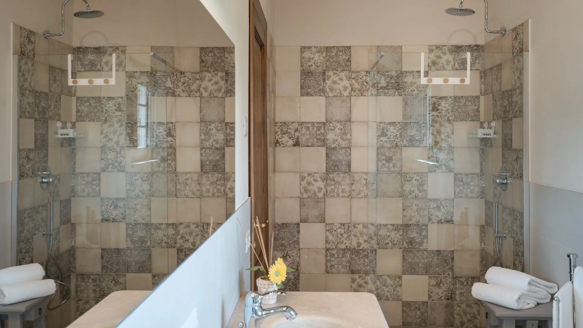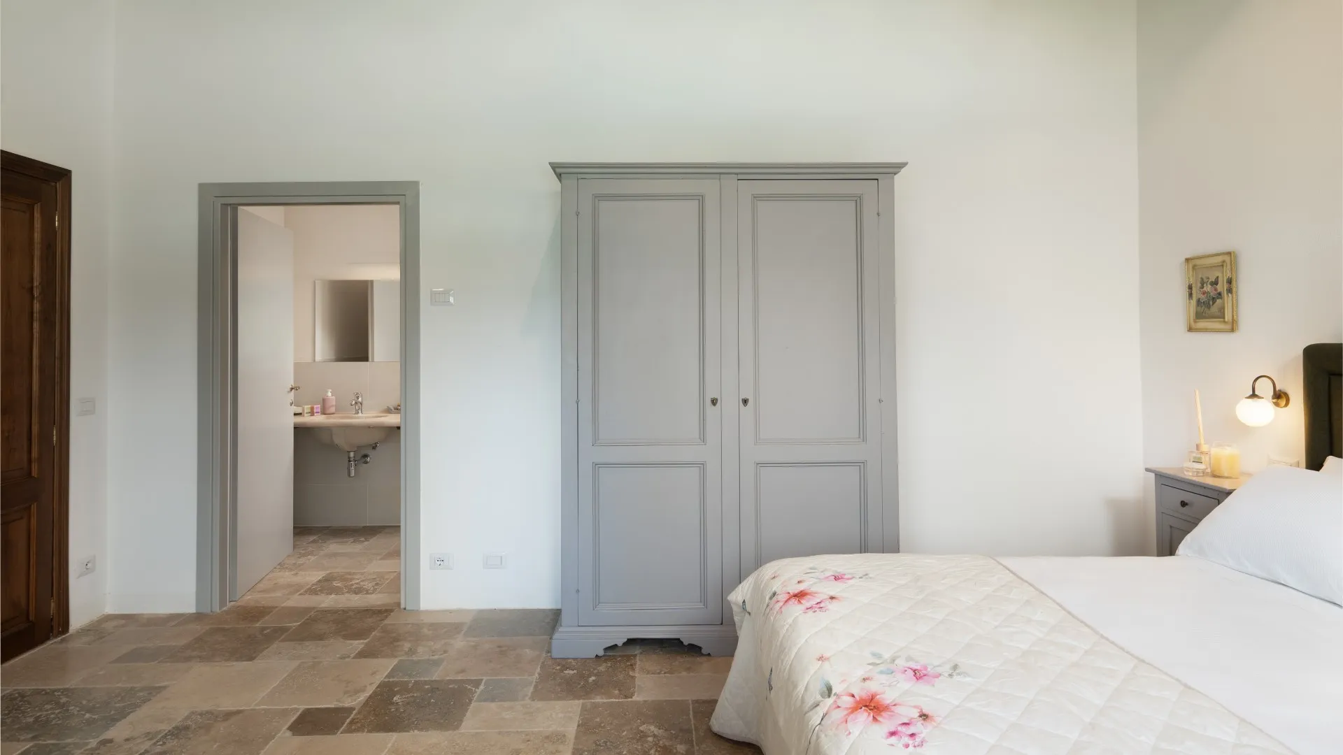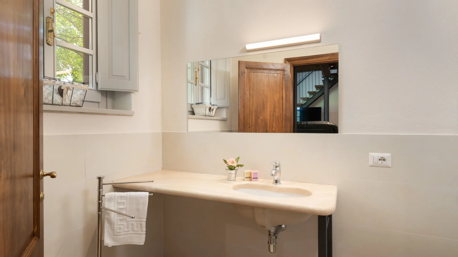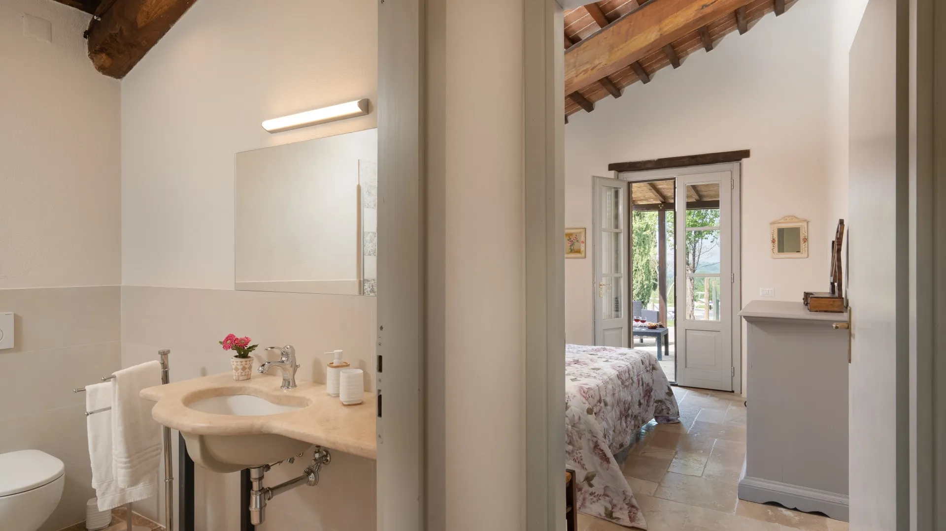 Das eingezäunte Schwimmbad liegt 15 m vom Haus entfernt, auf einer Terrasse, die etwas niedriger als das Erdgeschoss ist. Man erreicht ihn vom Essbereich im Freien aus über eine Pflasterung aus mattiertem Barberino-Stein und Ziegeln und über eine Reihe von Steinstufen vom Schlafzimmer mit Fenstertür aus. Der rechteckige Pool mit den Maßen 12 x 6 m und einer Tiefe von 0,90 bis 1,40 m ist mit perlgrauem PVC ausgekleidet und hat eine Umrandung aus porösem Stein, eine Chlorreinigung und zwei große Stufen für den Zugang zum Wasser. Die von Rasen umgebene Steinsonnenterrasse ist mit Sonnenliegen, Sonnenschirmen, kleinen Tischen und einer Pergola mit Sitzgelegenheiten im Freien ausgestattet. Es gibt eine Kaltwasserdusche und der Pool ist sowohl von innen als auch von außen mit Dämmerungslicht beleuchtet. Durch seine Lage im Südosten ist er immer der Sonne ausgesetzt und bietet einen entspannenden und romantischen Blick auf die umliegenden Weinberge. Der Pool steht den Gästen vom letzten Samstag im April bis zum ersten Samstag im Oktober zur Verfügung.