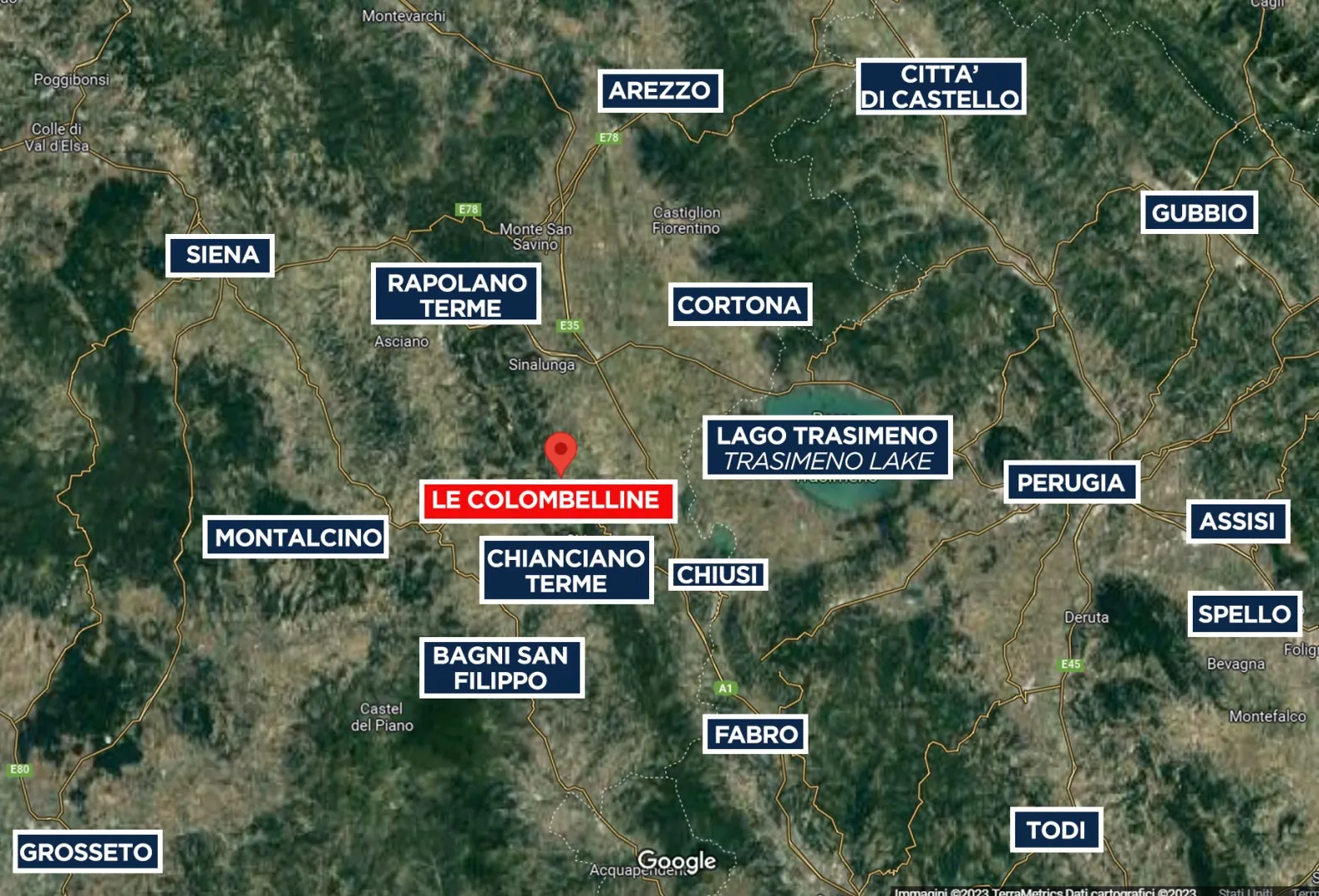 Flughafen: Rom 206 km, Florenz 129 km, Perugia 70 km, Pisa 192 km, Mailand 466 km