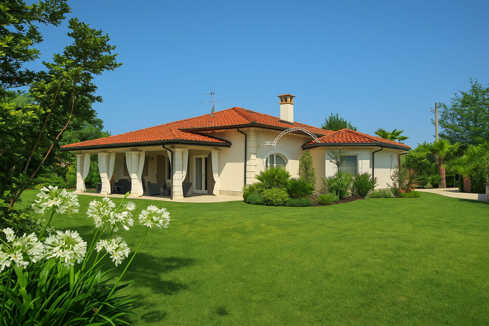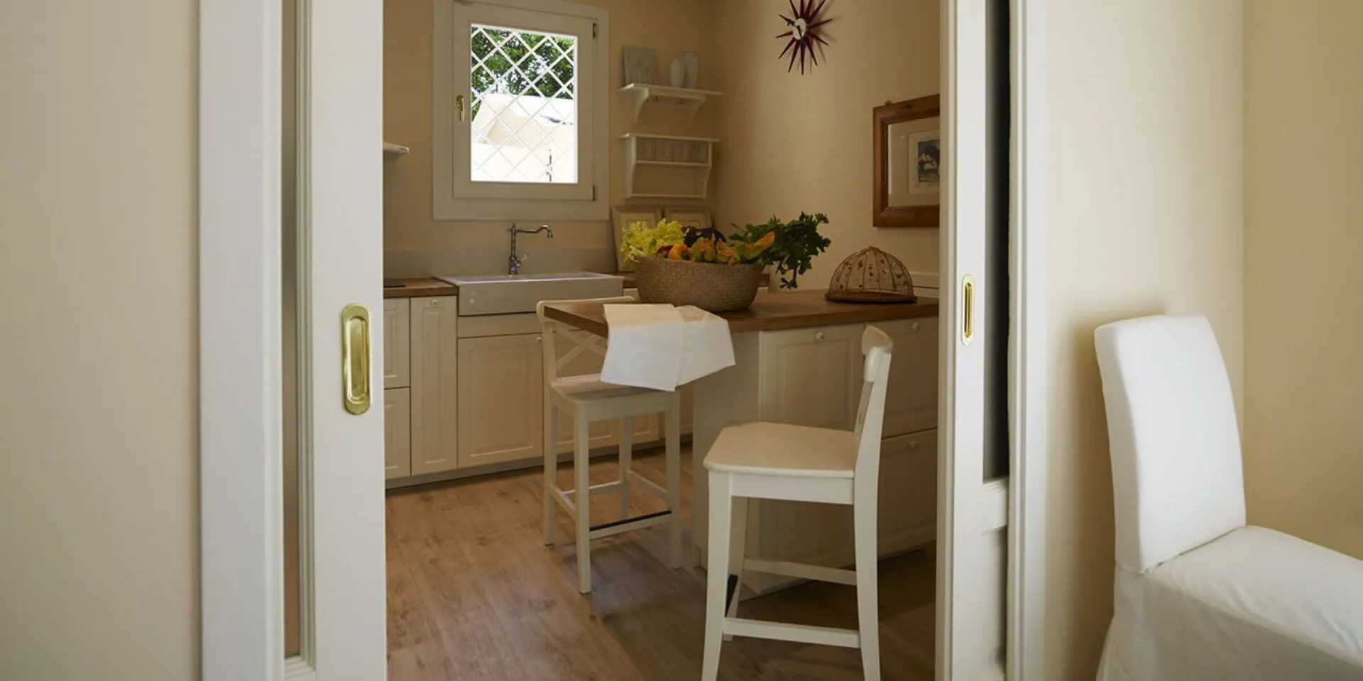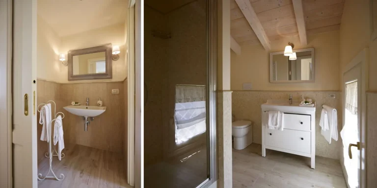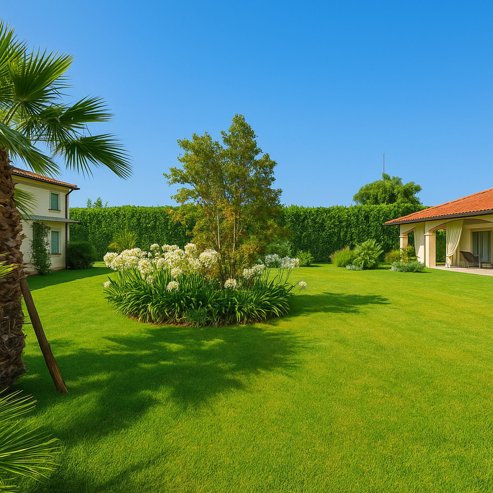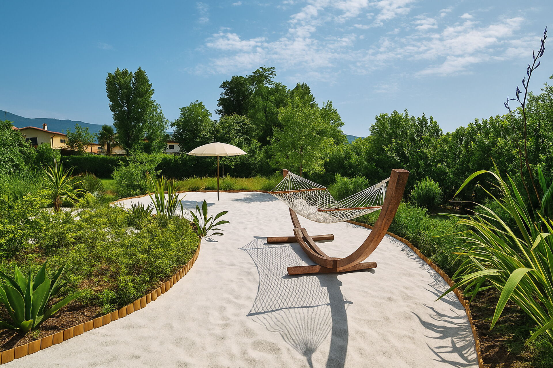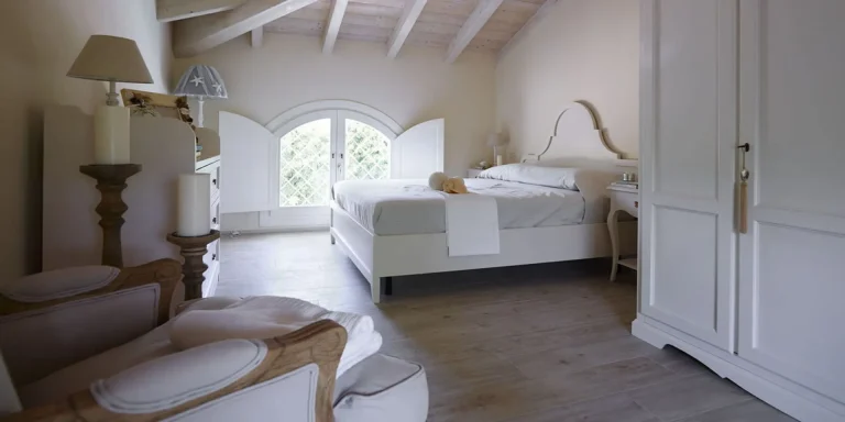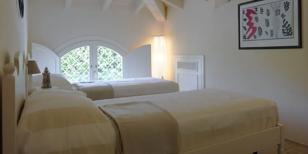 Designed to host up to 18 people, the two villas are connected by a wide green space that guarantees both privacy and conviviality. At the heart of the property is a large wooden loggia with exposed beams—a true outdoor living room featuring cozy sofas, armchairs, and a dining area—ideal for enjoying moments of pure relaxation in the shade or under the stars.