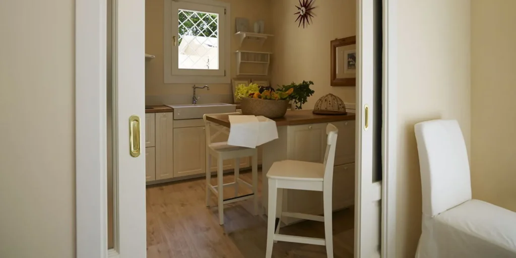 Kitchen: six dining tables, dishwasher, fridge, stove top, oven, american coffee machine, WIFI internet, air conditioning, smoke detector, co2 detector, exit to the patio.