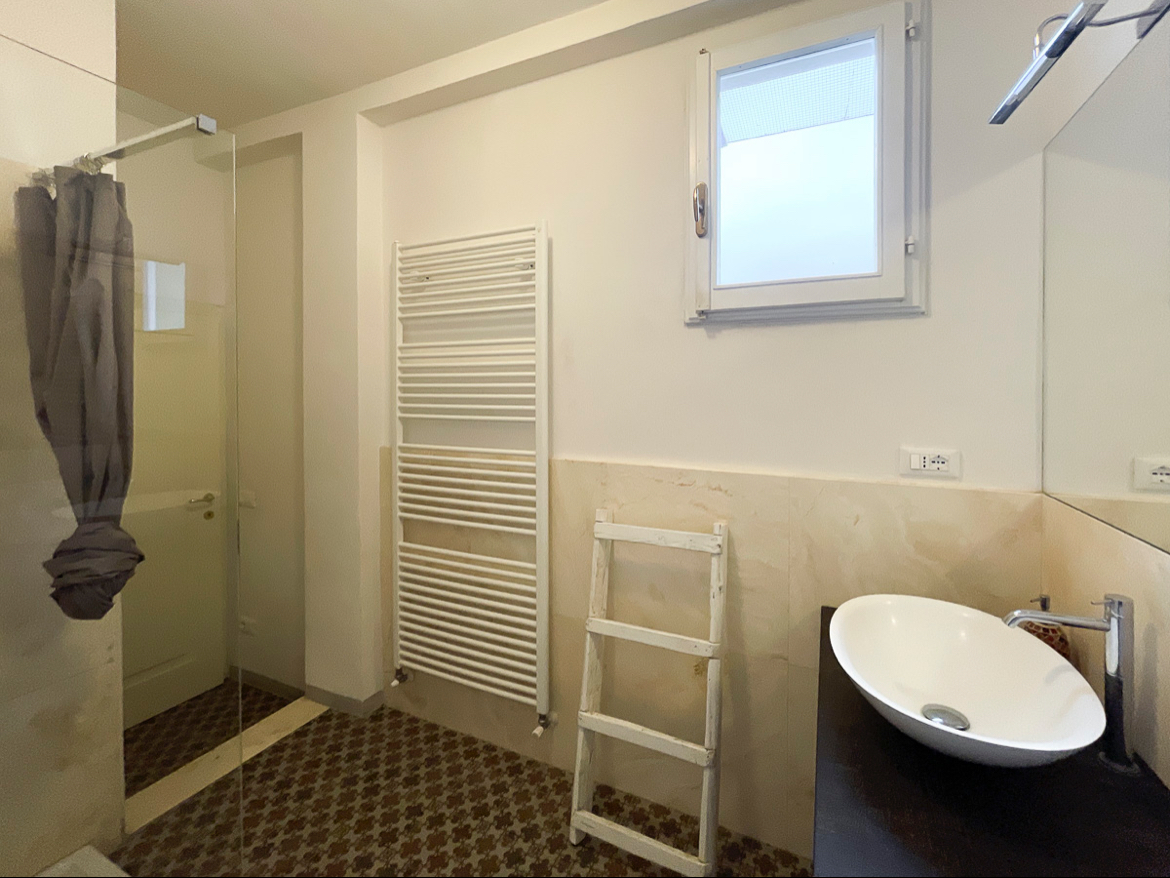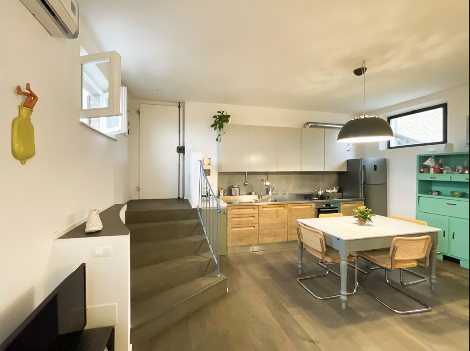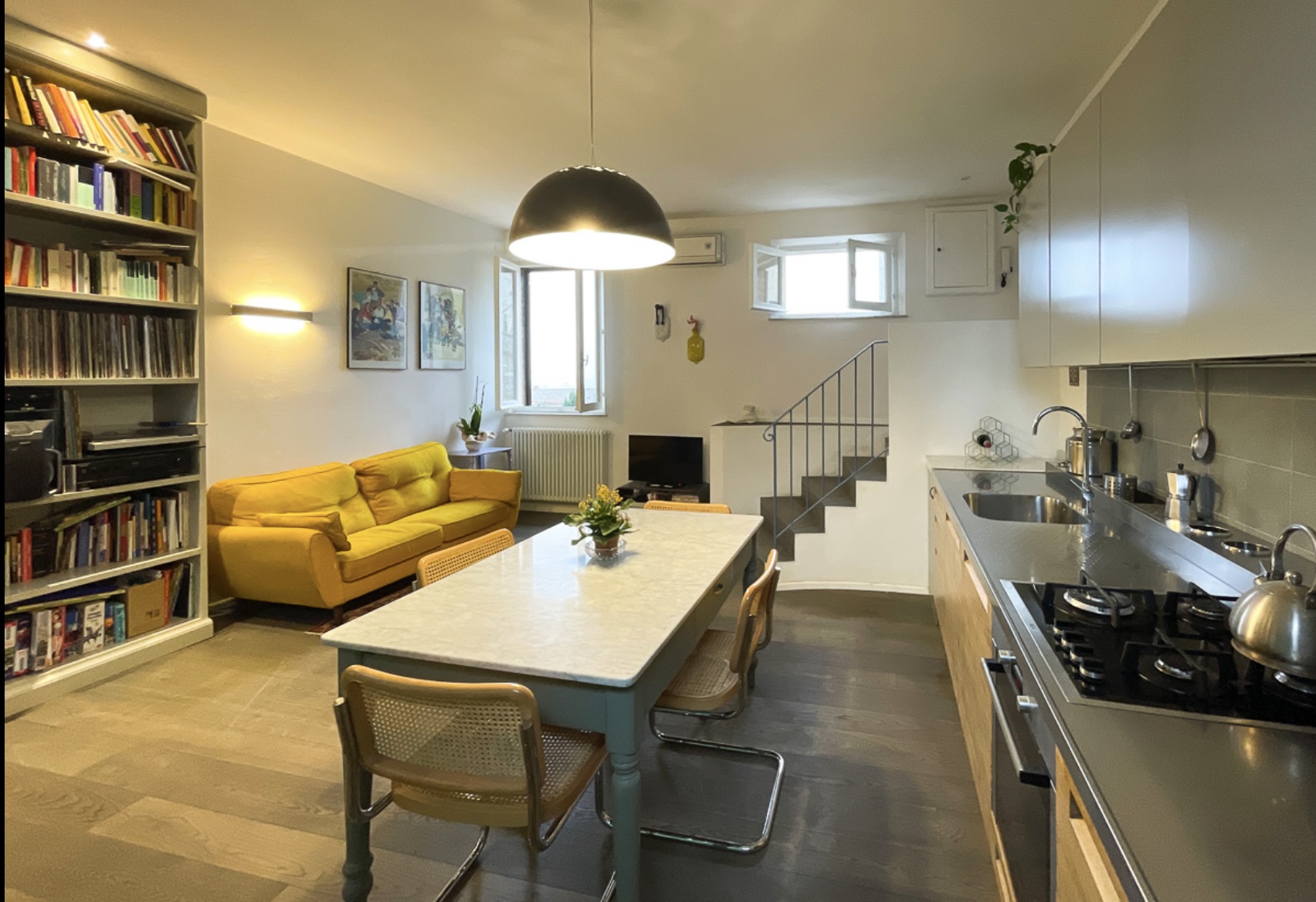 Der Zugang zur Wohnung erfolgt über eine breite, elegante Originaltreppe aus Stein, der ein typischer mittelalterlicher Innenhof vorgelagert ist. Die Eingangstür öffnet sich zu einem geräumigen Wohnzimmer mit vier großen Fenstern. Von hier aus führt ein Korridor zum Schlafbereich, der Folgendes umfasst zwei Schlafzimmer, a Badezimmer mit Fensterund eine kleiner Hauswirtschaftsraum.