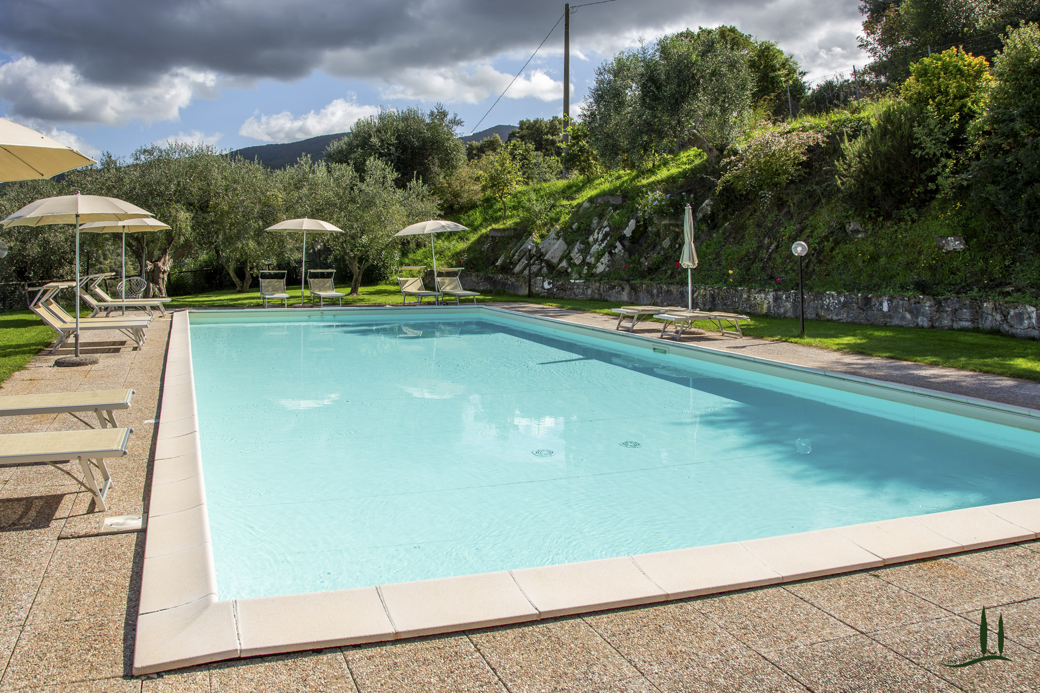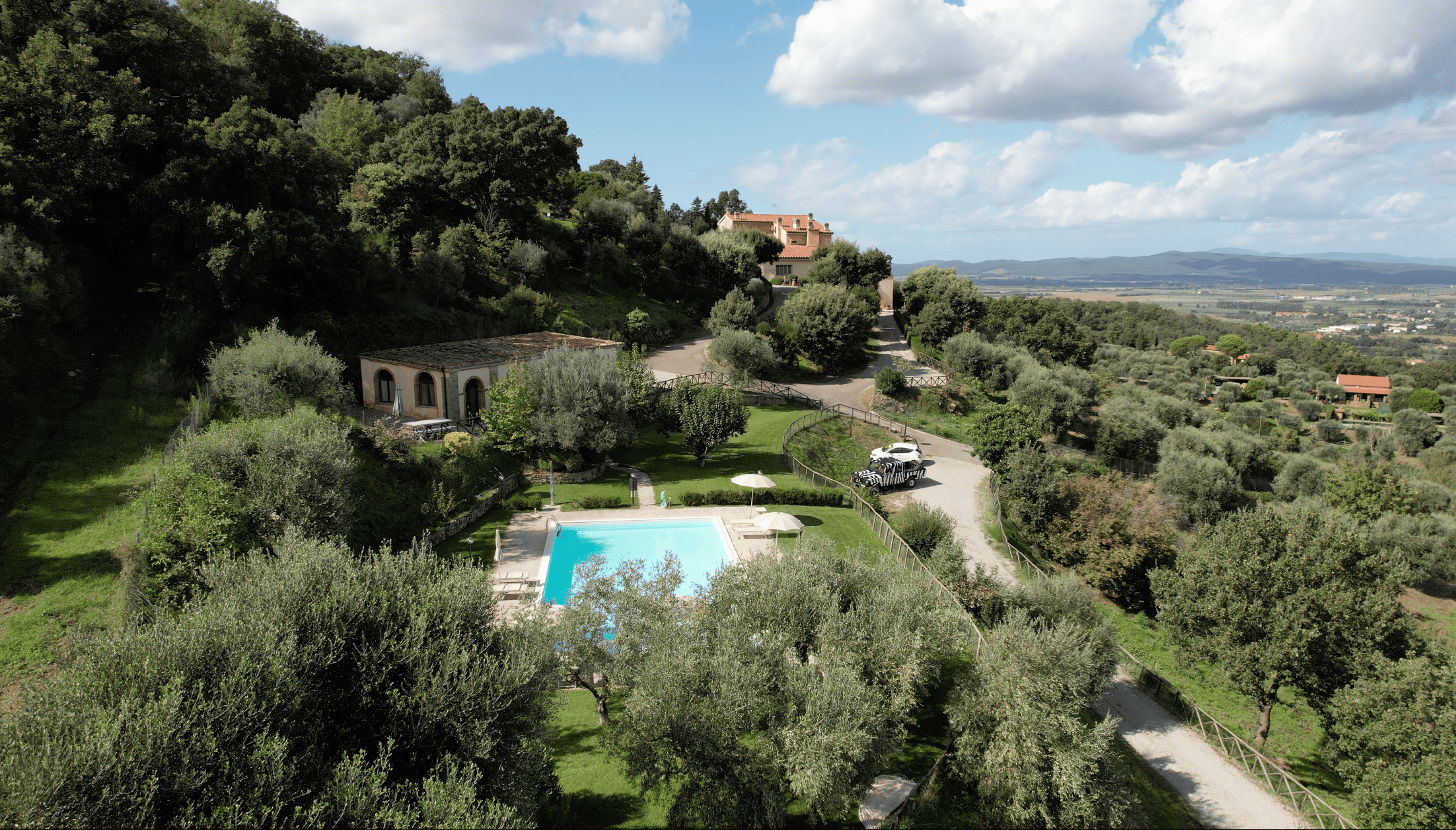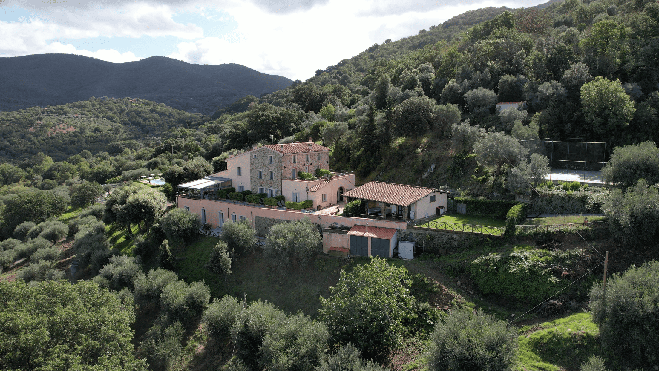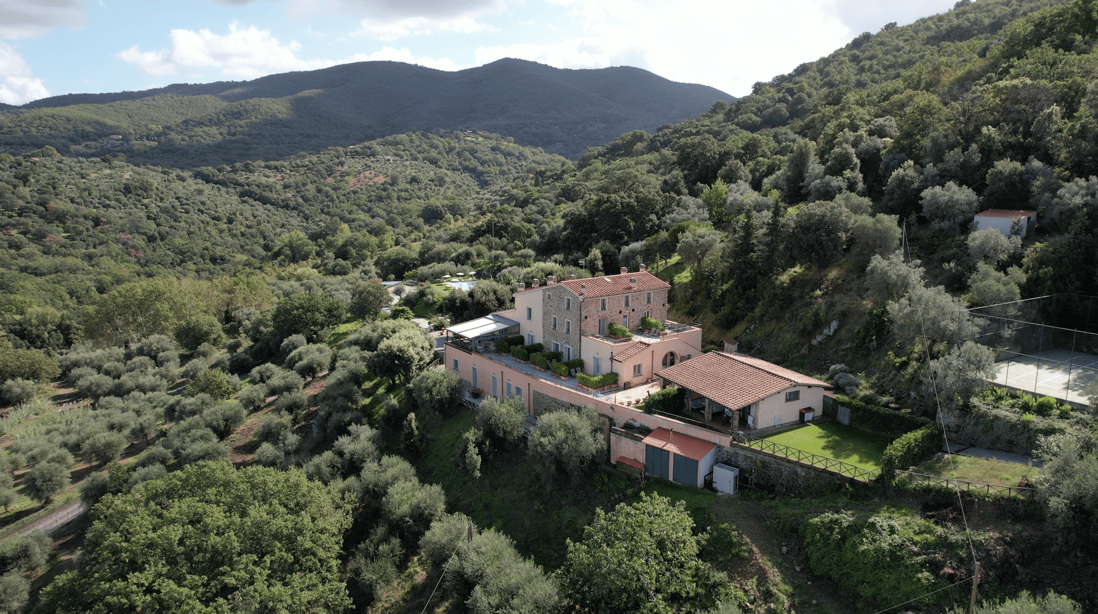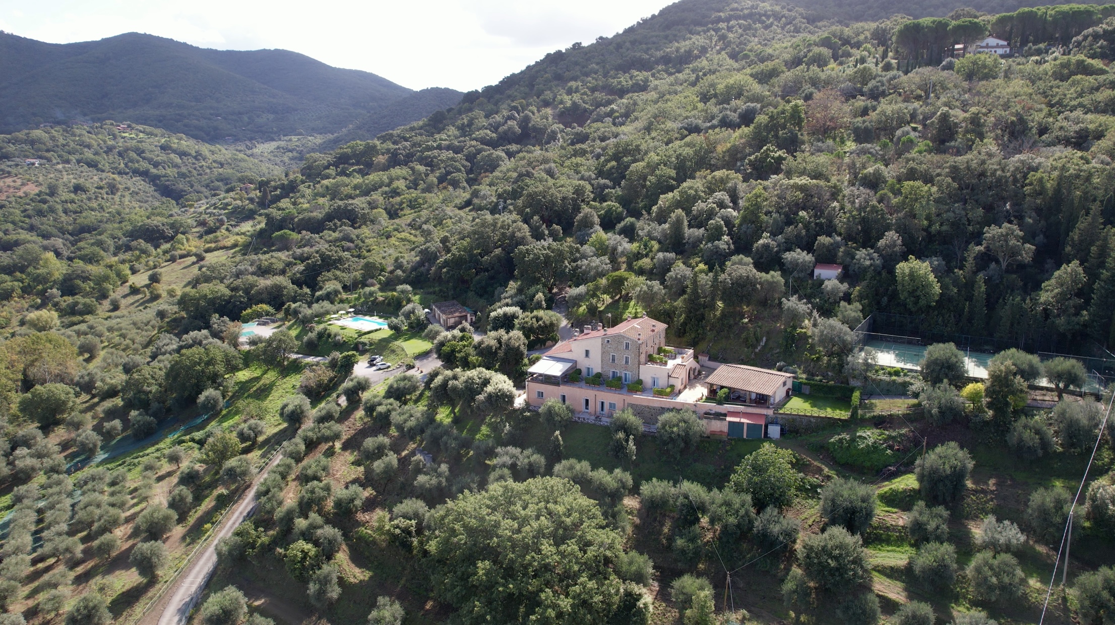 Das Anwesen ist so konzipiert, dass es das ganze Jahr über Komfort und Wohlbefinden bietet. Es verfügt über einen 100 m² großen, automatisierten Swimmingpool mit Panoramablick, der von einem englischen Rasen mit freiem Blick auf die sanften Hügel umgeben ist, sowie über einen privaten, umzäunten Tennisplatz, der auch für Fußball und Basketball geeignet ist.
