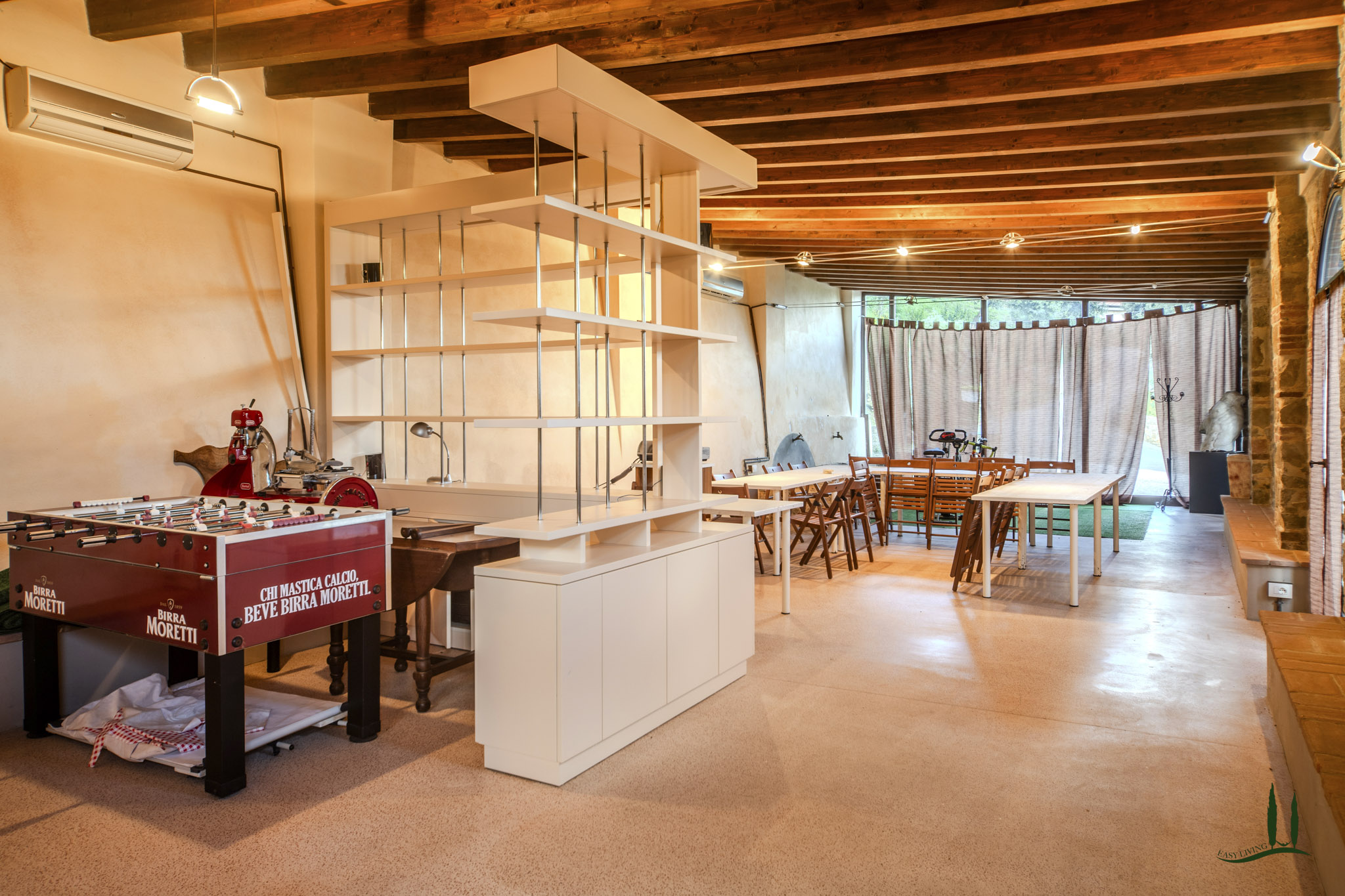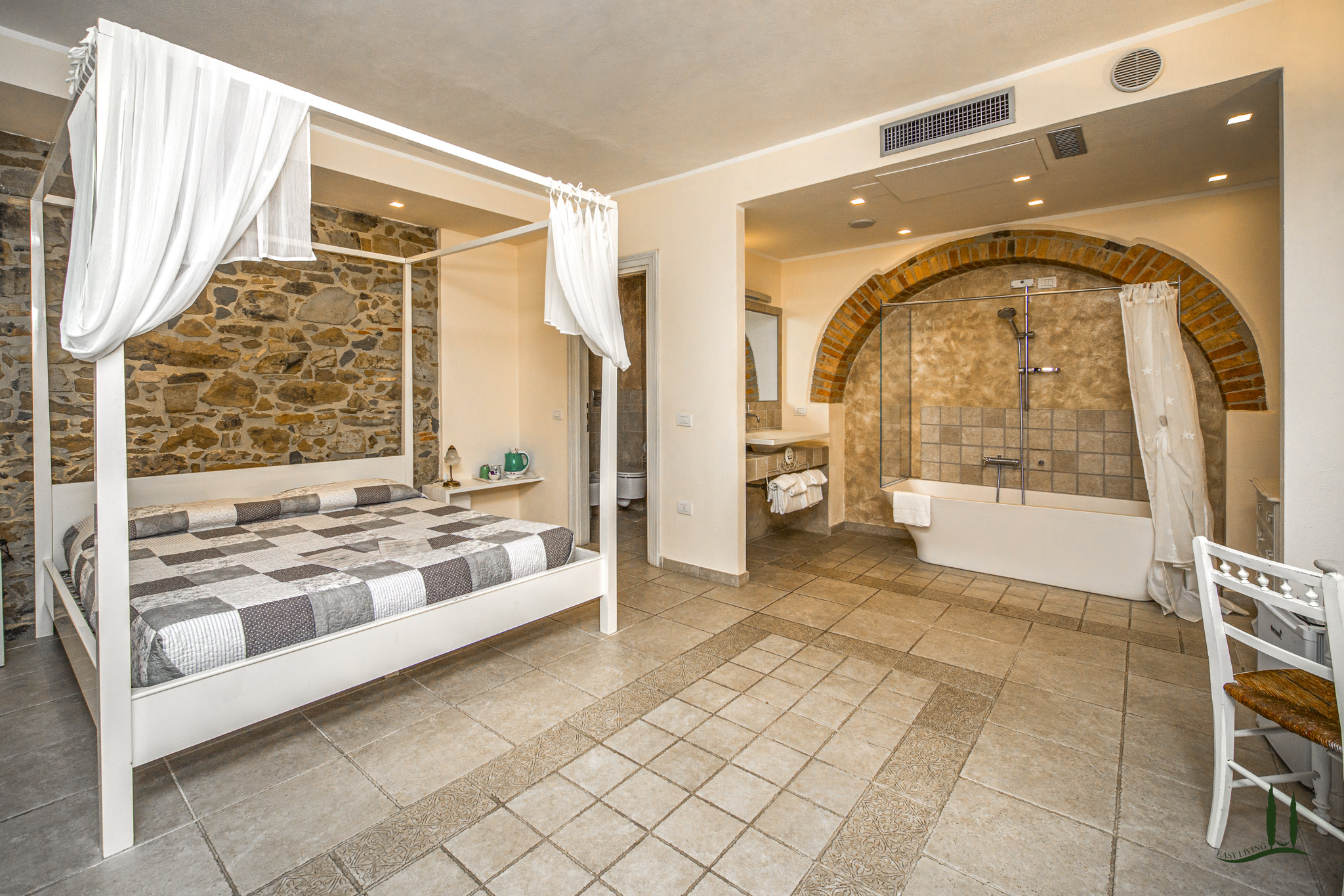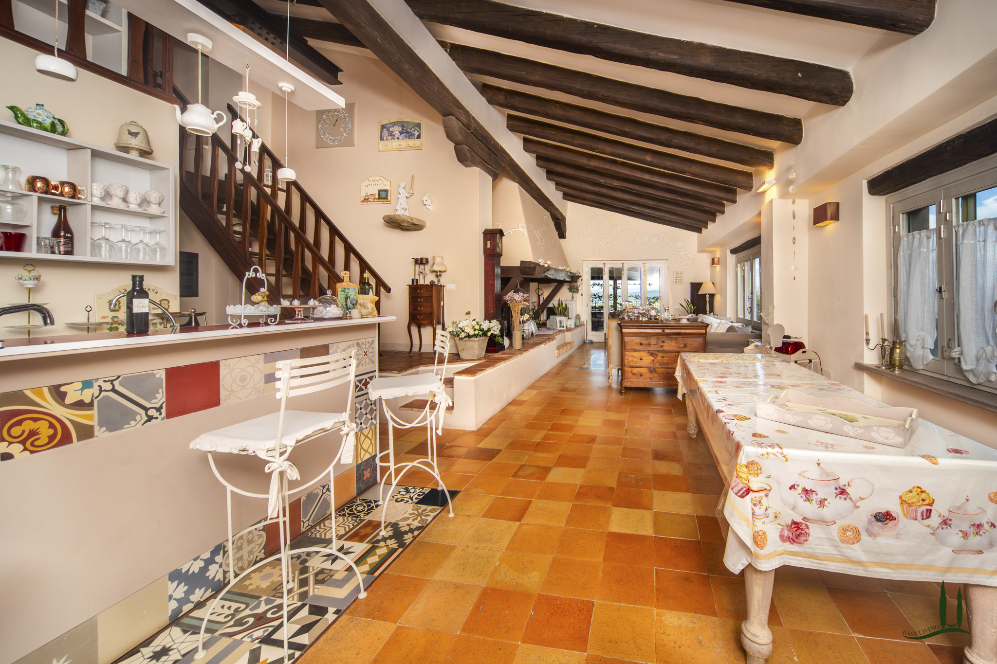 Das Haupthaus, das sich über vier Etagen erstreckt, beherbergt die Wohnung des Eigentümers mit 23 Zimmern, darunter 10 Schlafzimmer, 9 Bäder, 1 Küche, eine Barecke, ein Zwischengeschoss und ein großes Wohnzimmer, das von einem majestätischen antiken Kamin beherrscht wird. Von hier aus gelangt man auf eine 150 m² große Panoramaterrasse, von der 35 m² durch eine modulare, beheizbare Spannstruktur überdacht sind, sowie auf eine zweite Terrasse von 63 m², die sowohl vom Innenhof als auch vom ersten Stock aus zugänglich ist.