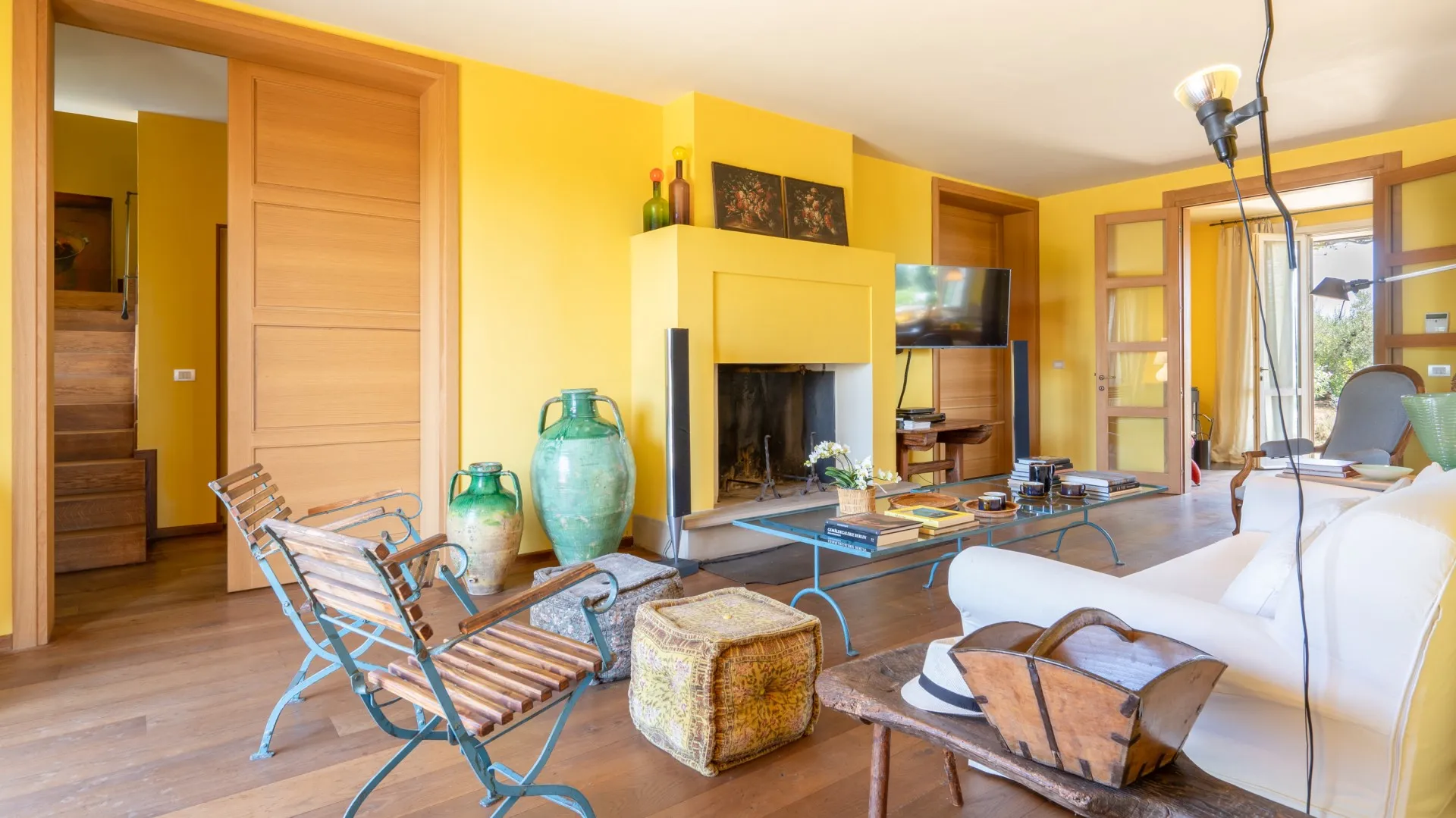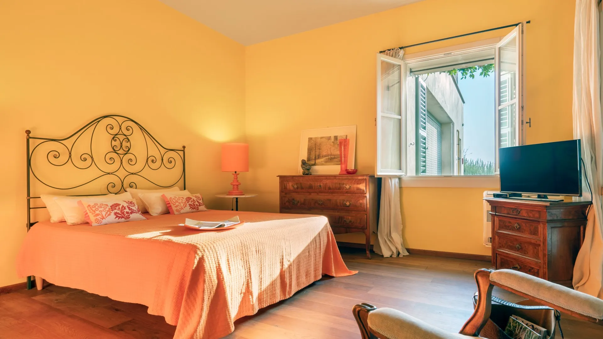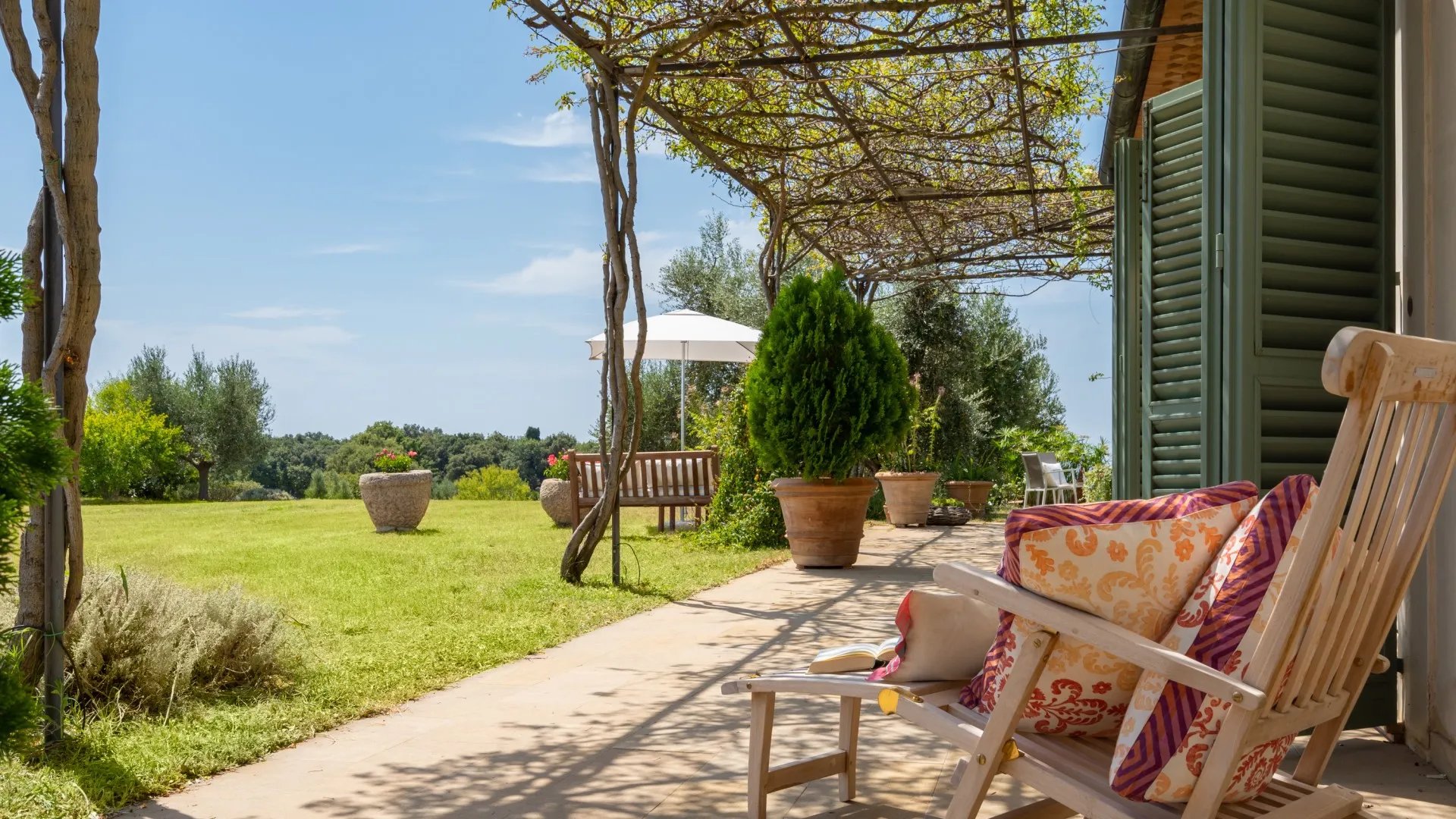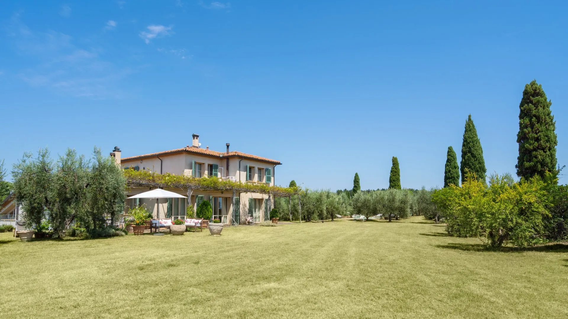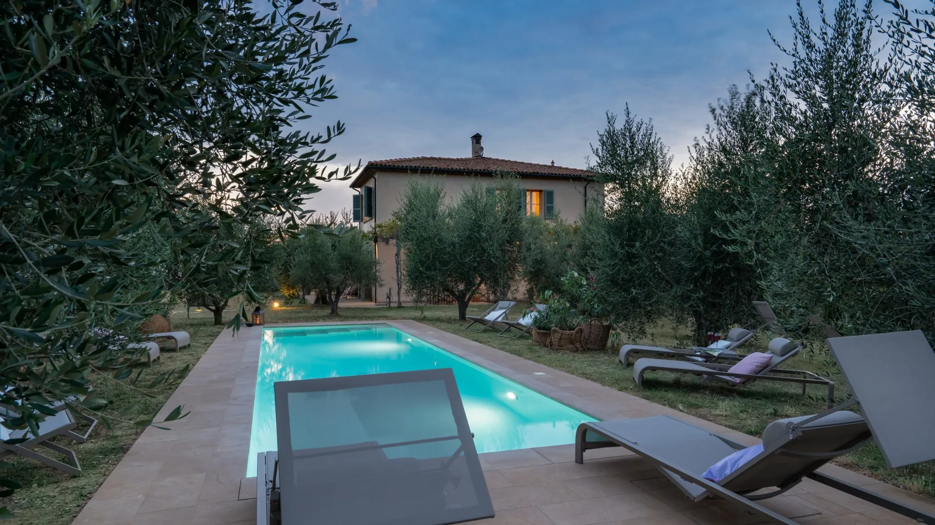 The rectangular swimming pool, measuring 11 x 3 m, is located just a few metres from the house, hidden from it and surrounded by olive trees that guarantee the privacy for those using it and maintain peace and quiet for those who decide to remain in the house. Ht is reached across the lawn and is purified with ozone. The solarium terrace, approximately 23 sq m , is equipped with sunbeds, deck chairs and umbrellas so that you can fully enjoy this exclusive area. The pool is open from the last Saturday of April until the first Saturday of October.