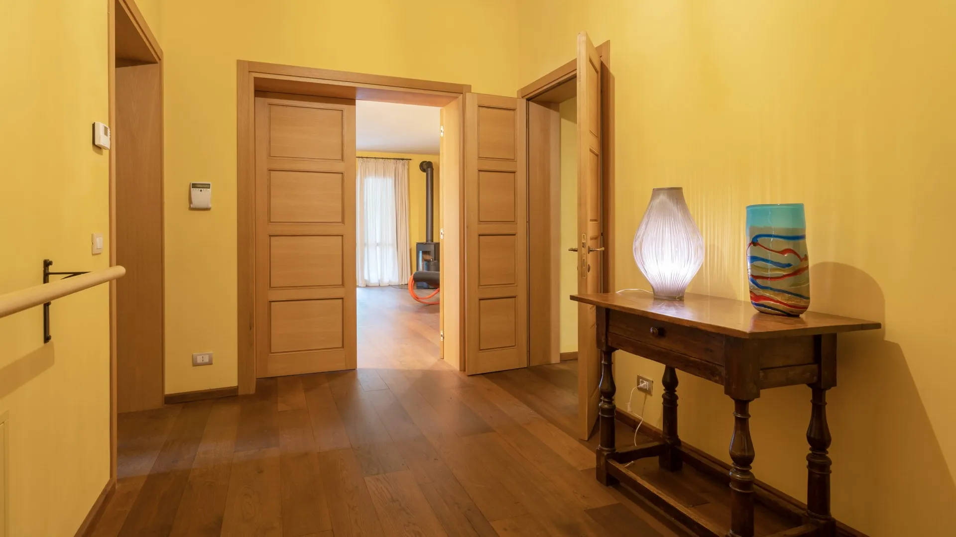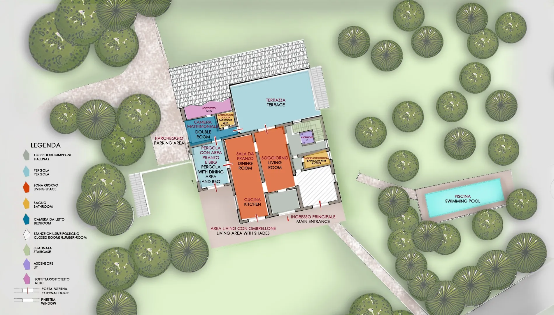 The villa has three floors. From the main entrance, you go into the sitting room with fireplace and TV; on the left are two large doors opening to the kitchen with dining table from where you go out to the veranda and pergola. From the veranda you come to a double bedroom with bathroom with shower and direct access to the terrace. The main entrance to the terrace is from the sitting room but it can also be reached from the garden. To the right of the sitting room is the lift which goes up to the first floor and down to the basement, a bathroom with shower and the wooden staircase leading to the sleeping areas on both the first floor and the basement. The sleeping area on the first floor consists of two double bedrooms, one with a balcony and a bathroom with tub. The entrance to the basement area leads, on the right, into a hallway with direct access out to the portico and to a bedroom with two beds; on the left, to a bathroom with shower and laundry; opposite, to a double bedroom with access to the portico and a bathroom with shower.