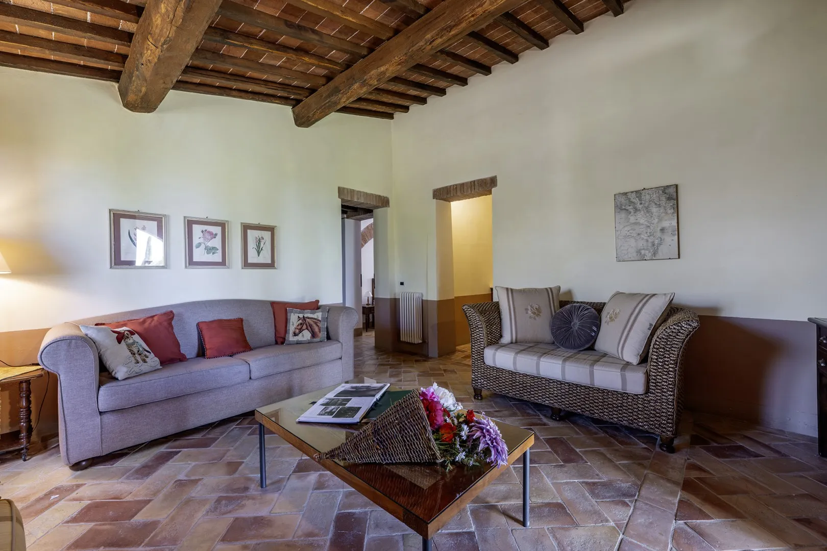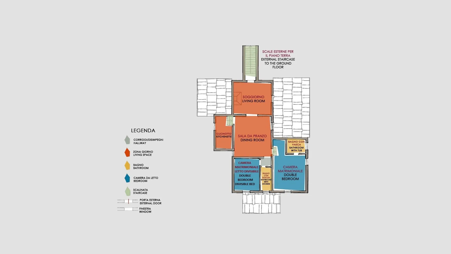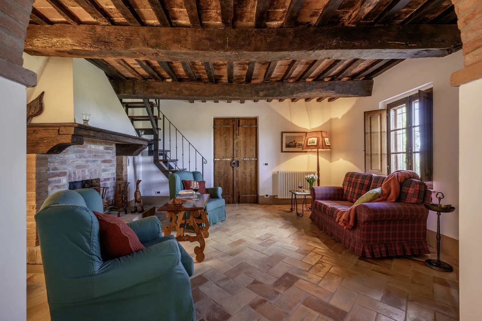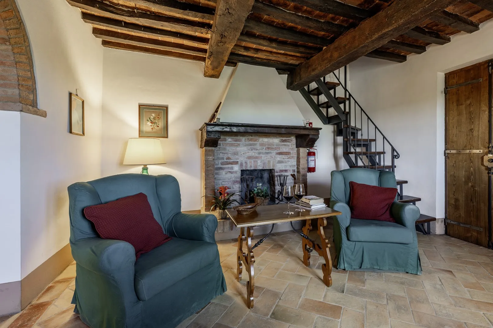 Casale Dei consists of the main house and an annex. HOUSE. It has two floors connected only externally by a terracotta staircase. The main entrance, under one of the porticos along the front façade of the house, leads into the living room, connected on the right with the kitchen, pantry and dining room. From here a French window leads directly out to the portico set up for alfresco dining. Continuing through the living room we come to a hallway leading to the sleeping area on this floor with three double bedrooms (with divisible bed), each with private bathroom (one with whirlpool tub, one with shower and one with tub). The external staircase between the two porticos leads up to the first floor, arranged with an open-plan living room - dining room, a kitchenette and two bedrooms: a double with ensuite bathroom and a double (with divisible bed) served by a bathroom with shower. Finally, the laundry room is located in a room with access from the outside. ANNEX. About 10 m from the main house and next to the pool area, it has only one floor composed of living area with kitchenette and a double bedroom with private bathroom with shower. Please note: the fireplace is ornamental.