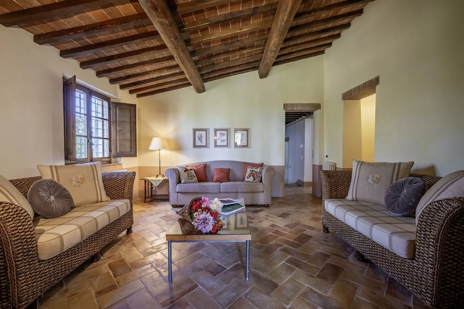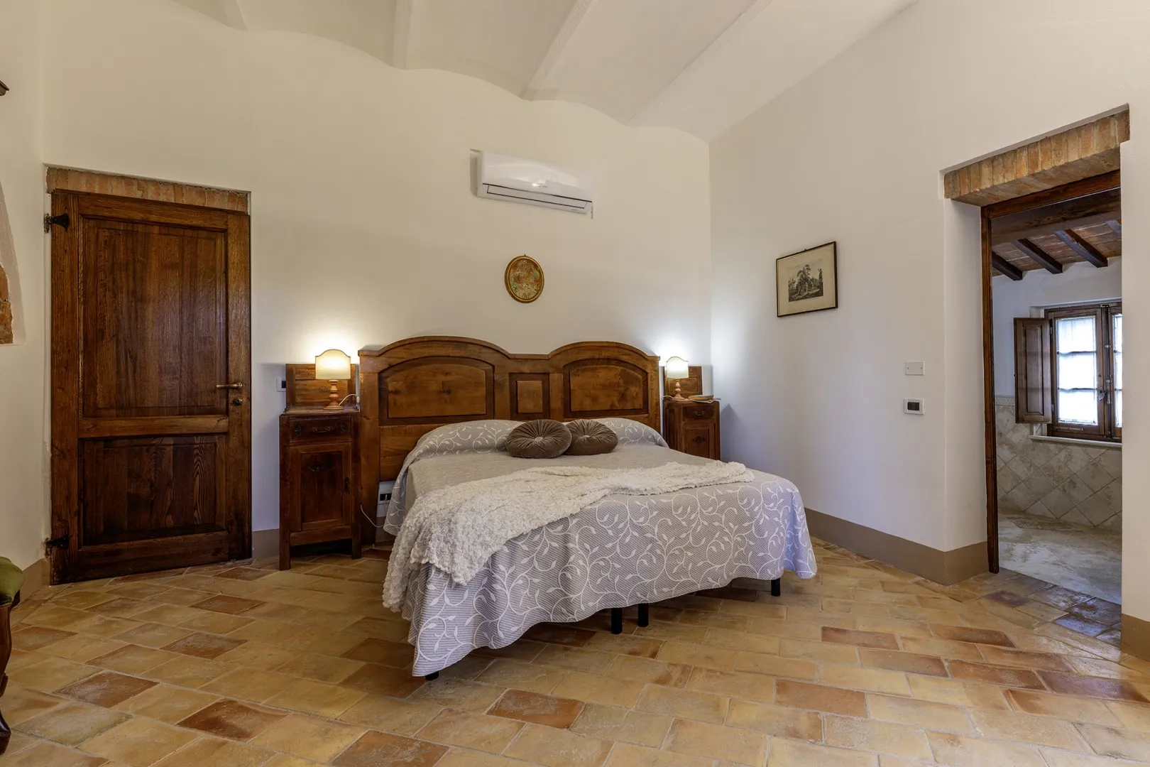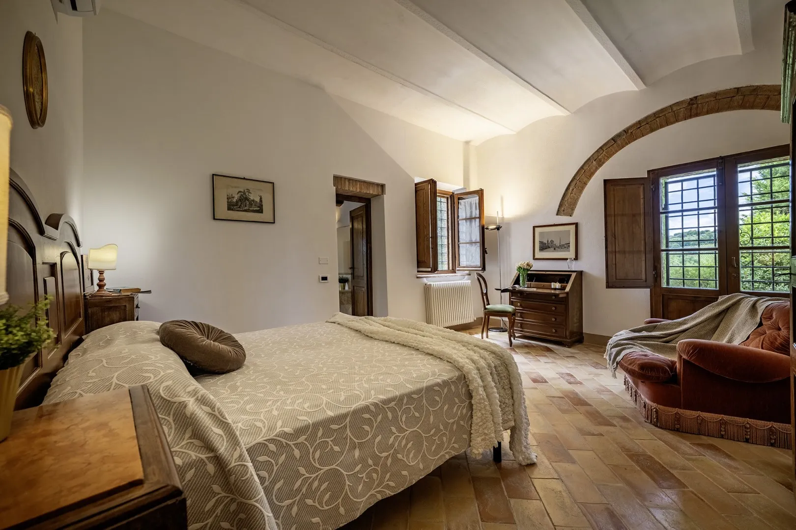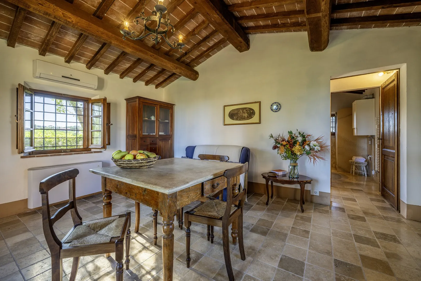Casale Dei consists of the main house and an annex. HOUSE. It has two floors connected only externally by a terracotta staircase. The main entrance, under one of the porticos along the front façade of the house, leads into the living room, connected on the right with the kitchen, pantry and dining room. From here a French window leads directly out to the portico set up for alfresco dining. Continuing through the living room we come to a hallway leading to the sleeping area on this floor with three double bedrooms (with divisible bed), each with private bathroom (one with whirlpool tub, one with shower and one with tub). The external staircase between the two porticos leads up to the first floor, arranged with an open-plan living room - dining room, a kitchenette and two bedrooms: a double with ensuite bathroom and a double (with divisible bed) served by a bathroom with shower. Finally, the laundry room is located in a room with access from the outside. ANNEX. About 10 m from the main house and next to the pool area, it has only one floor composed of living area with kitchenette and a double bedroom with private bathroom with shower. Please note: the fireplace is ornamental.