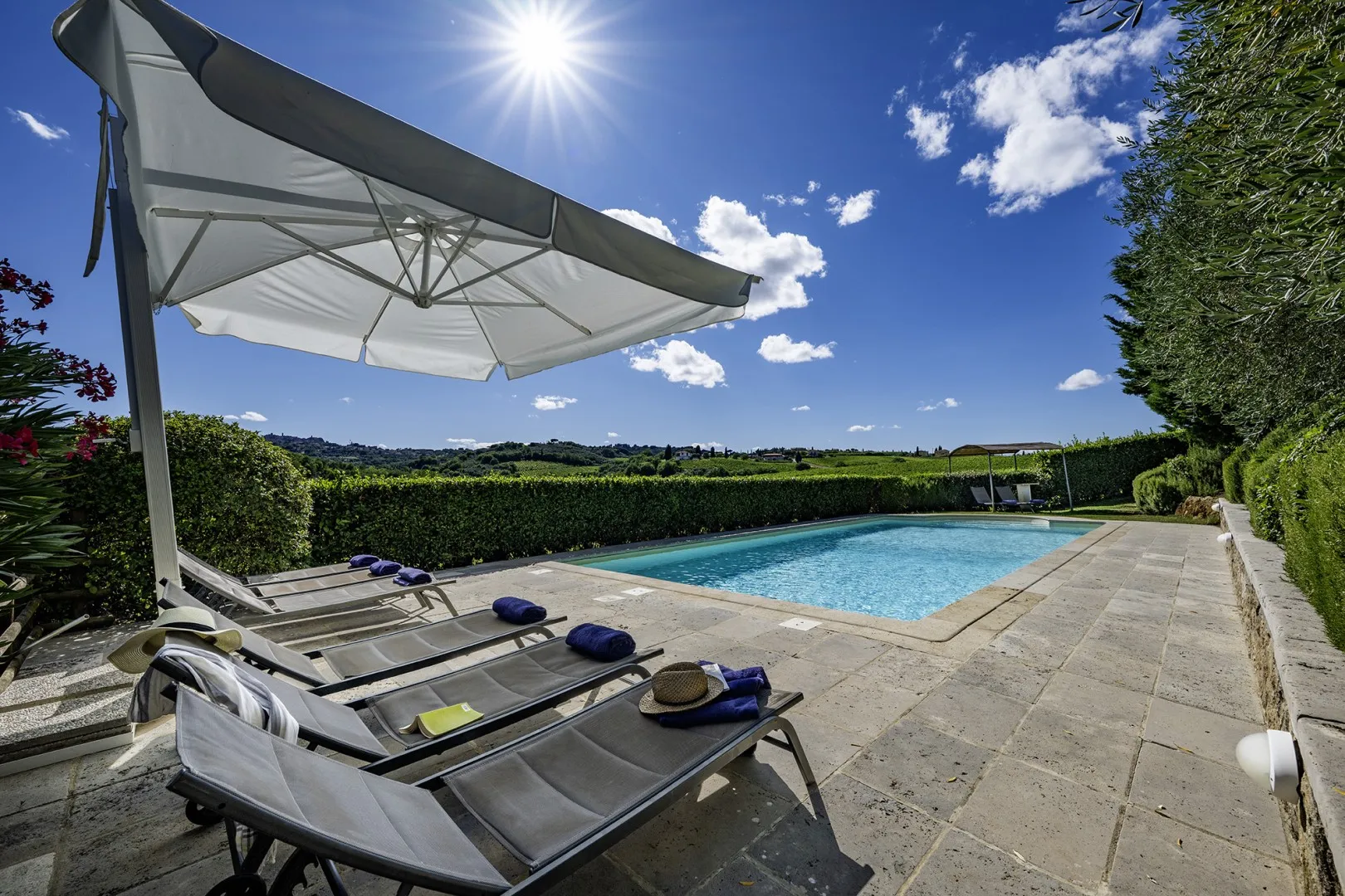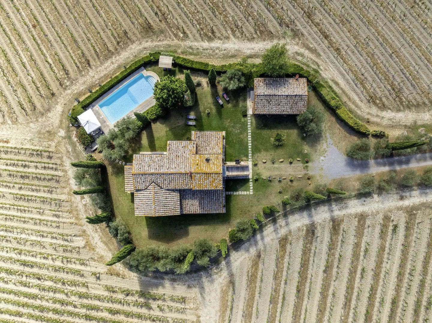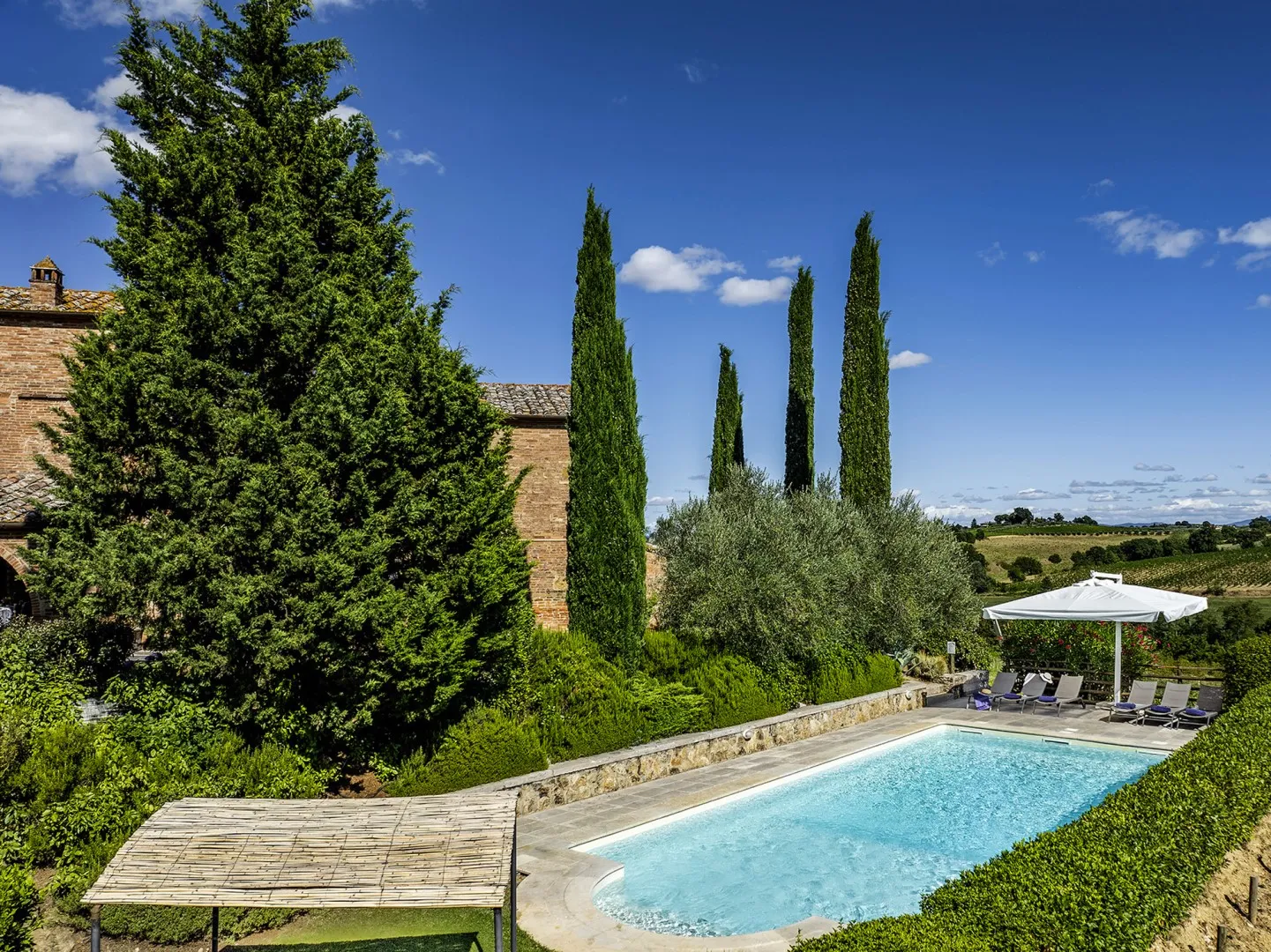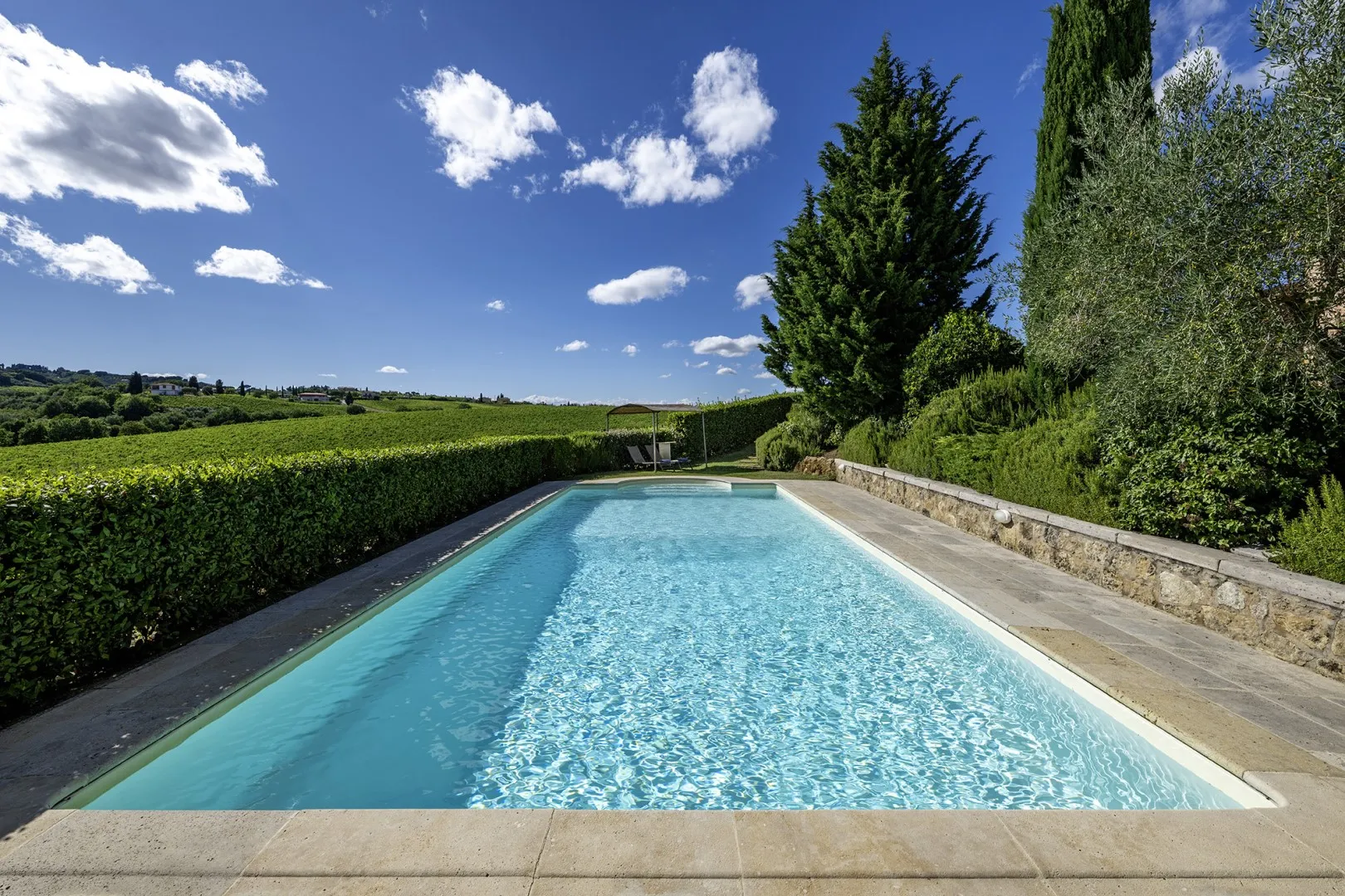 In a quiet, discreet area of the garden, which offers a particularly fascinating scenario with vineyards and the borgo of Montepulciano on the horizon, lies the beautiful swimming pool, perfectly integrated in the surrounding rural landscape and just a few metres from the house. The rectangular pool measures 11 x 5 m with the depth ranging from 1.10 to 1.60 m., is lined in PVC and has chlorine purification. It has elegant Roman steps for access to the water and the border is in travertine marble as is the sunbathing area around the pool, provided with sunbeds and a gazebo, with nearby a hot and cold-water shower. The swimming pool is open from the last Saturday in April until the first Saturday in October.