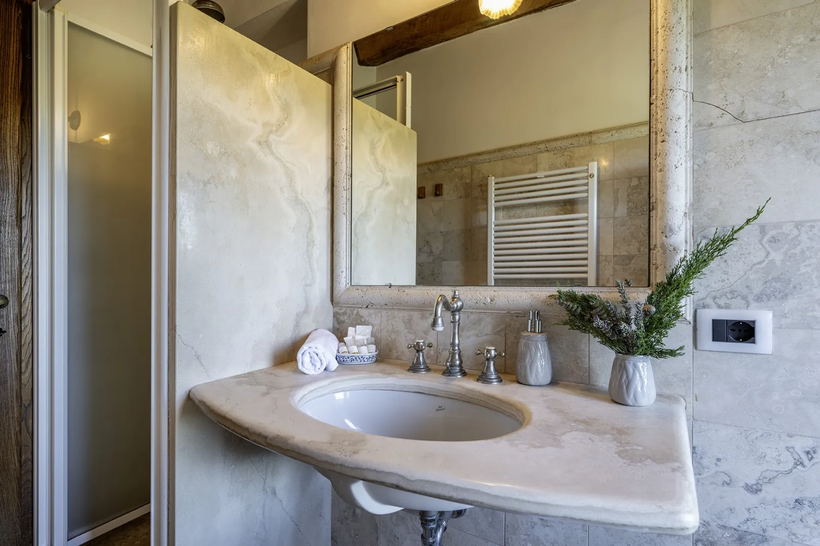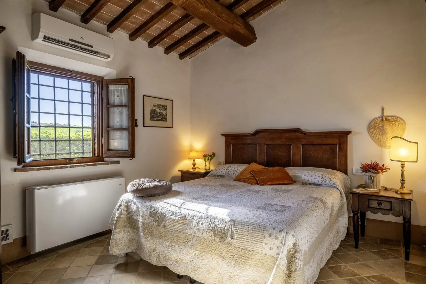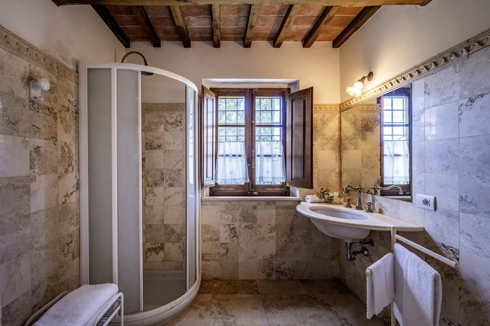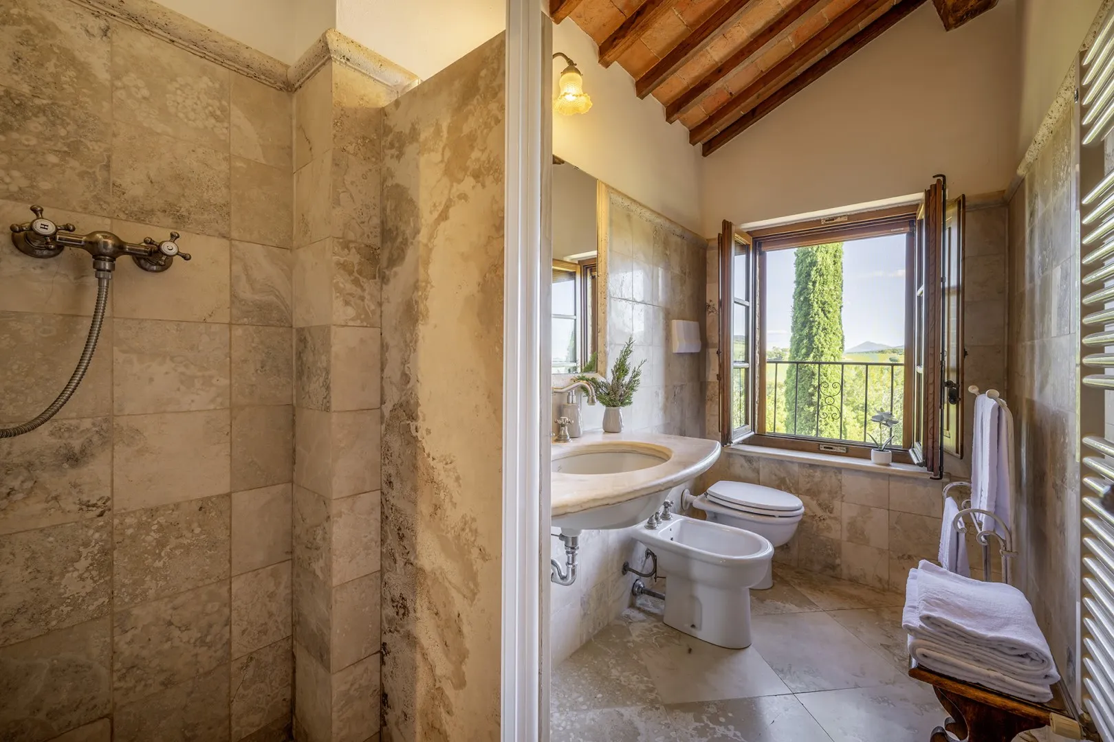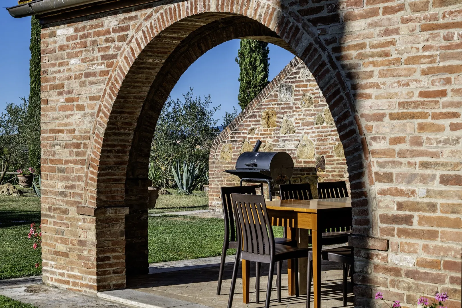 In a quiet, discreet area of the garden, which offers a particularly fascinating scenario with vineyards and the borgo of Montepulciano on the horizon, lies the beautiful swimming pool, perfectly integrated in the surrounding rural landscape and just a few metres from the house. The rectangular pool measures 11 x 5 m with the depth ranging from 1.10 to 1.60 m., is lined in PVC and has chlorine purification. It has elegant Roman steps for access to the water and the border is in travertine marble as is the sunbathing area around the pool, provided with sunbeds and a gazebo, with nearby a hot and cold-water shower. The swimming pool is open from the last Saturday in April until the first Saturday in October.