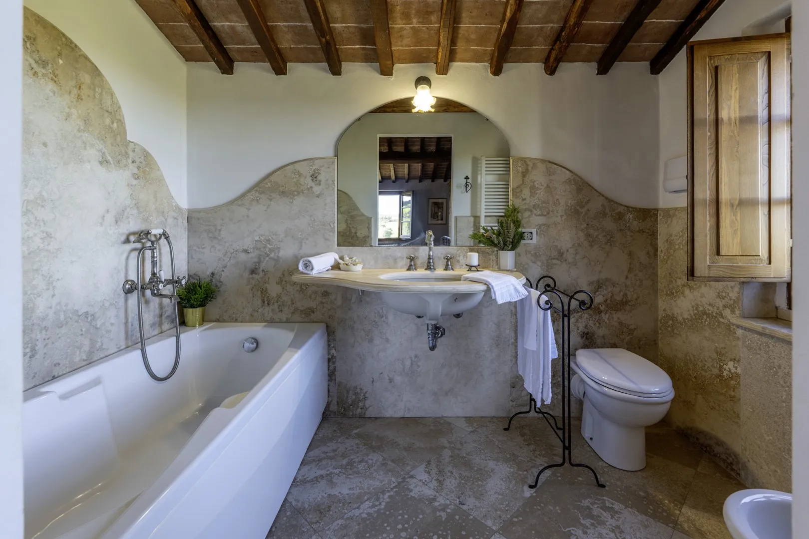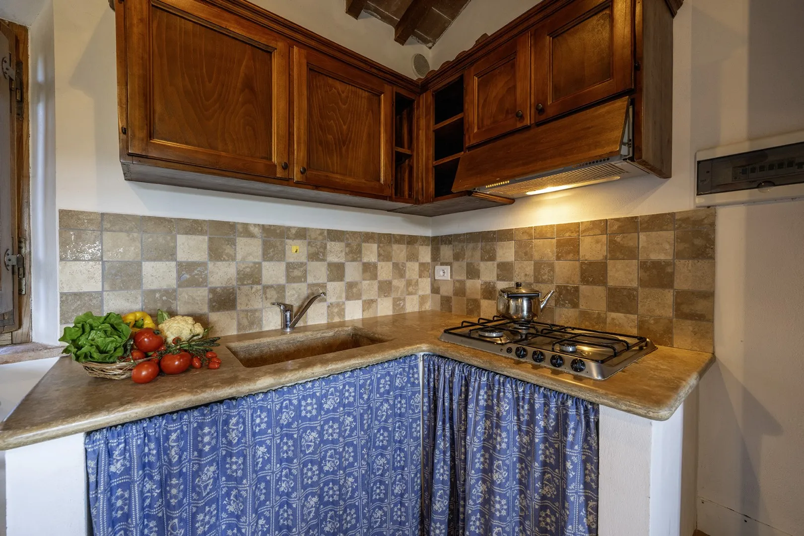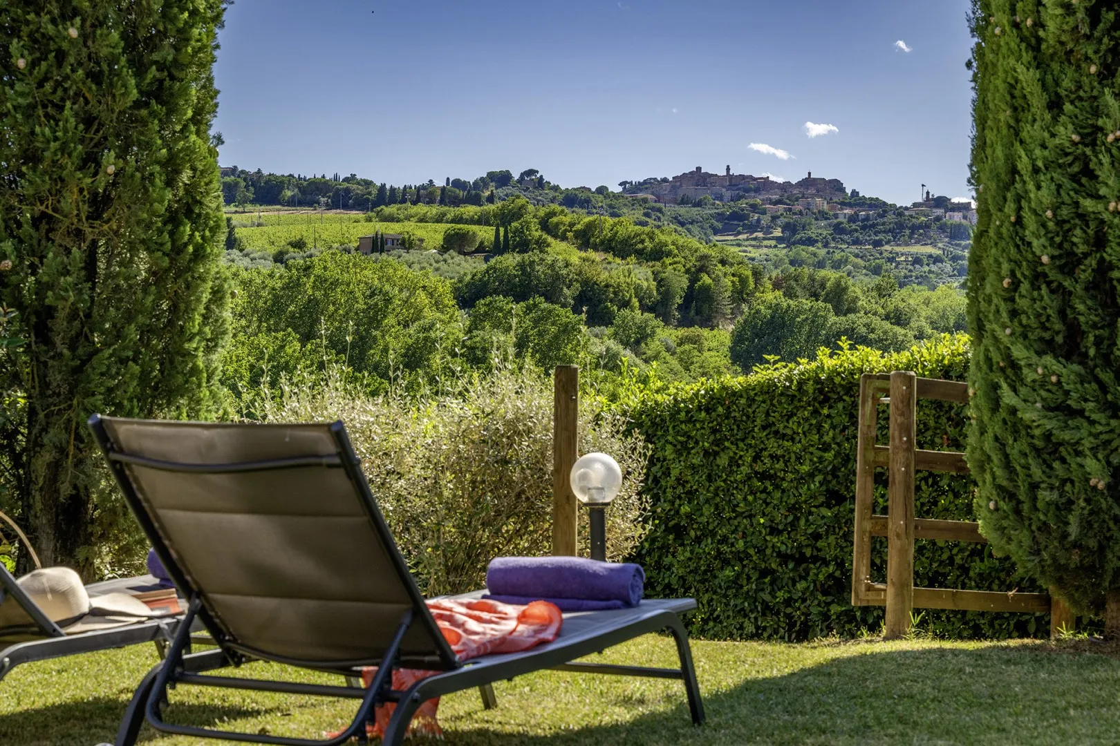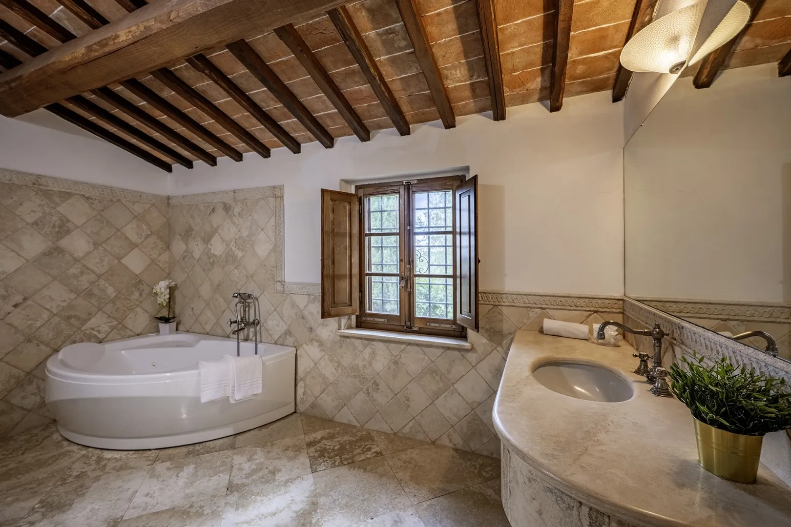 In a quiet, discreet area of the garden, which offers a particularly fascinating scenario with vineyards and the borgo of Montepulciano on the horizon, lies the beautiful swimming pool, perfectly integrated in the surrounding rural landscape and just a few metres from the house. The rectangular pool measures 11 x 5 m with the depth ranging from 1.10 to 1.60 m., is lined in PVC and has chlorine purification. It has elegant Roman steps for access to the water and the border is in travertine marble as is the sunbathing area around the pool, provided with sunbeds and a gazebo, with nearby a hot and cold-water shower. The swimming pool is open from the last Saturday in April until the first Saturday in October.
