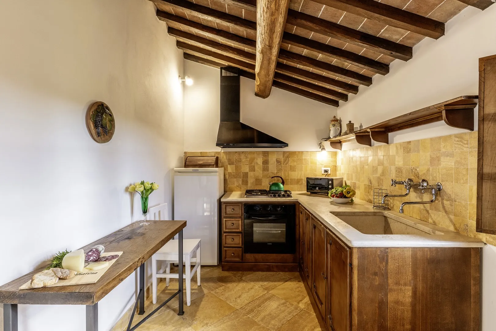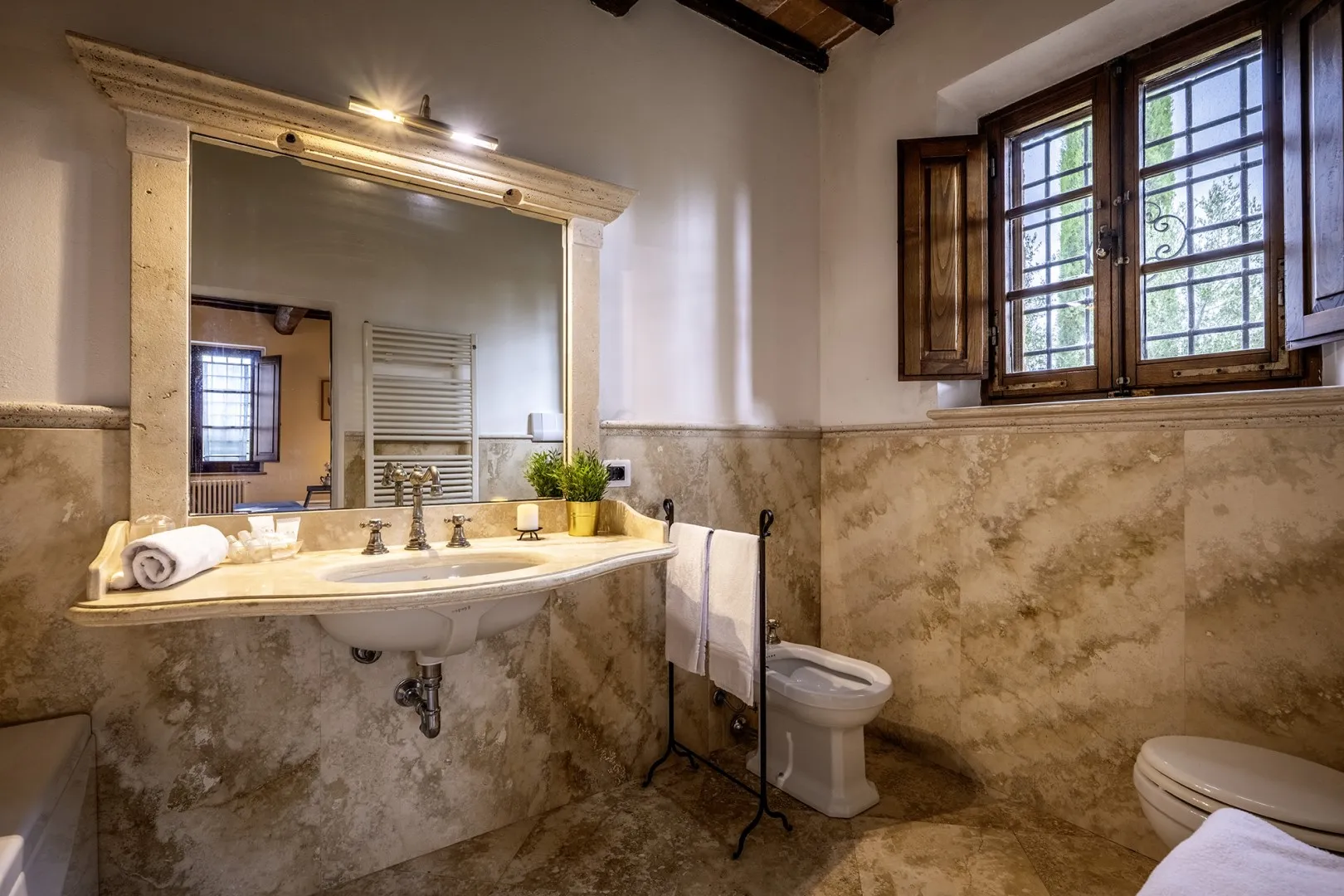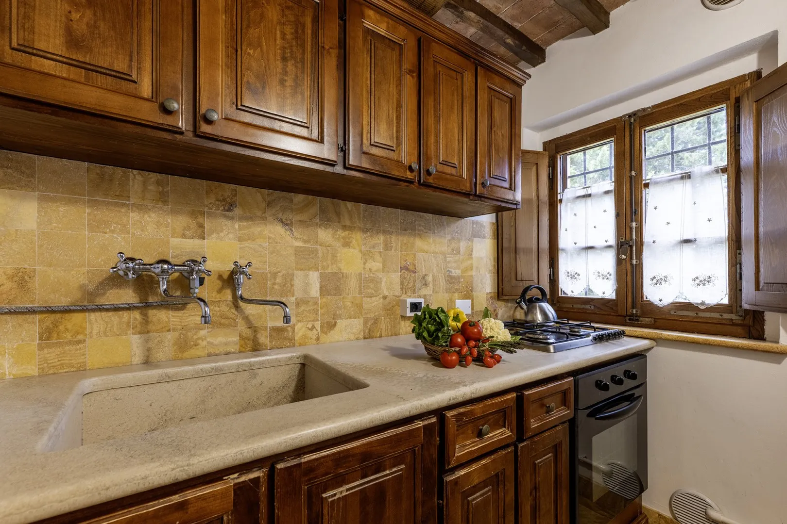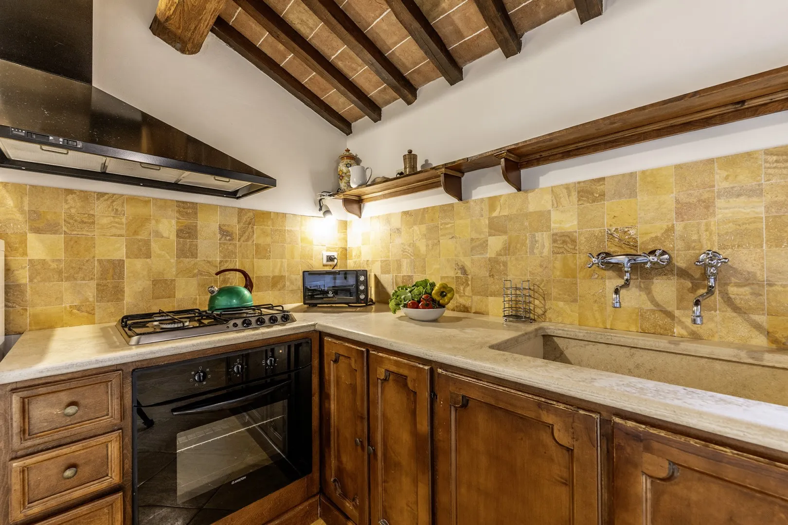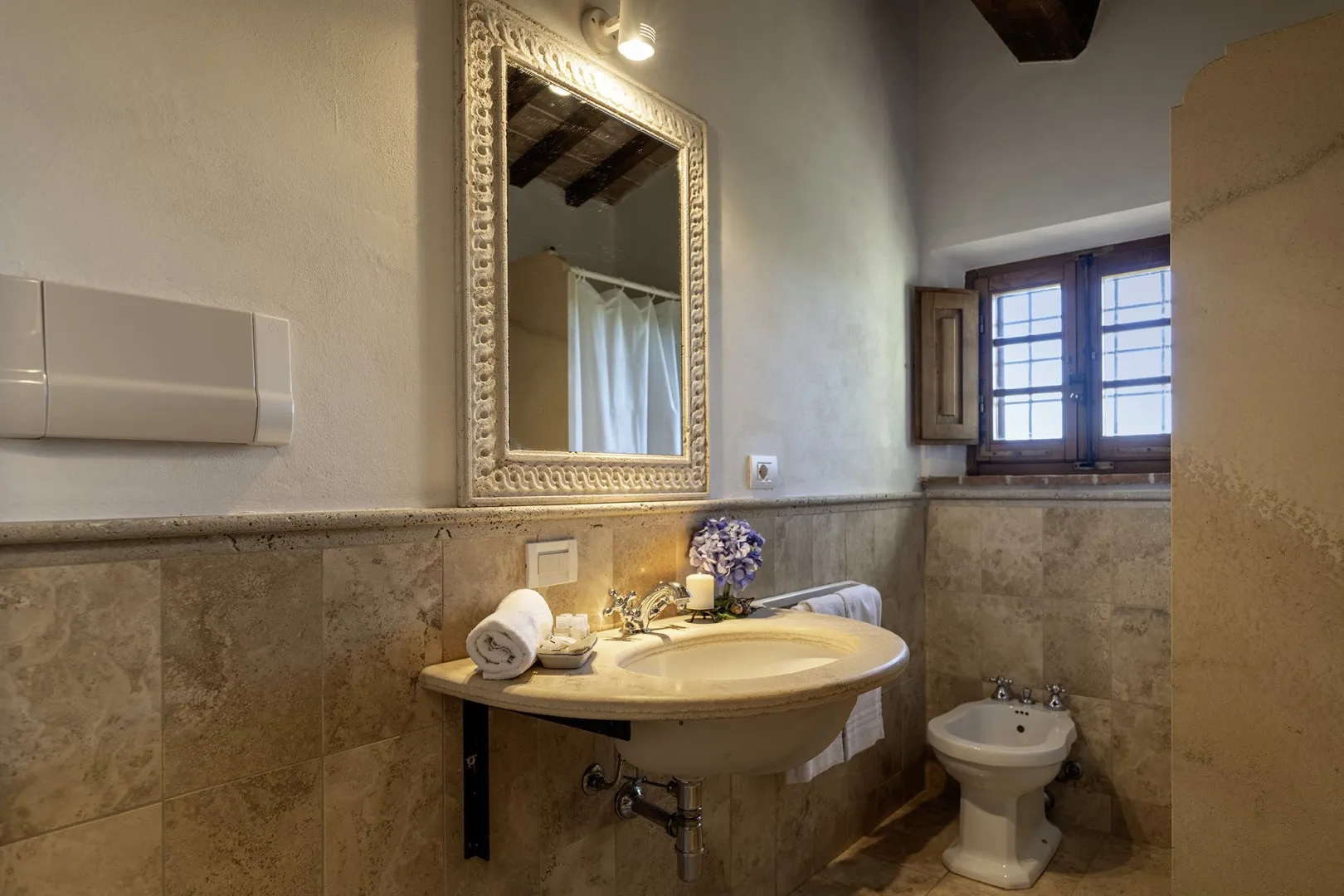 In a quiet, discreet area of the garden, which offers a particularly fascinating scenario with vineyards and the borgo of Montepulciano on the horizon, lies the beautiful swimming pool, perfectly integrated in the surrounding rural landscape and just a few metres from the house. The rectangular pool measures 11 x 5 m with the depth ranging from 1.10 to 1.60 m., is lined in PVC and has chlorine purification. It has elegant Roman steps for access to the water and the border is in travertine marble as is the sunbathing area around the pool, provided with sunbeds and a gazebo, with nearby a hot and cold-water shower. The swimming pool is open from the last Saturday in April until the first Saturday in October.