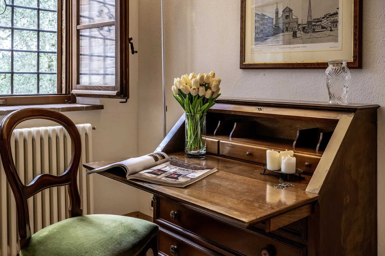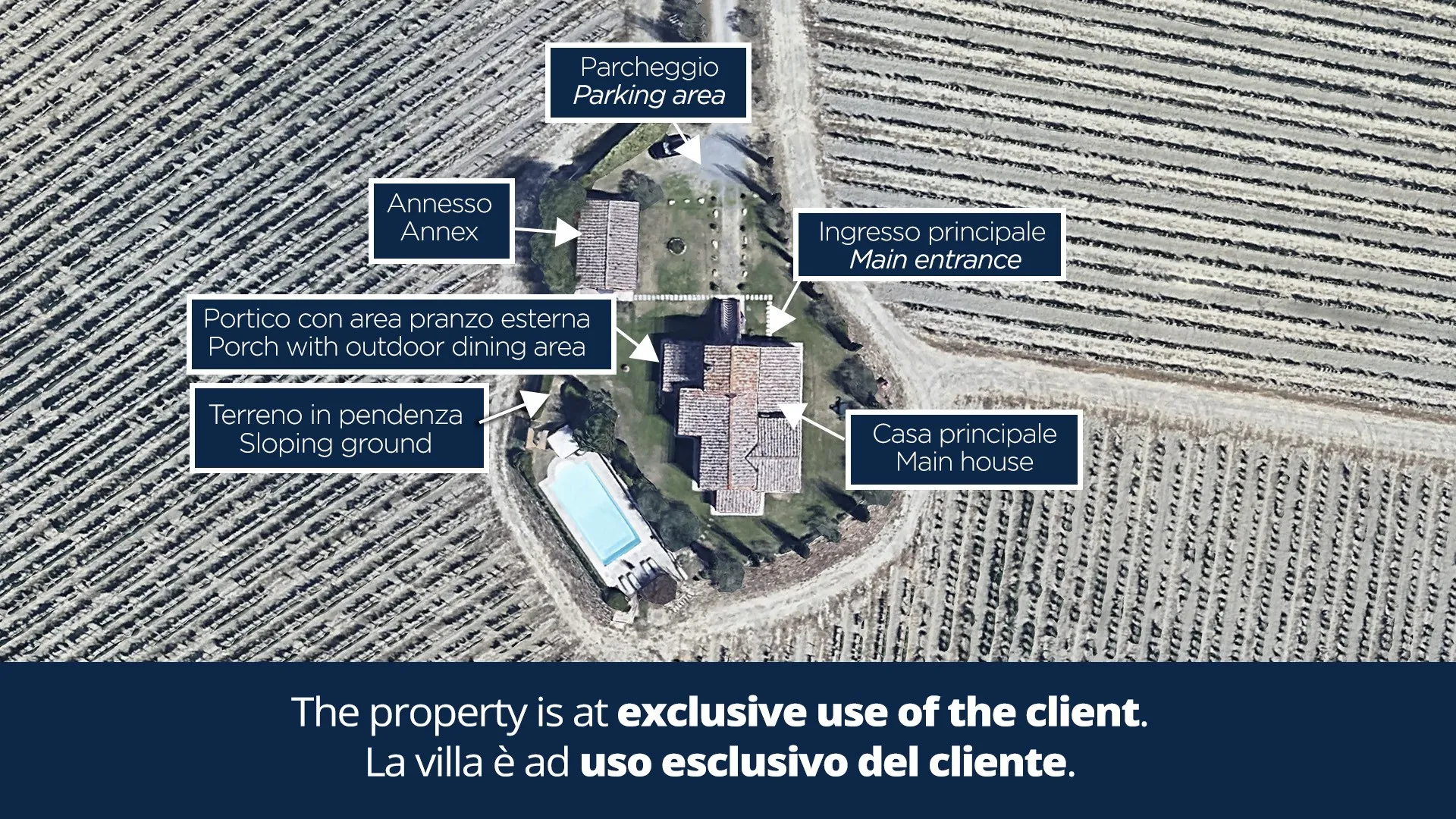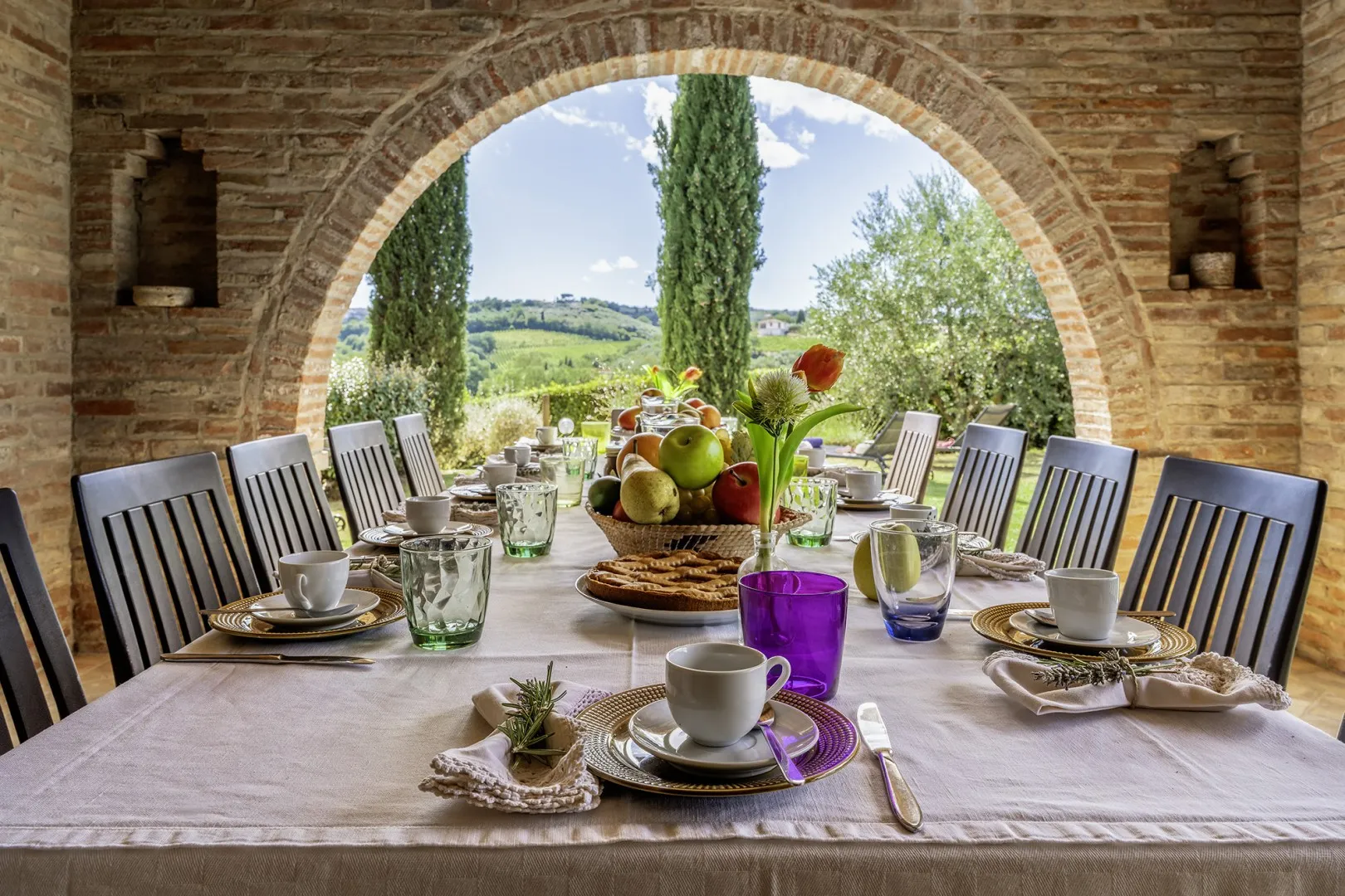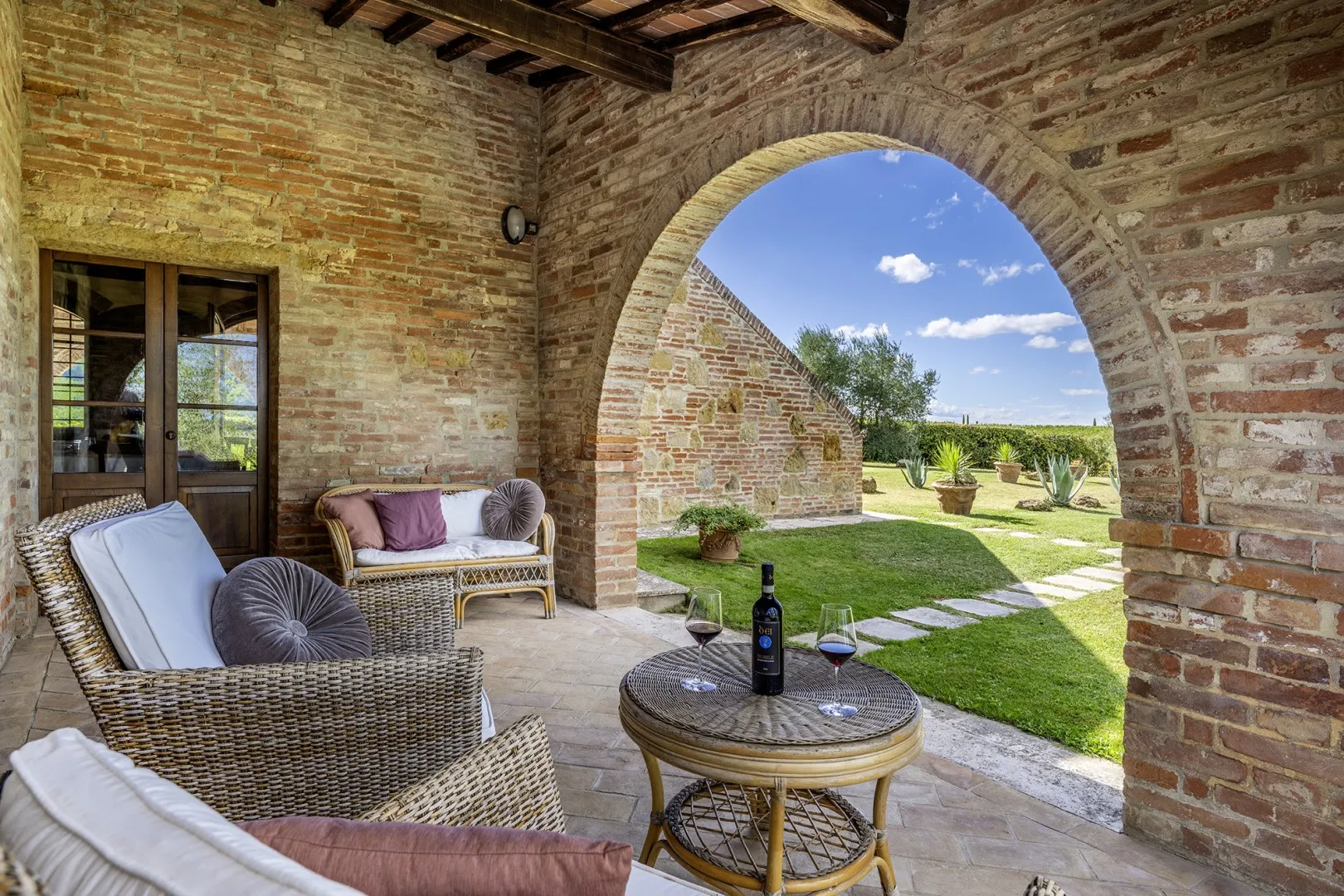 In the large grounds surrounding the house, set inside a farm and for the most part occupied by the cultivation of vines, extends the park pertaining to the property which covers an area of about 700 sq m and which consists of a cosy garden enlivened by cypresses, olive trees, lavender and rosemary bushes and pots of assorted colourful flowers. Outside the living room and the dining room are two porches of which one is set up as outdoor dining area. Near the main entrances of both the villa and the annex is a parking area (at the end of the driveway).Please notice that photos are taken in spring, therefore flower blossoming, and the colours of the gardens' grass could be different at the moment of your arrival at the villa.