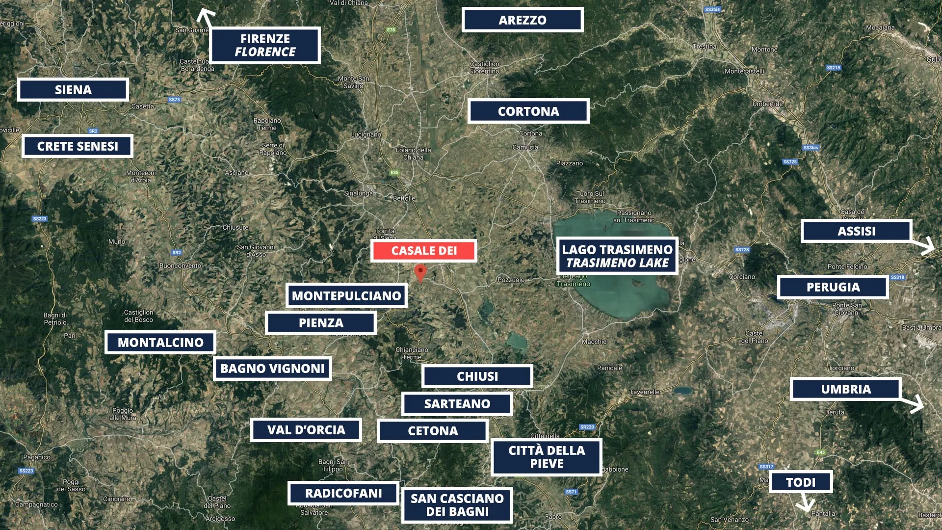 Casale Dei is located in the municipality of Montepulciano, the pearl of the Renaissance known for the grandeur of its Renaissance palaces, for the elegant beauty of its churches and for the Vino Nobile, one of the most internationally appreciated Tuscan wines. The geographical position between the Val d'Orcia and the Val di Chiana makes the house a strategic point from which to explore the wonders of Tuscany. From here you can easily reach the A1 motorway (the Chiusi/Chianciano Terme exit is only 20 km away) to visit cities such as Florence, Siena, Orvieto, Rome.