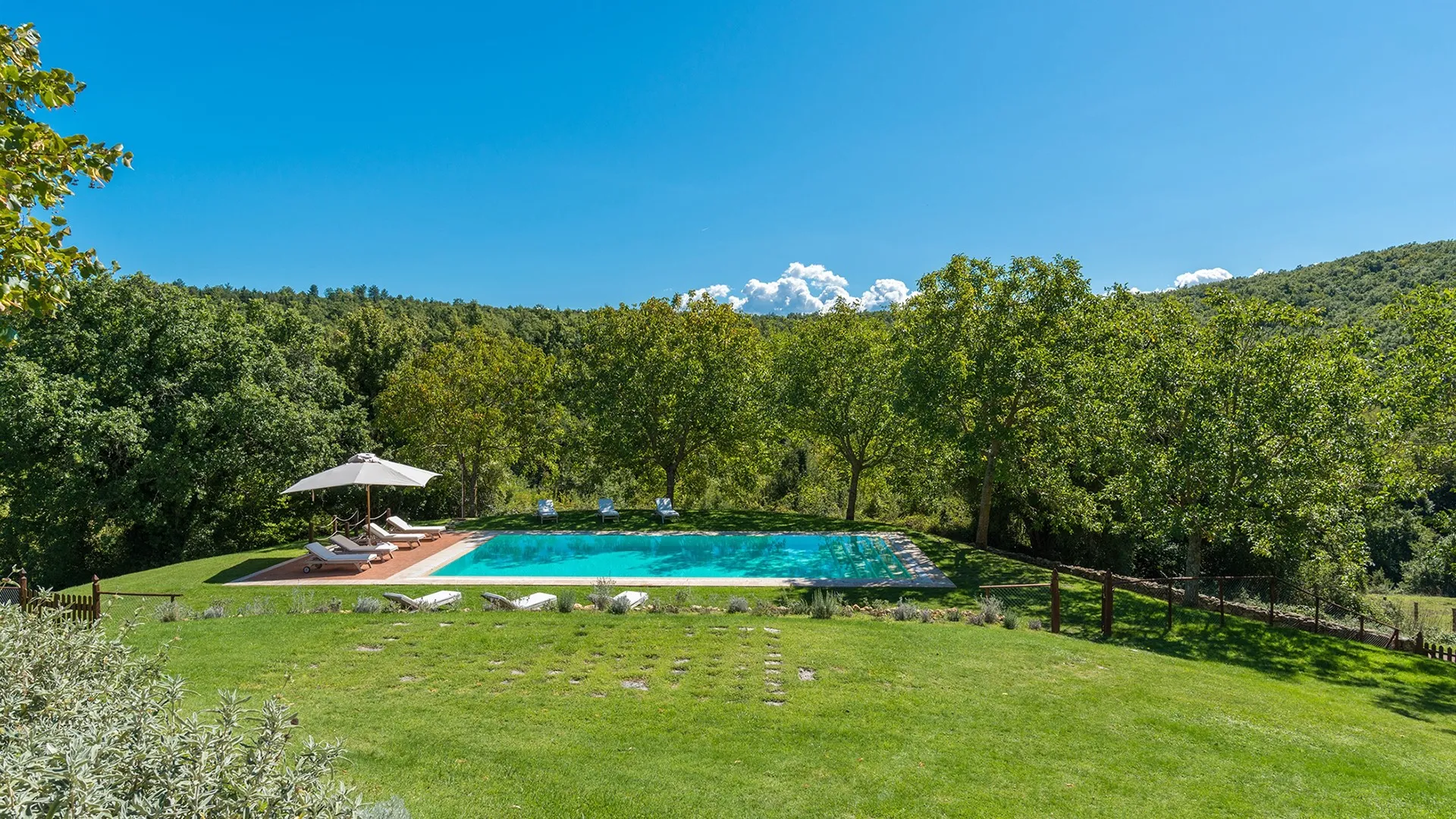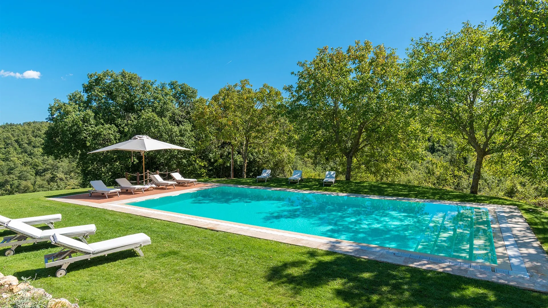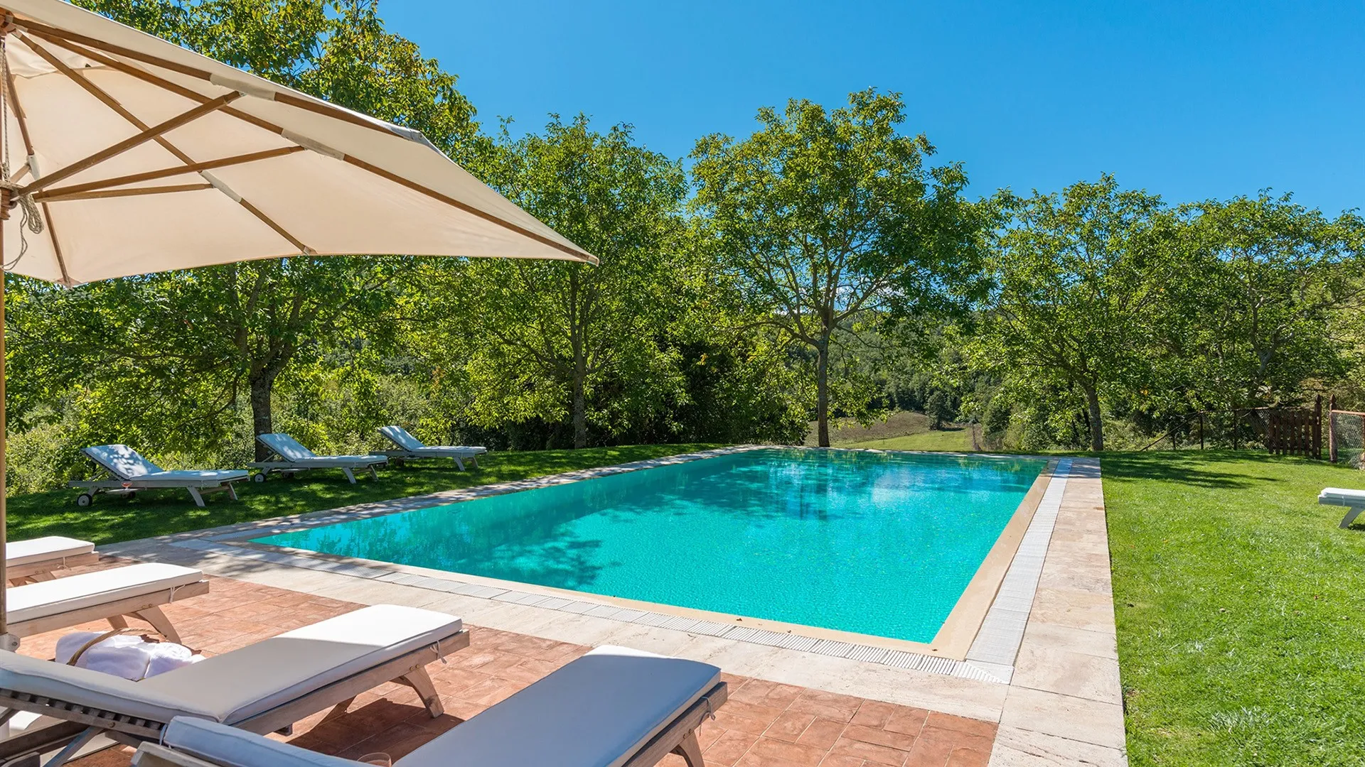 The rectangular-shaped swimming pool is 20 metres from the house, on a lower terrace, and is reached directly from the garden. It is situated to the side of the house and is visible from the portico. The pool (fanced) measures 7 x 14 m with a depth varying from 1,50 to 2,50 m; access to the water is via large steps. It is lined in blue PVC and has chlorine purification. The solarium area, equipped with sunbeds and umbrella, is paved in terracotta and travertine marble.