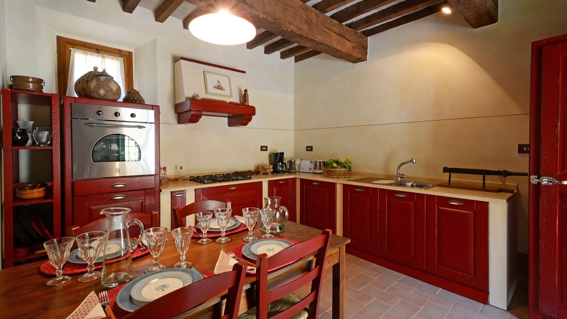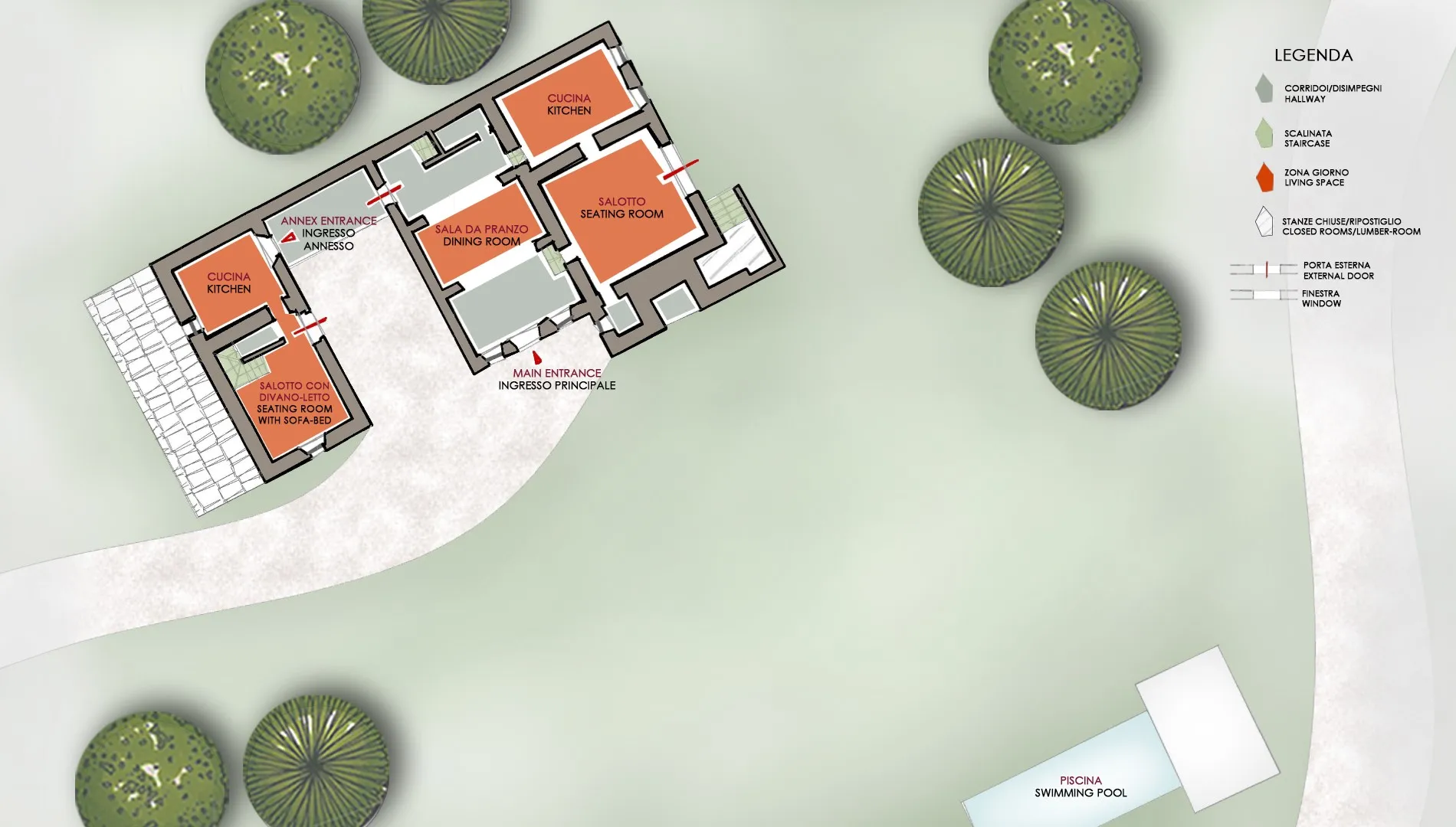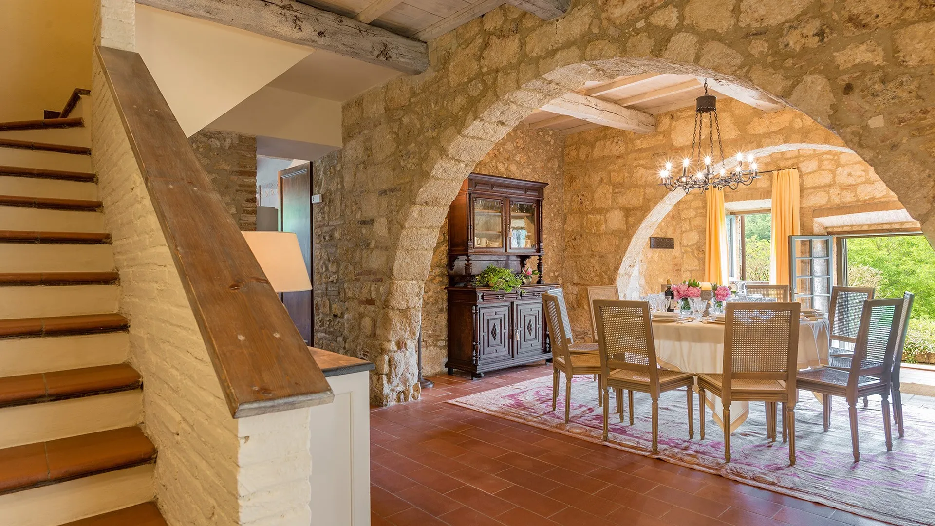 The main house has two floors, connected by internal and external staircases (the external staircase leads directly to the double bedroom on the 1st floor). The entrance to the ground floor opens into a spacious dining room communicating with the sitting room and kitchen on the right. In the dining room a terracotta staircase leads up to the first floor: here we find a TV room, a double bedroom with en-suite bathroom with tub, a twin bedroom with joinable beds with en-suite bathroom with shower and a twin bedroom with joinable beds with an adjacent bathroom with tub. A stone patio separates the three-storey annex from the front of the main building. The ground floor entrance to the annex leads into a lounge with TV, a kitchen and a staircase in terracotta and wood leading up to the first and second floors. On the first floor is a double bedroom (with dividable beds) with adjacent bathroom with shower and a walk-in closet. On the second floor is a double bedroom with en-suite bathroom with tub.
