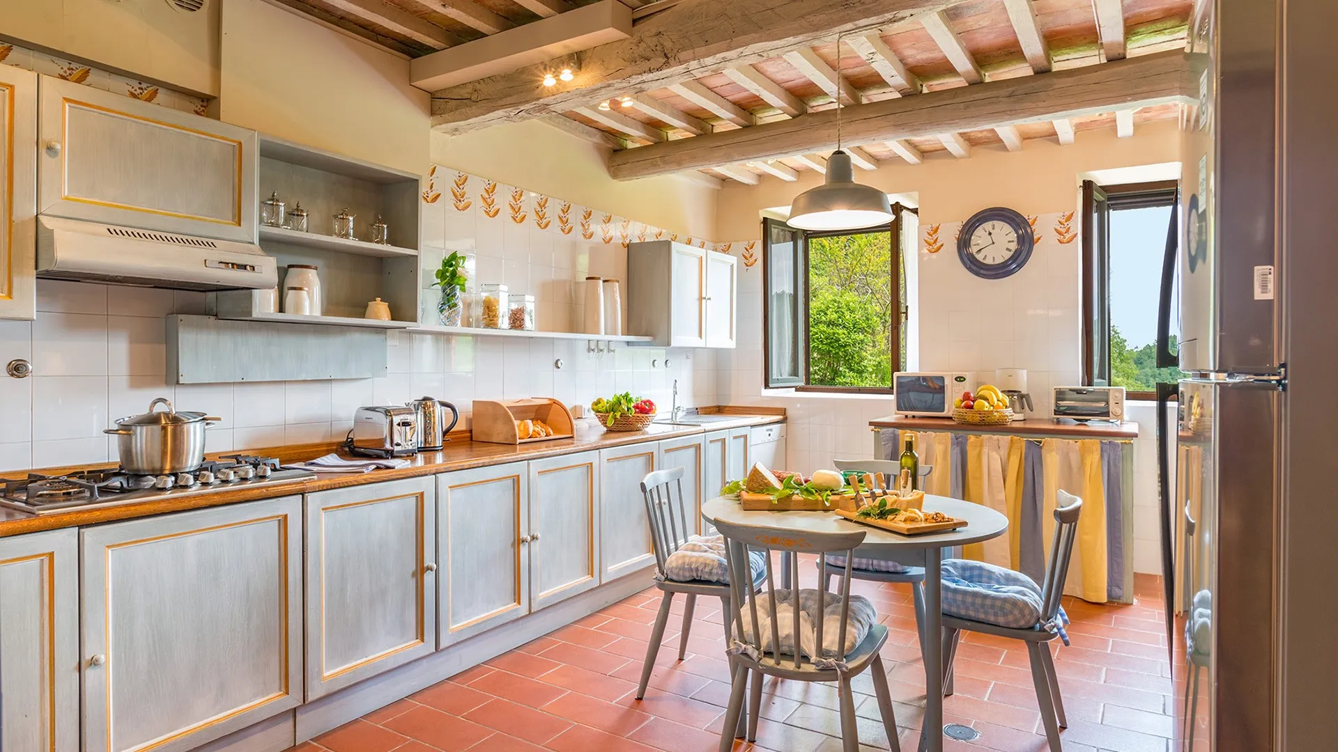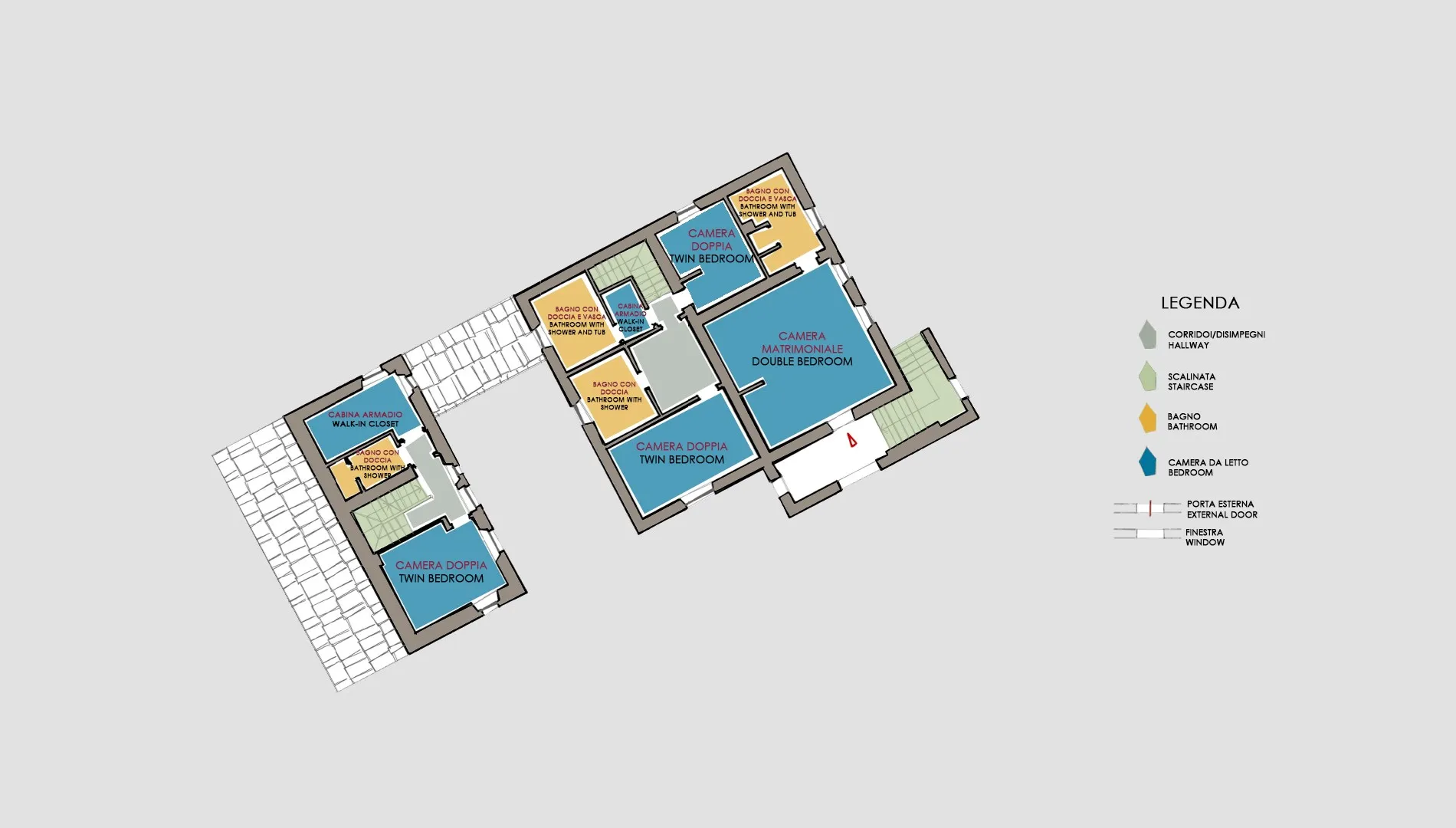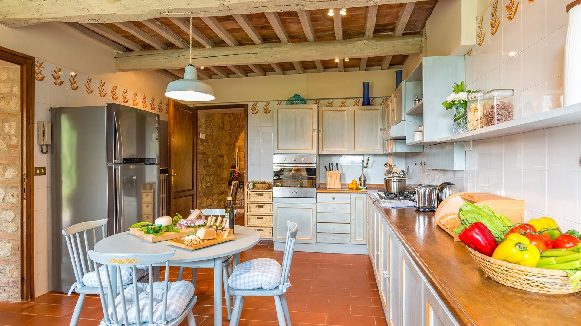 The main house has two floors, connected by internal and external staircases (the external staircase leads directly to the double bedroom on the 1st floor). The entrance to the ground floor opens into a spacious dining room communicating with the sitting room and kitchen on the right. In the dining room a terracotta staircase leads up to the first floor: here we find a TV room, a double bedroom with en-suite bathroom with tub, a twin bedroom with joinable beds with en-suite bathroom with shower and a twin bedroom with joinable beds with an adjacent bathroom with tub. A stone patio separates the three-storey annex from the front of the main building. The ground floor entrance to the annex leads into a lounge with TV, a kitchen and a staircase in terracotta and wood leading up to the first and second floors. On the first floor is a double bedroom (with dividable beds) with adjacent bathroom with shower and a walk-in closet. On the second floor is a double bedroom with en-suite bathroom with tub.
