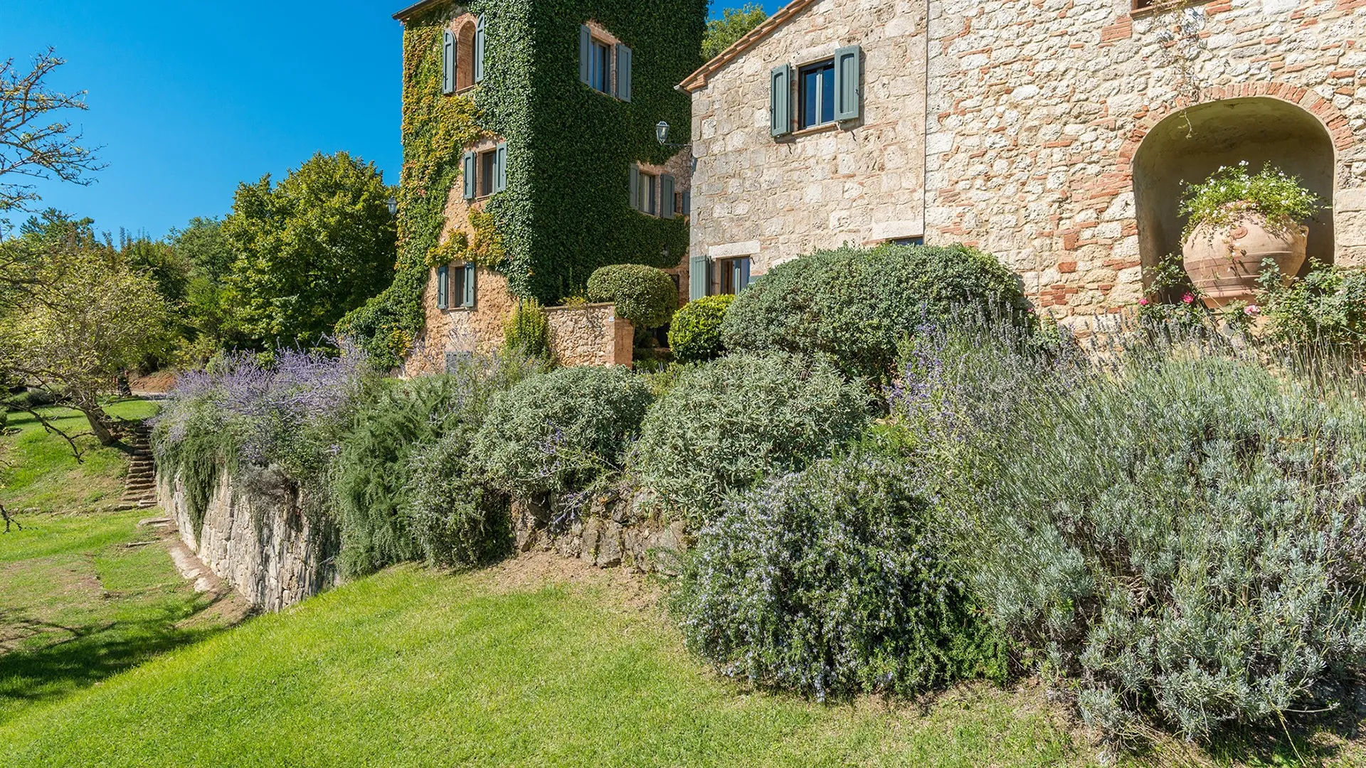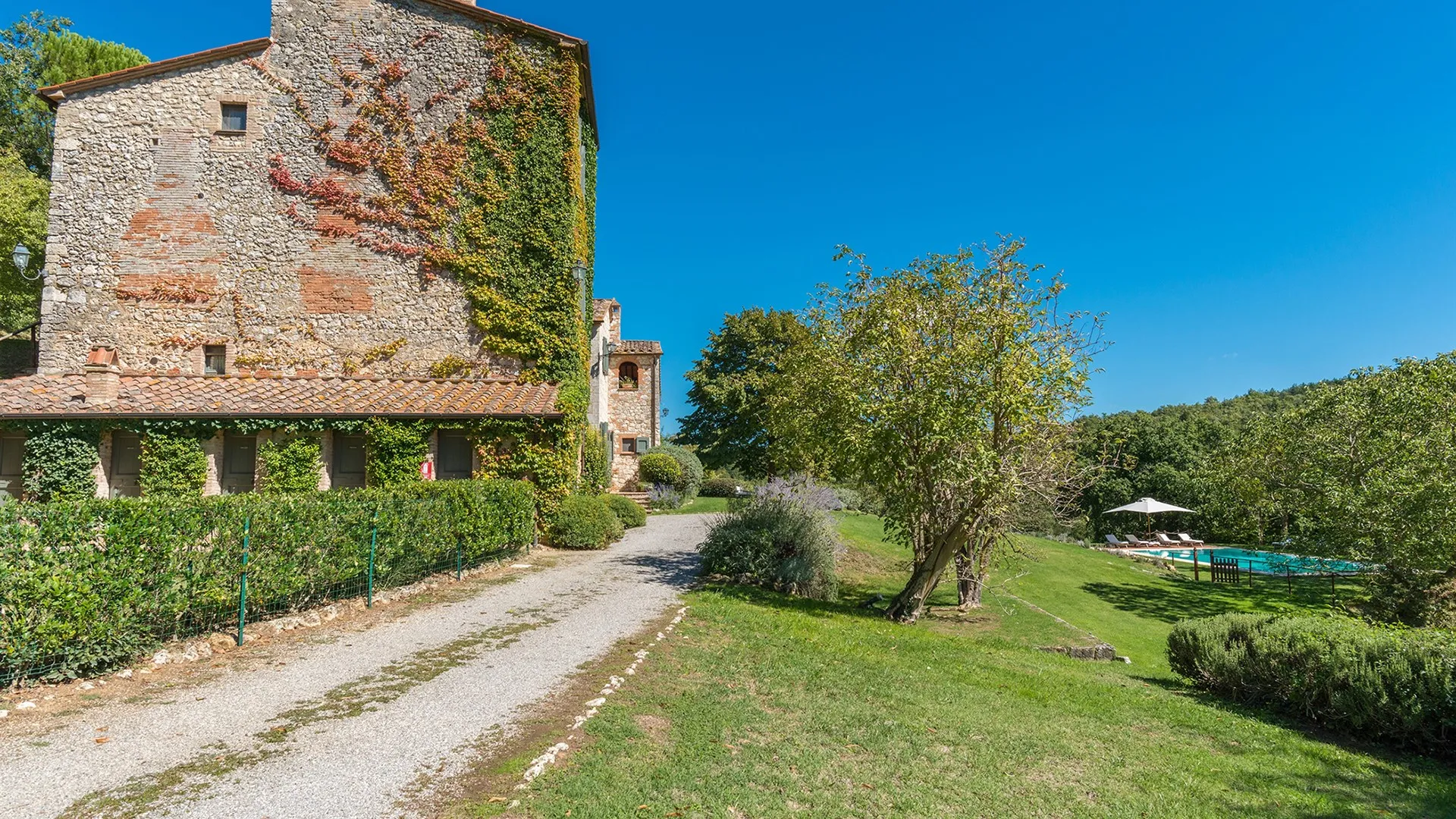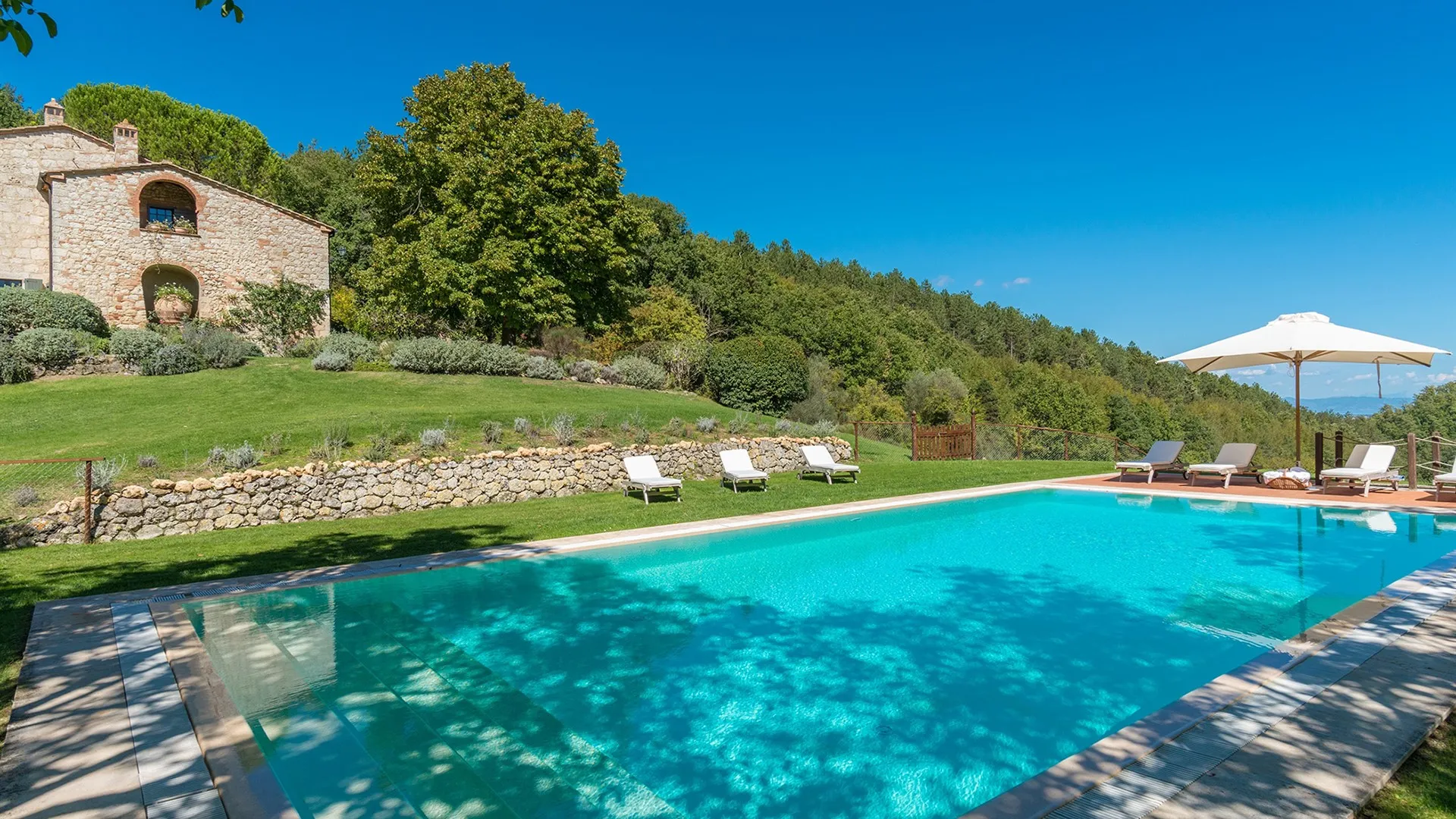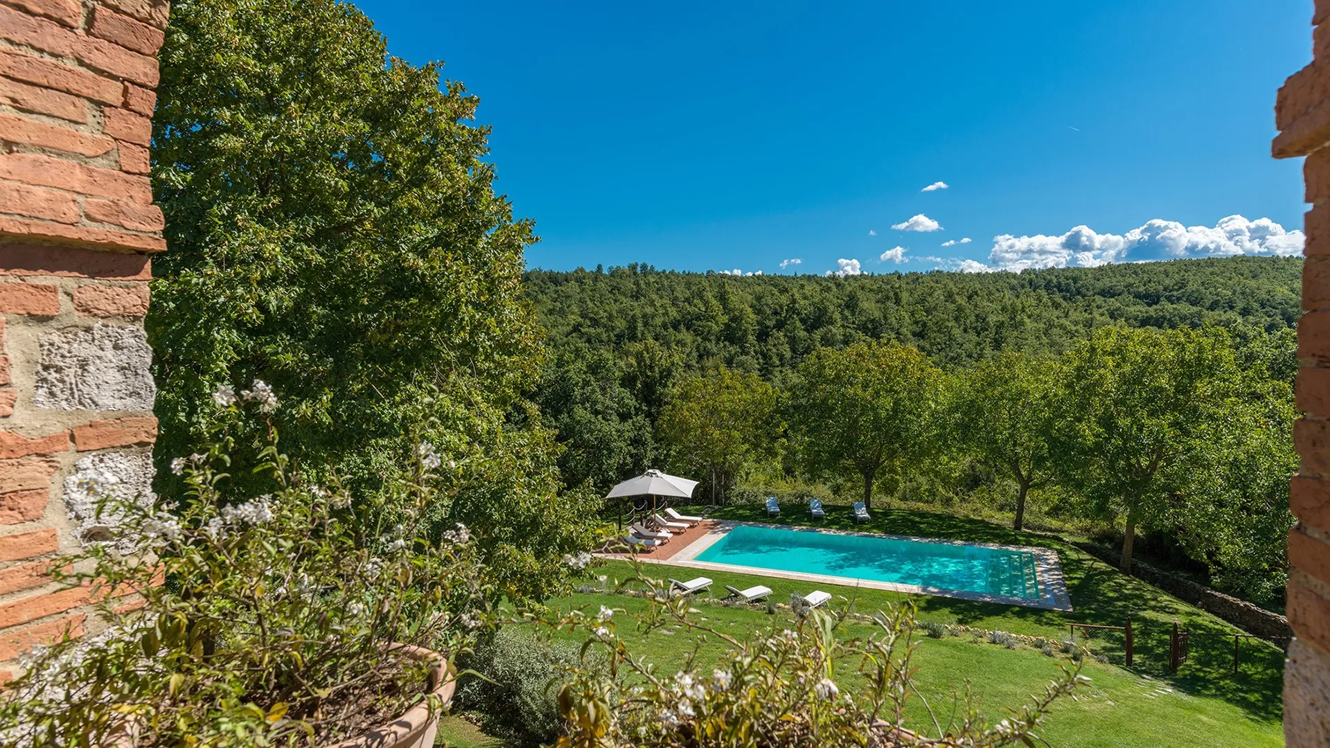 The wooded area surrounding the residence presents a unique setting, inundated with seasonal scents and stunning colours. The green, well-kept garden is spread over an area of 5000 square meters and is full of trees, flowers and herbs. The big oak tree not far from the house is the ideal place to relax with a good glass of wine. Opposite the main entrance of the house, on a lower terrace, is the panoramic swimming pool overlooking the characteristic Tuscan hills in all their splendour.Please notice that photos are taken in spring, therefore flower blossoming, and the colours of the gardens' grass could be different at the moment of your arrival at the villa.