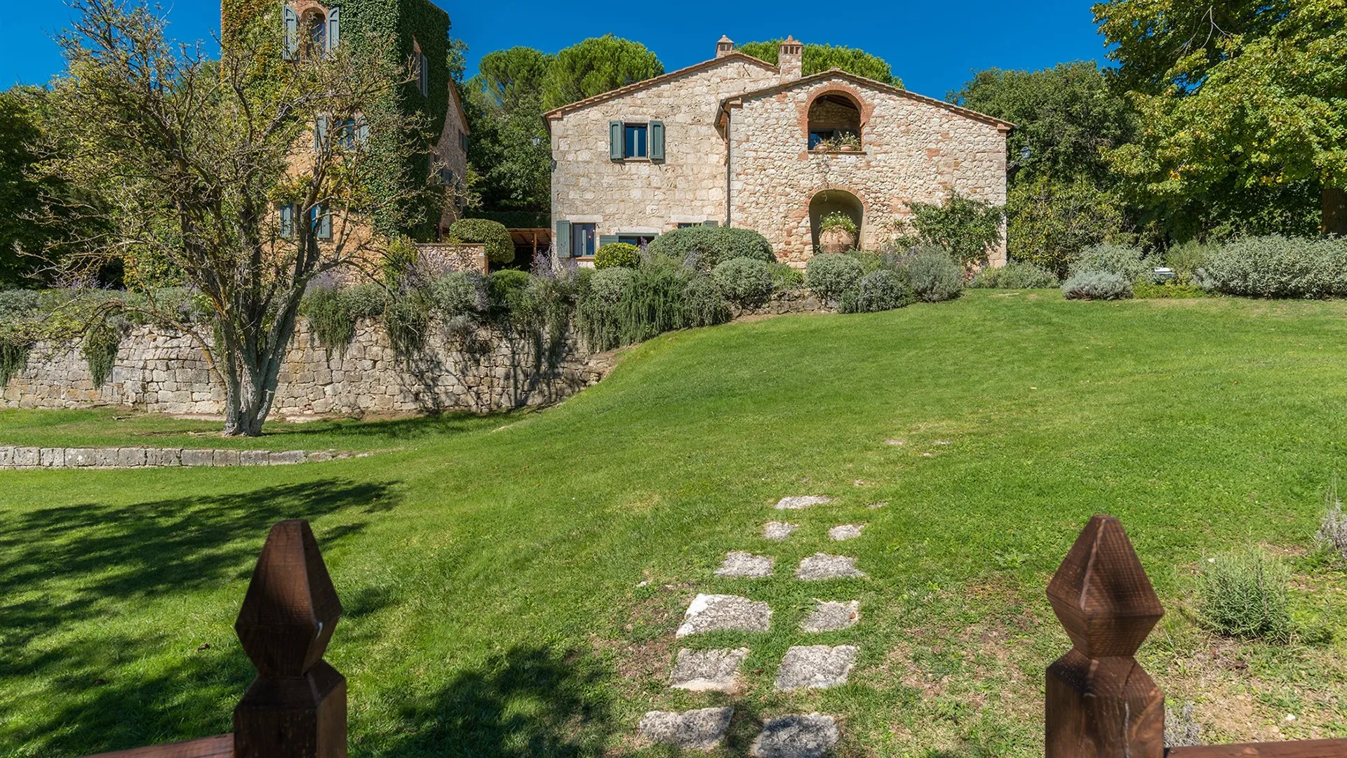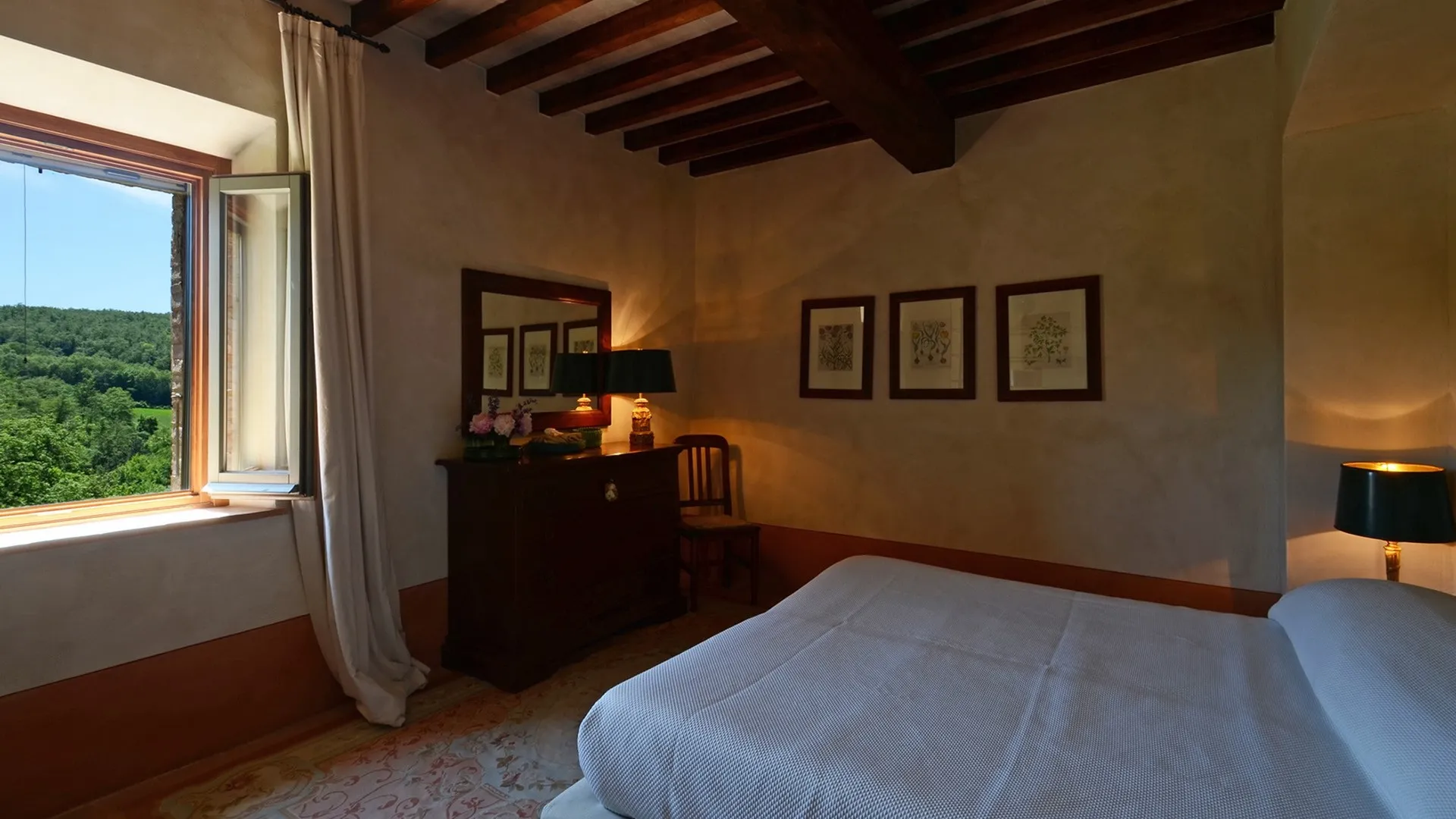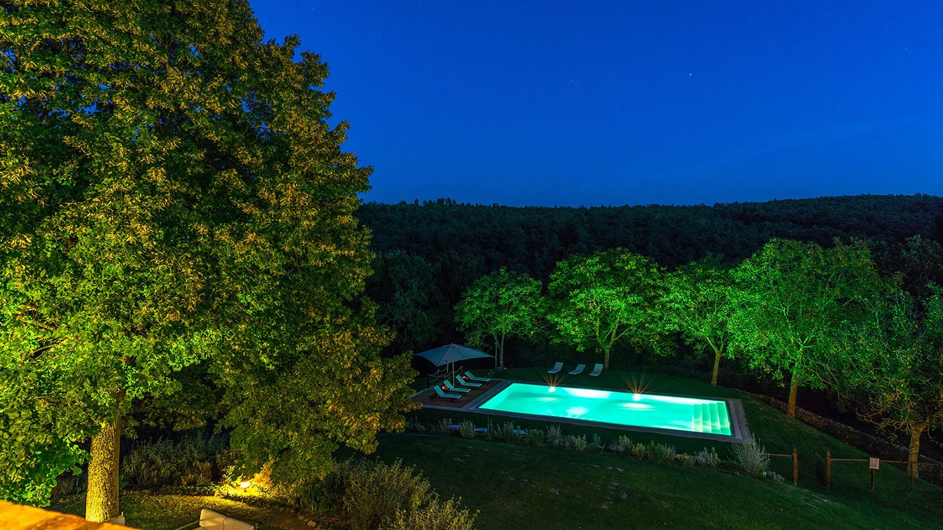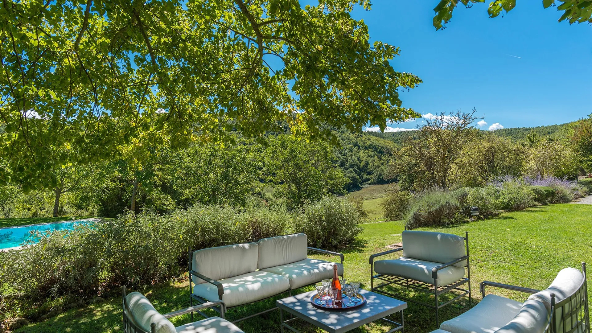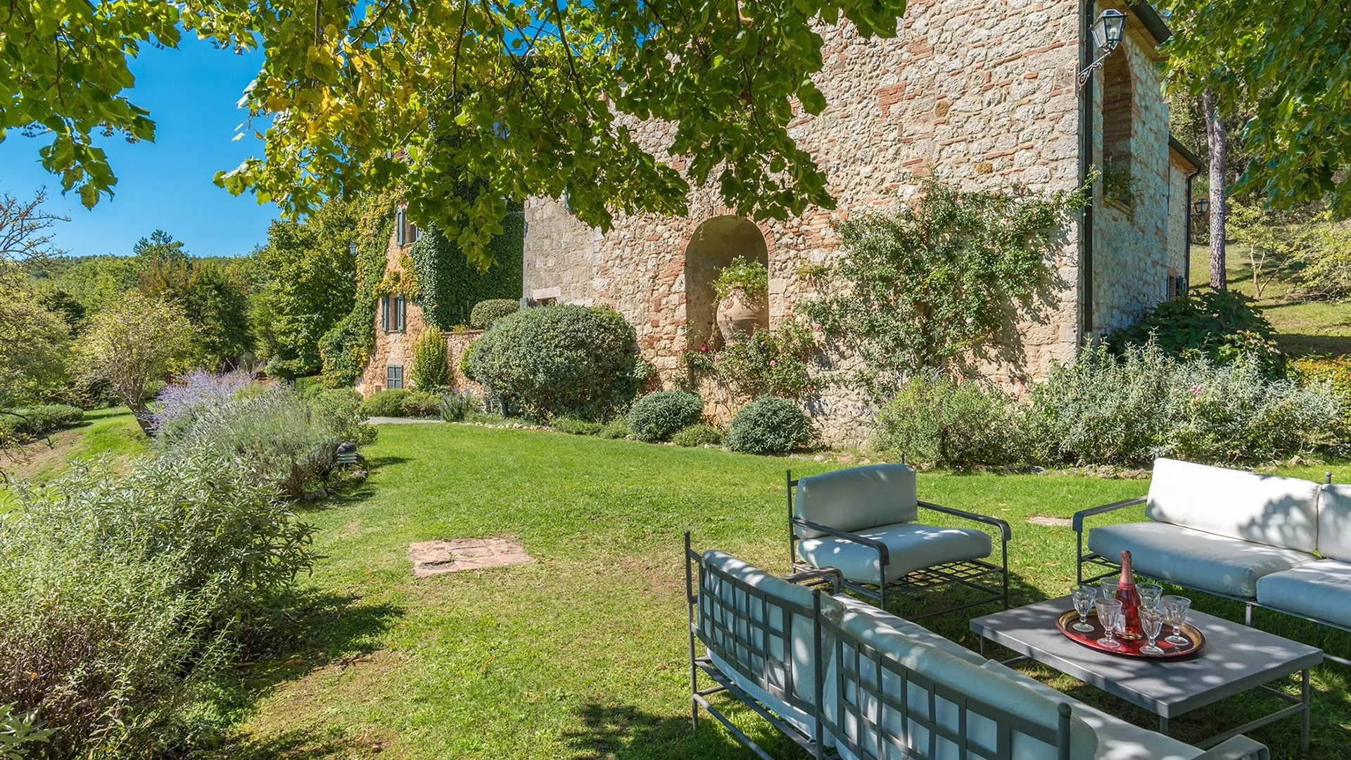 The wooded area surrounding the residence presents a unique setting, inundated with seasonal scents and stunning colours. The green, well-kept garden is spread over an area of 5000 square meters and is full of trees, flowers and herbs. The big oak tree not far from the house is the ideal place to relax with a good glass of wine. Opposite the main entrance of the house, on a lower terrace, is the panoramic swimming pool overlooking the characteristic Tuscan hills in all their splendour.Please notice that photos are taken in spring, therefore flower blossoming, and the colours of the gardens' grass could be different at the moment of your arrival at the villa.