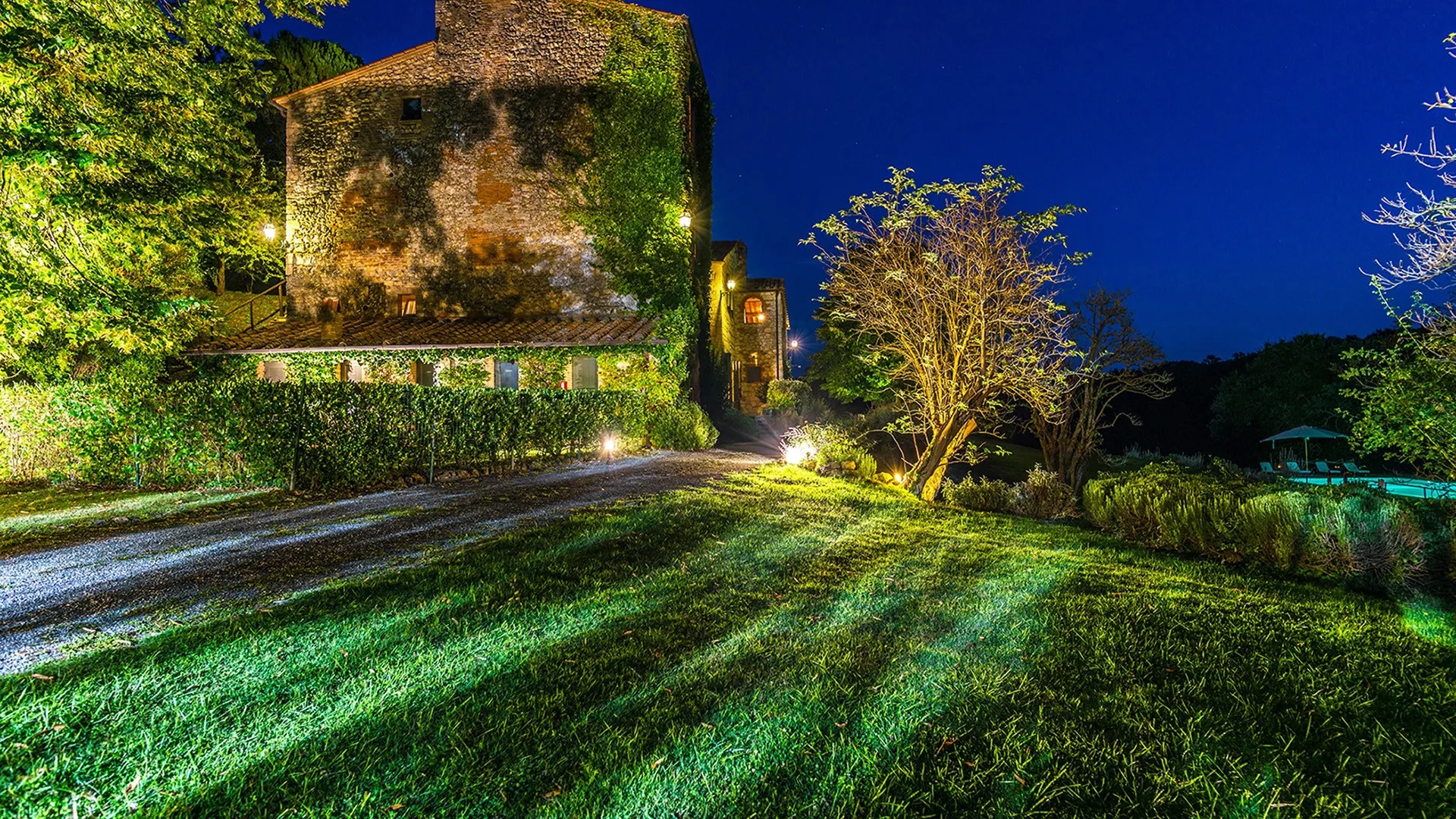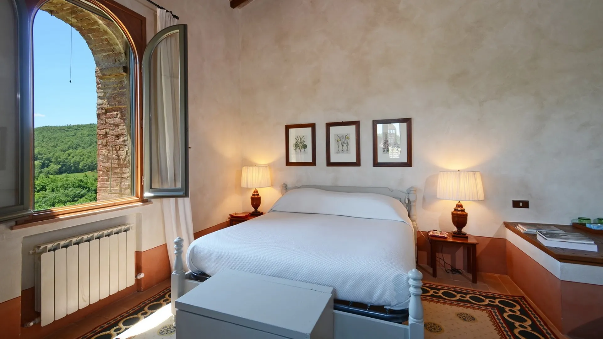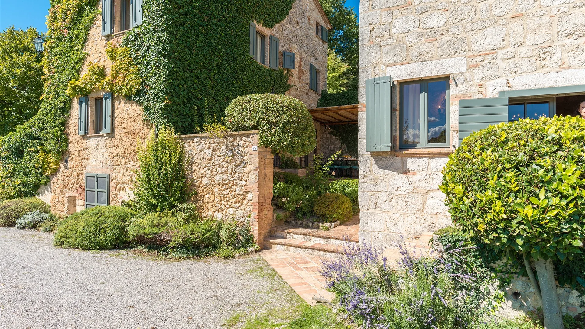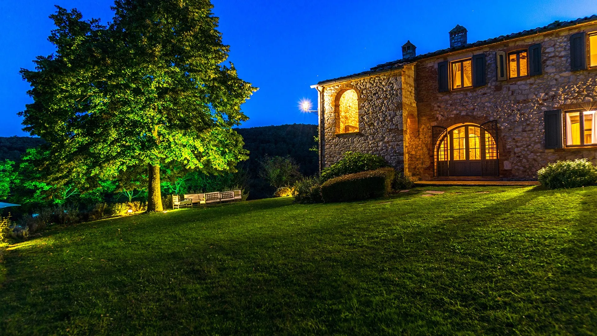 The wooded area surrounding the residence presents a unique setting, inundated with seasonal scents and stunning colours. The green, well-kept garden is spread over an area of 5000 square meters and is full of trees, flowers and herbs. The big oak tree not far from the house is the ideal place to relax with a good glass of wine. Opposite the main entrance of the house, on a lower terrace, is the panoramic swimming pool overlooking the characteristic Tuscan hills in all their splendour.Please notice that photos are taken in spring, therefore flower blossoming, and the colours of the gardens' grass could be different at the moment of your arrival at the villa.