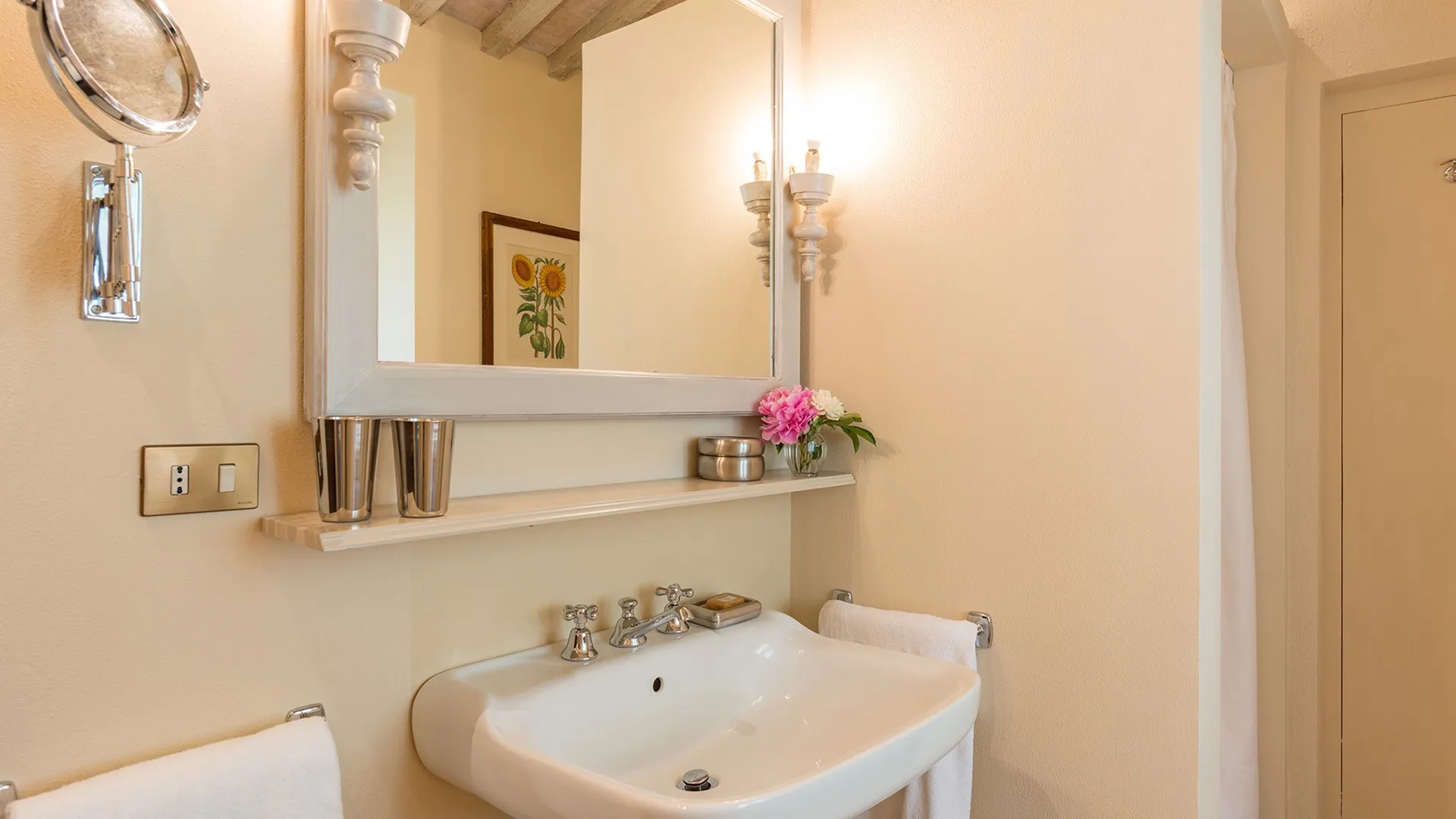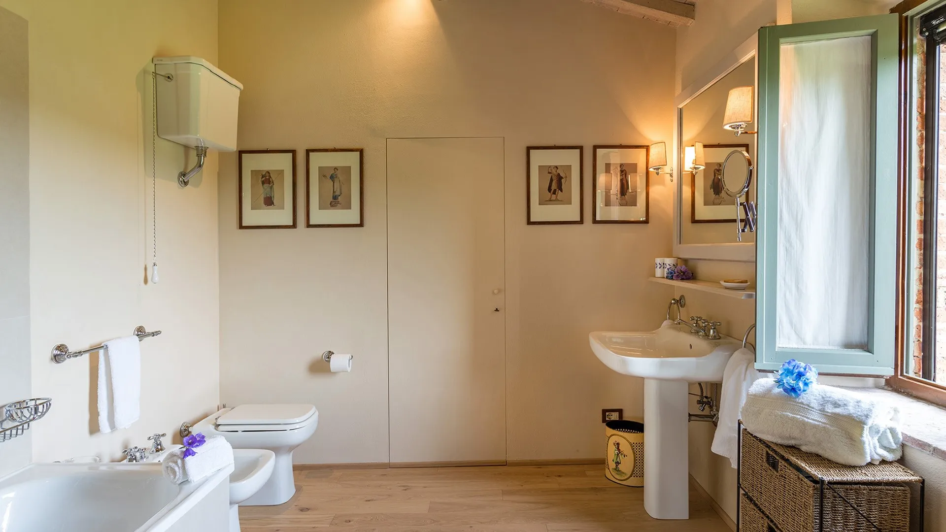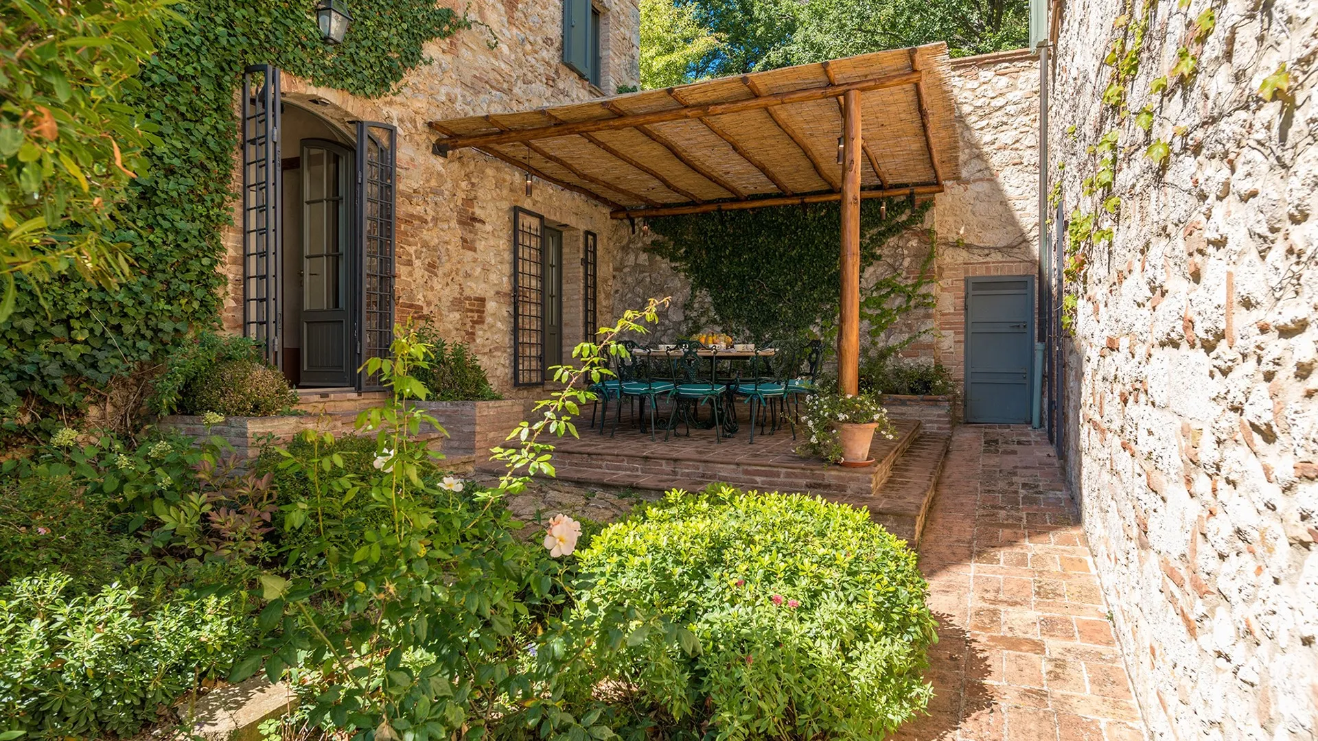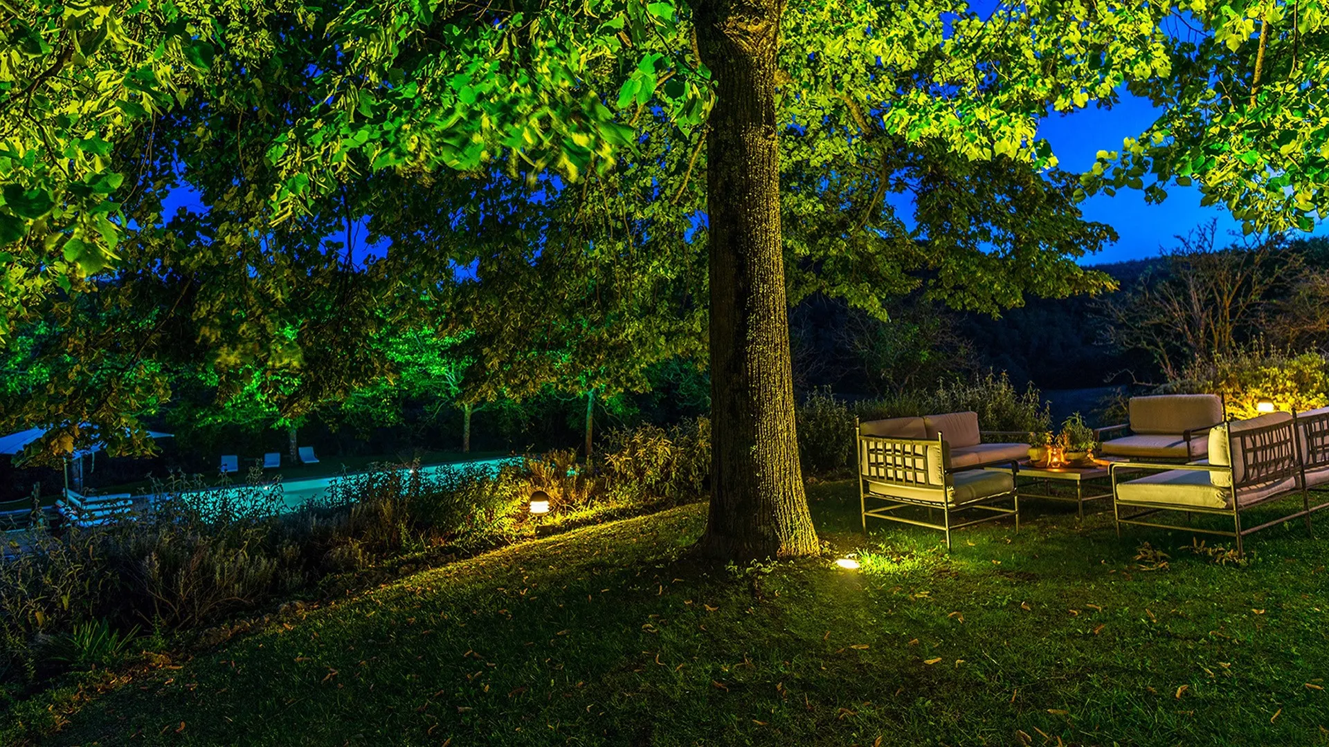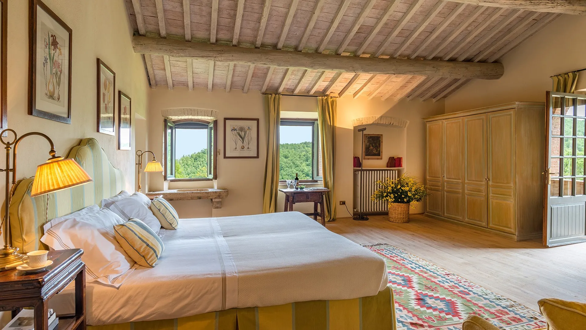 The wooded area surrounding the residence presents a unique setting, inundated with seasonal scents and stunning colours. The green, well-kept garden is spread over an area of 5000 square meters and is full of trees, flowers and herbs. The big oak tree not far from the house is the ideal place to relax with a good glass of wine. Opposite the main entrance of the house, on a lower terrace, is the panoramic swimming pool overlooking the characteristic Tuscan hills in all their splendour.Please notice that photos are taken in spring, therefore flower blossoming, and the colours of the gardens' grass could be different at the moment of your arrival at the villa.