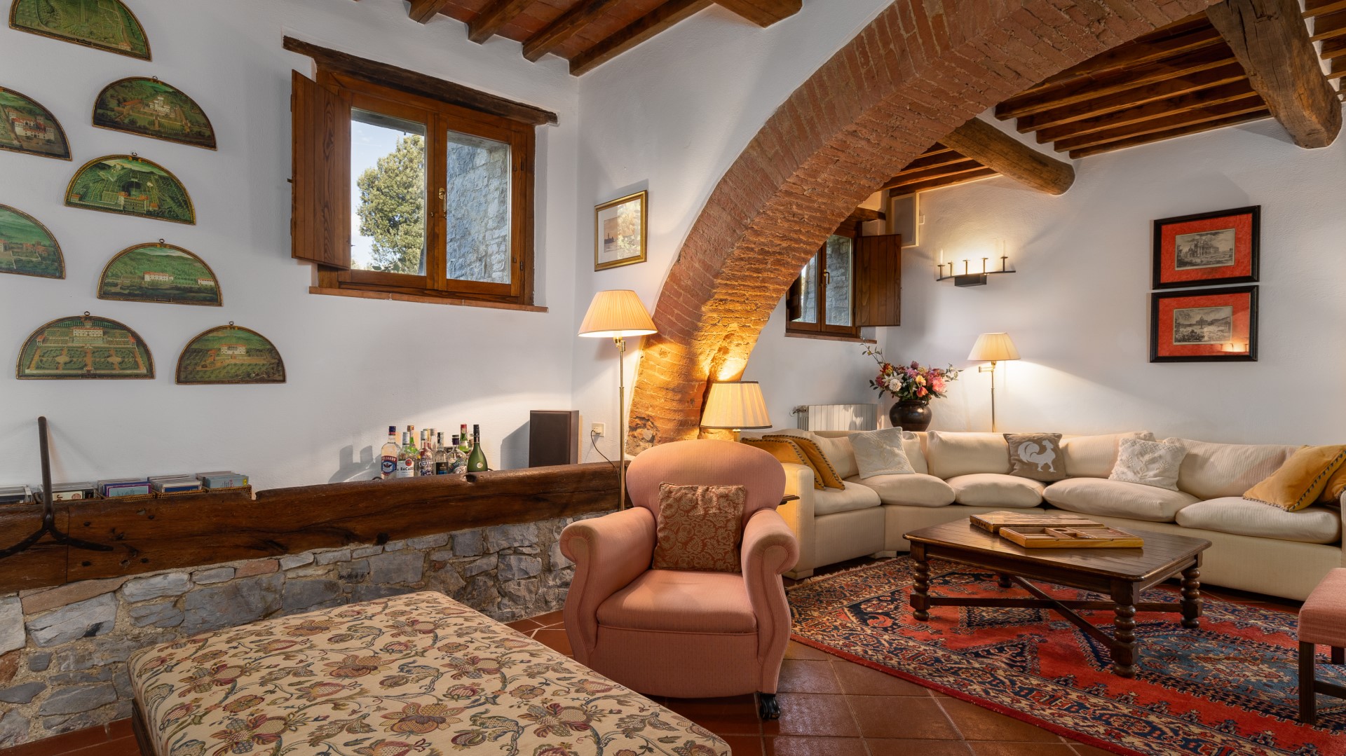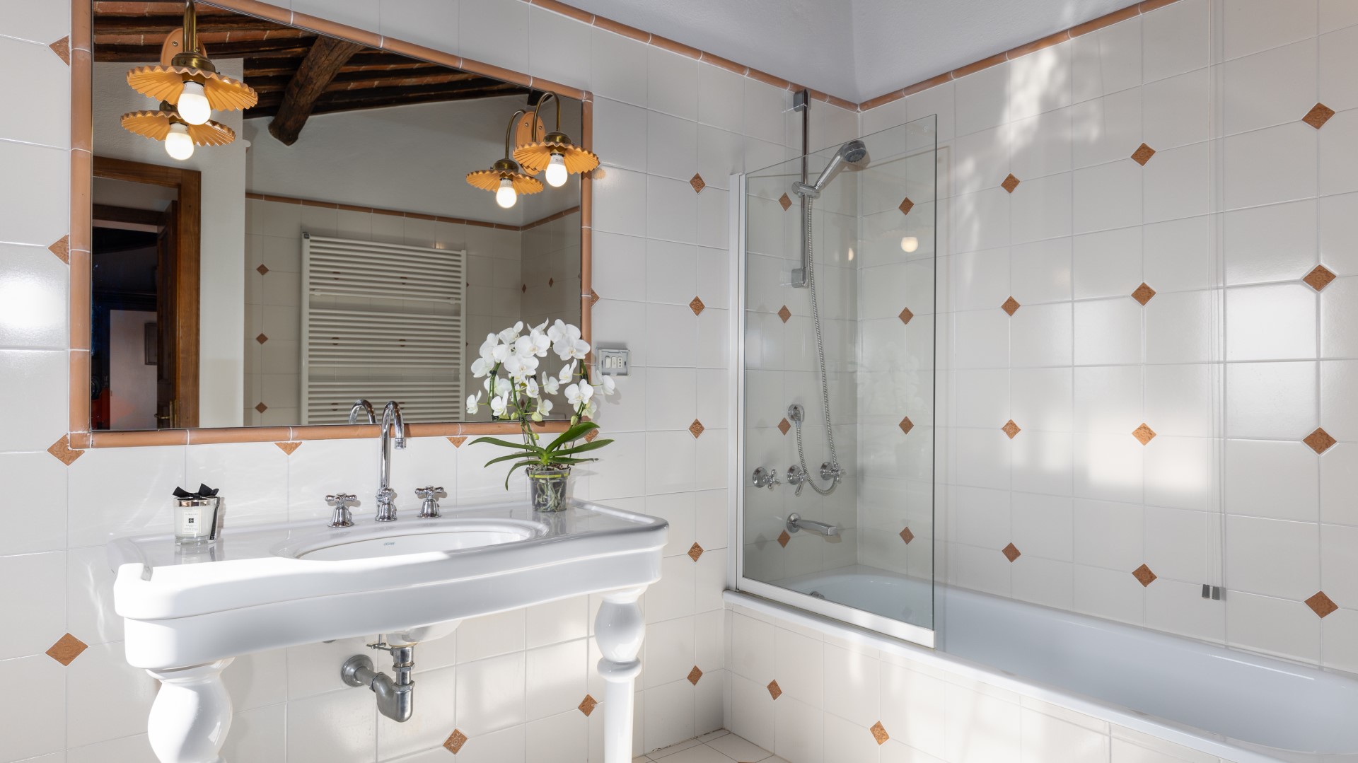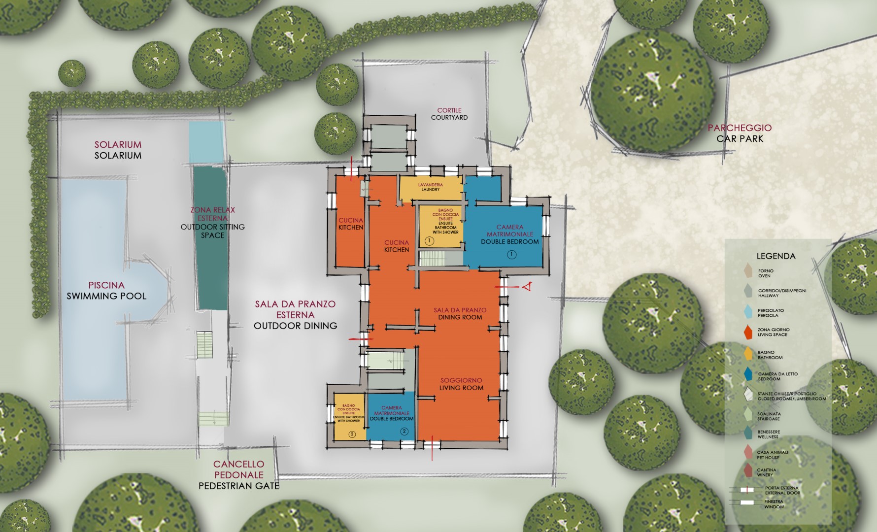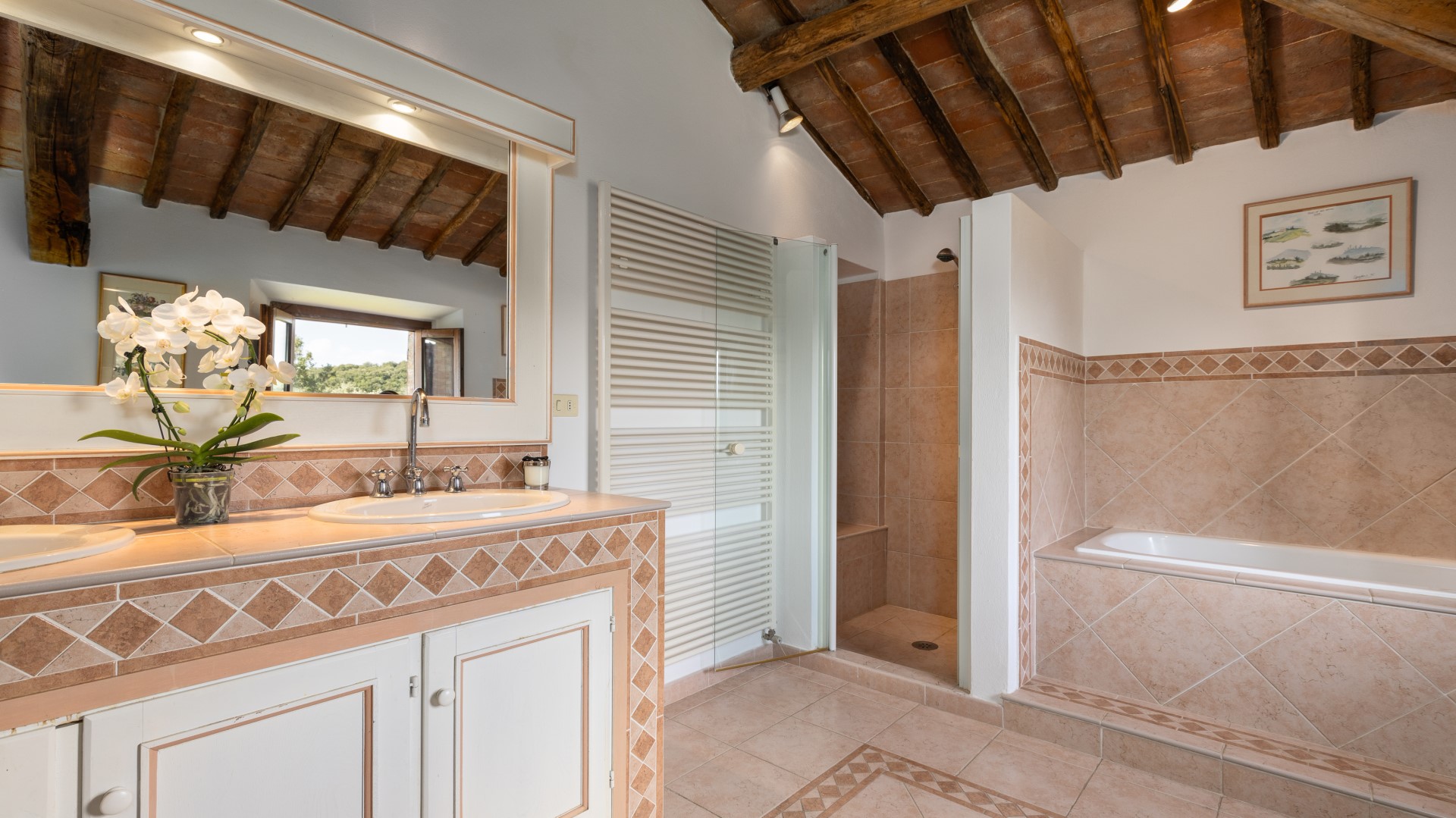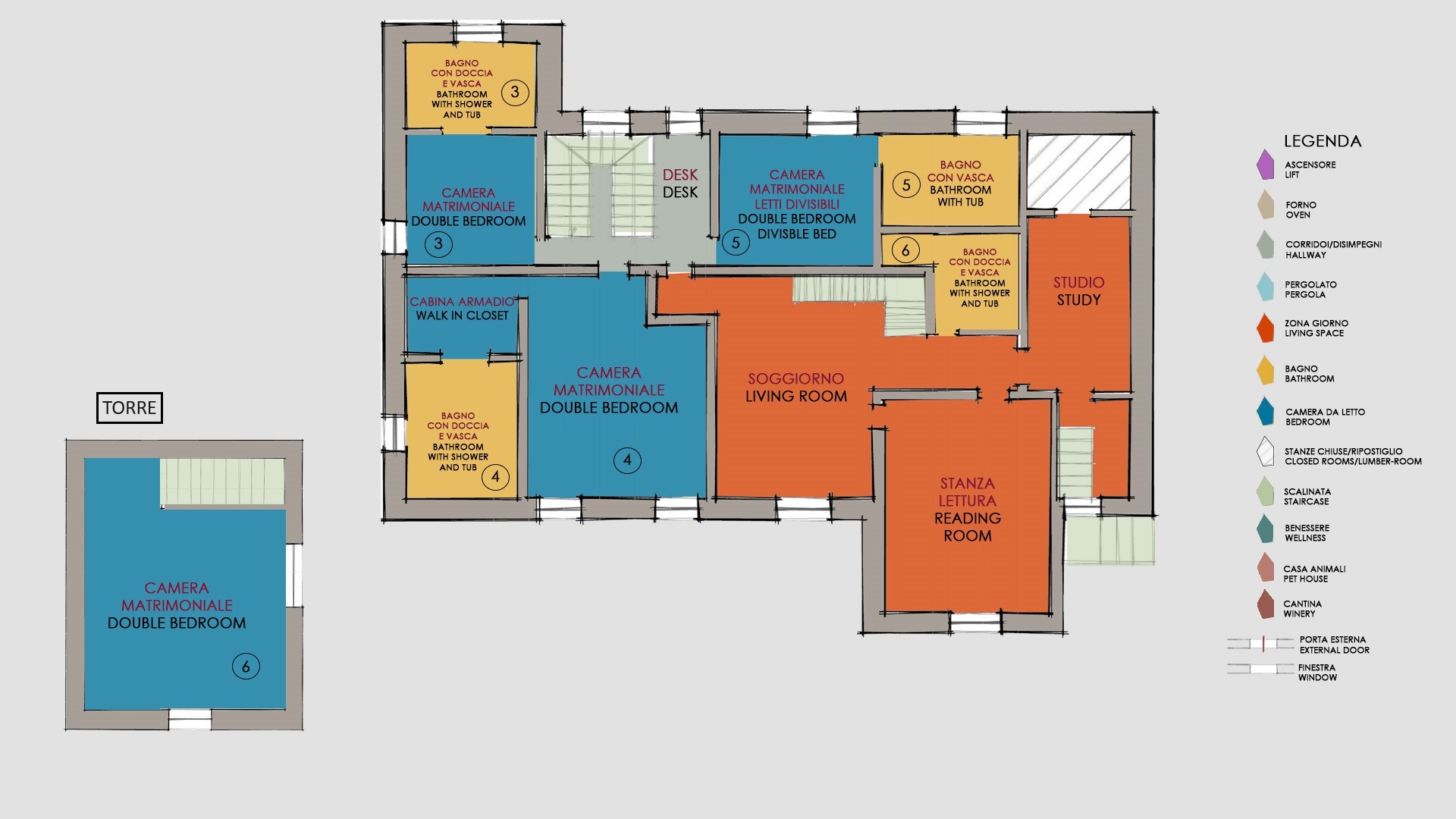 Scandelaia has two floors connected by an internal staircase, with the addition of a tower. The main entrance leads into the spacious living room, organised with a dining area, a large fireplace and an ample sitting area with sofas and television. Proceeding along a short corridor, you come to the kitchen, divided in two areas and connected to the pantry/laundry room. The floor is completed by two double bedrooms (one with divisible bed) with ensuite bathroom with tub. All the rooms on this floor lead directly into the garden; the living room and kitchen have access to the external terrace with a living area for relaxing and eating outdoors. The first floor is composed of the elegant master bedroom with private bathroom with tub and shower, a double bedroom with ensuite bathroom with tub and shower (reached down four steps), another double bedroom (with divisible bed) with ensuite bathroom with tub, a study, a sitting room and a bathroom with tub and shower serving the bedroom located in the tower, which is reached up a flight of stairs.