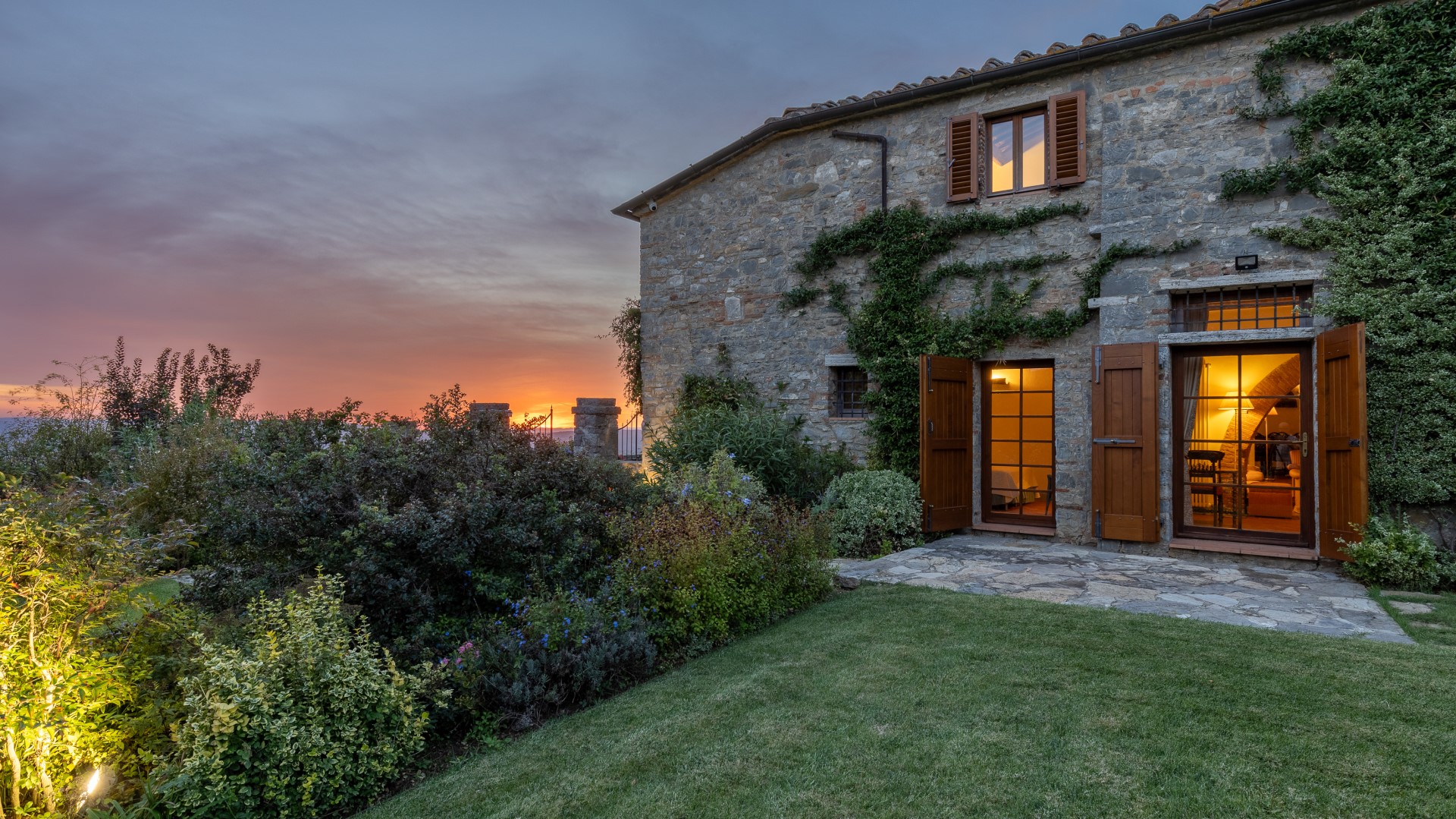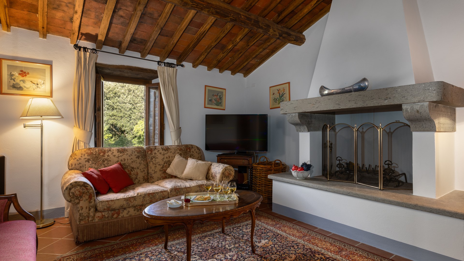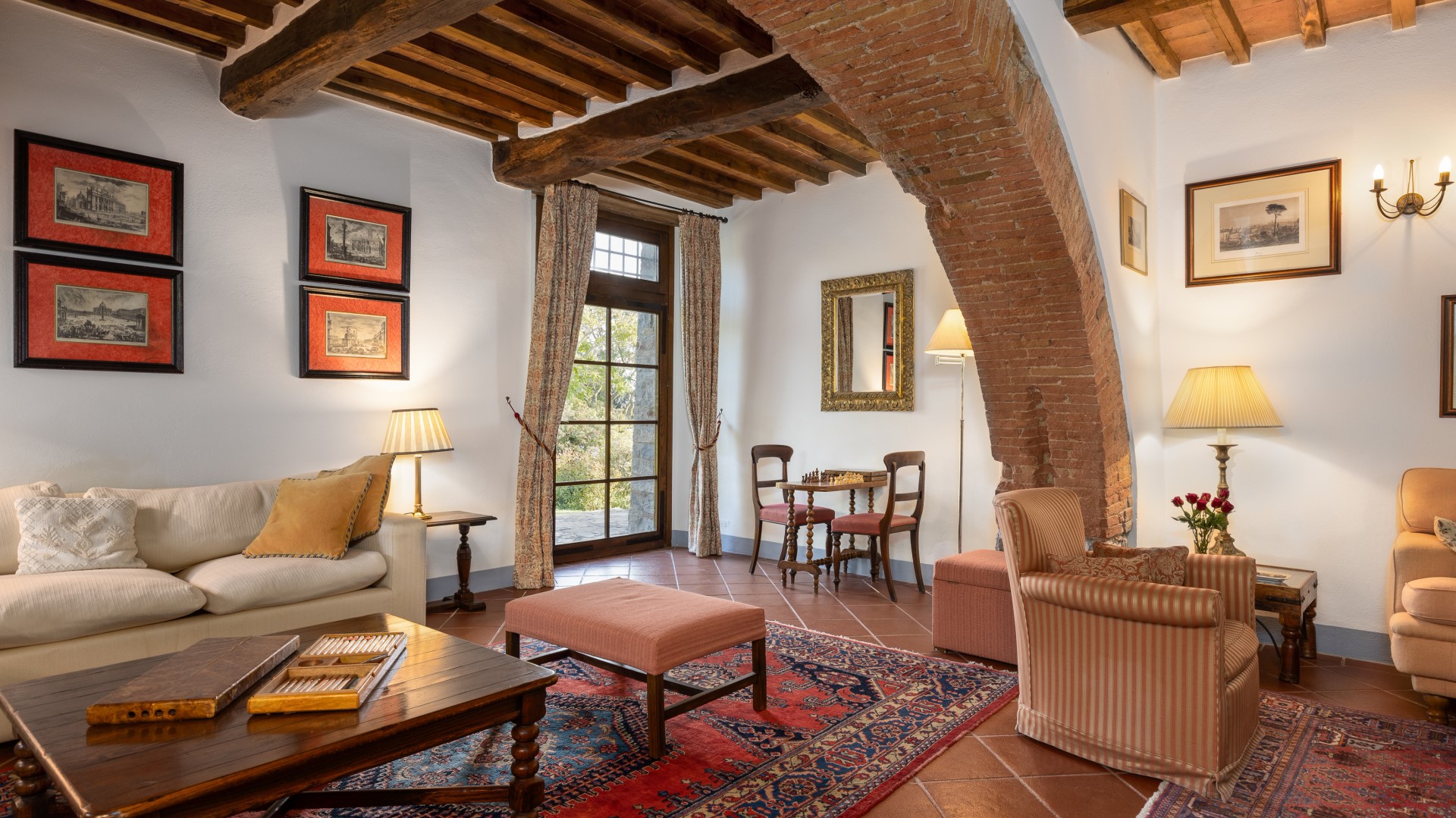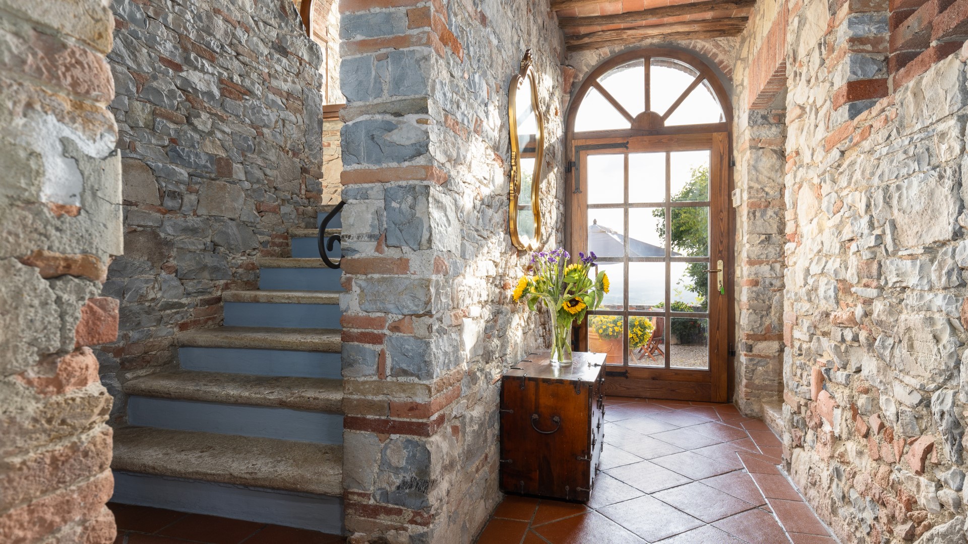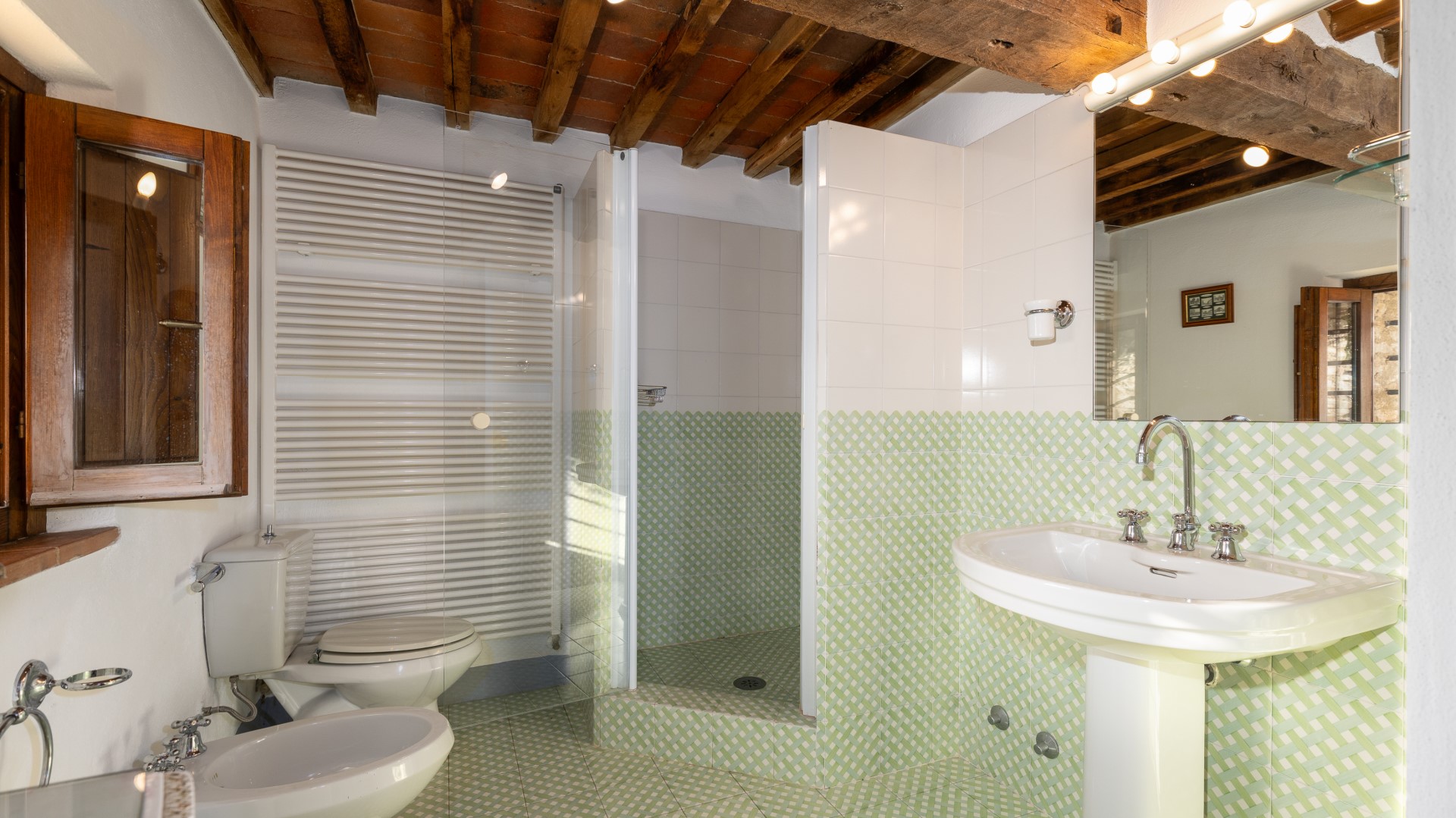 Scandelaia has two floors connected by an internal staircase, with the addition of a tower. The main entrance leads into the spacious living room, organised with a dining area, a large fireplace and an ample sitting area with sofas and television. Proceeding along a short corridor, you come to the kitchen, divided in two areas and connected to the pantry/laundry room. The floor is completed by two double bedrooms (one with divisible bed) with ensuite bathroom with tub. All the rooms on this floor lead directly into the garden; the living room and kitchen have access to the external terrace with a living area for relaxing and eating outdoors. The first floor is composed of the elegant master bedroom with private bathroom with tub and shower, a double bedroom with ensuite bathroom with tub and shower (reached down four steps), another double bedroom (with divisible bed) with ensuite bathroom with tub, a study, a sitting room and a bathroom with tub and shower serving the bedroom located in the tower, which is reached up a flight of stairs.