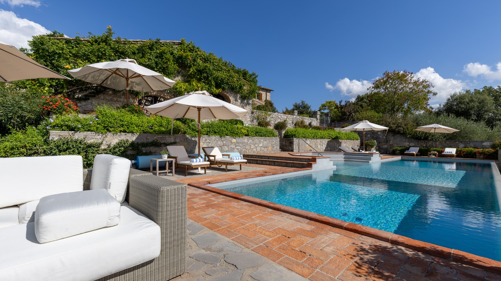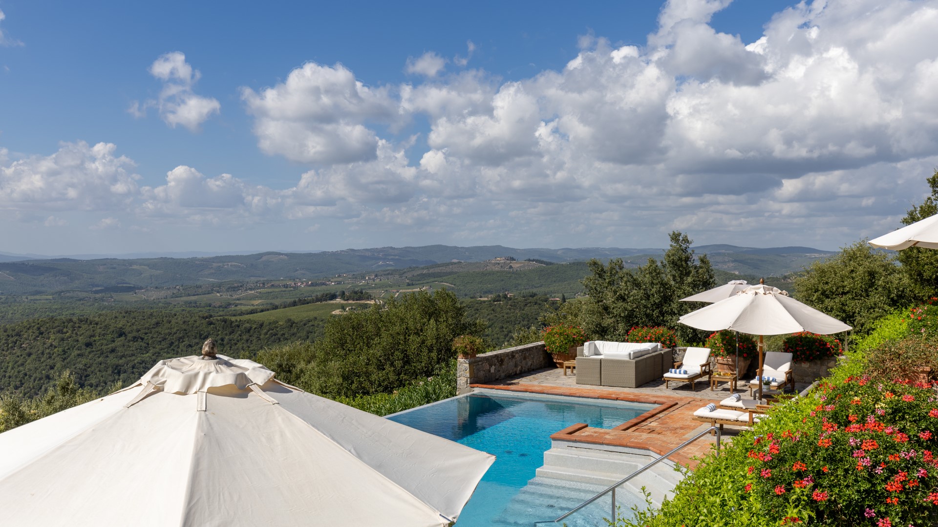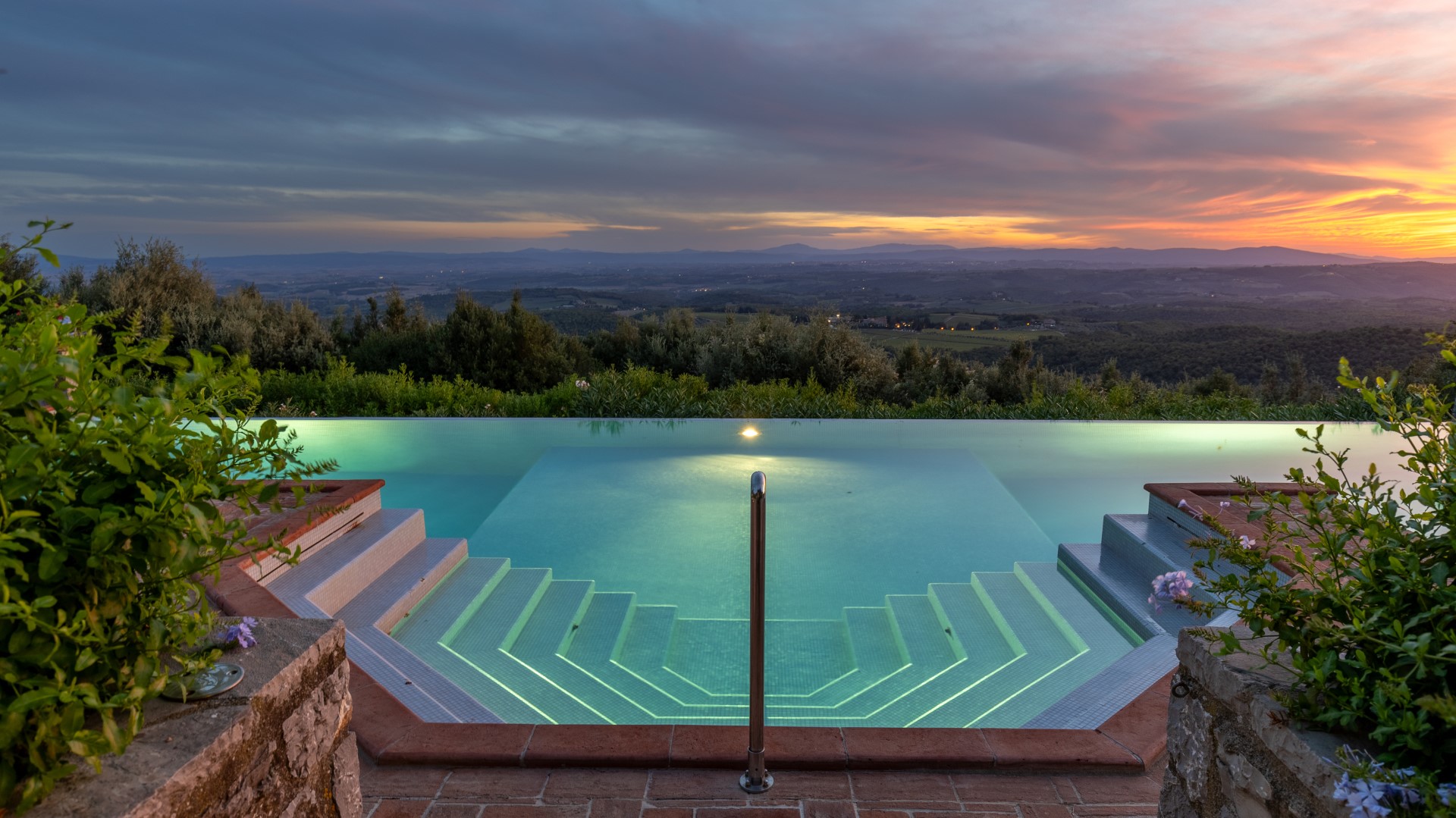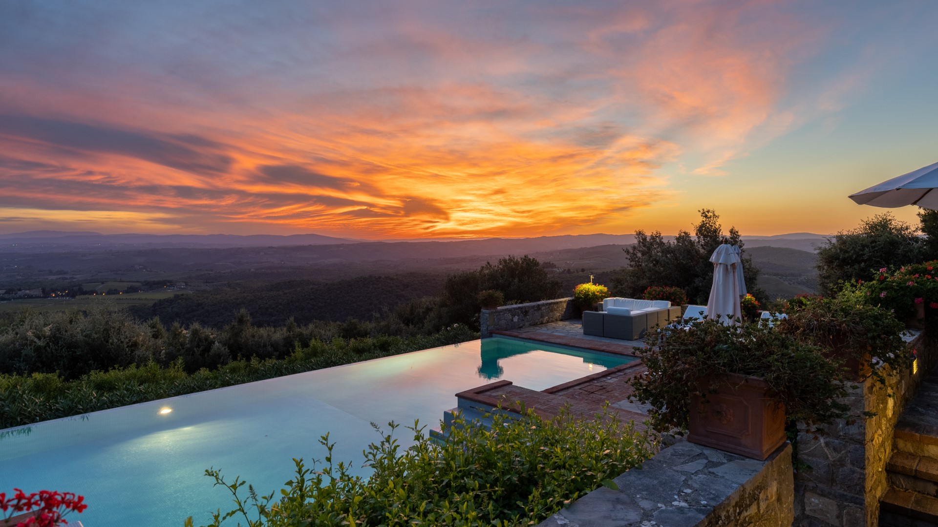 The infinity pool occupies a front row seat in the heart of the garden and in the most panoramic point of the property: facing south-west it offers magnificent sunsets over the Chianti hills. Set on the lower terrace of the park, it can be reached from the villa, which is about 30 m away, down one of the two flights of steps located on both sides of the area. This spectacular rectangular pool, measuring 5 x 17 m with the depth ranging from 1.5 m in the centre up to 2.5 m on both sides, is lined with mosaic and has Roman steps with a handrail for access and a cover for the night. The beautiful, terracotta-paved solarium which surrounds it, bordered by flowerbeds of geraniums, oleanders and blue plumbago bushes, is equipped with umbrellas, a sitting area and elegant sunbeds; on one side is a cold-water shower. The pool is sanitised with salt and can also be used at night thanks to the lighting both inside and outside the pool. It is available from the last Saturday in April until the first Saturday in October.