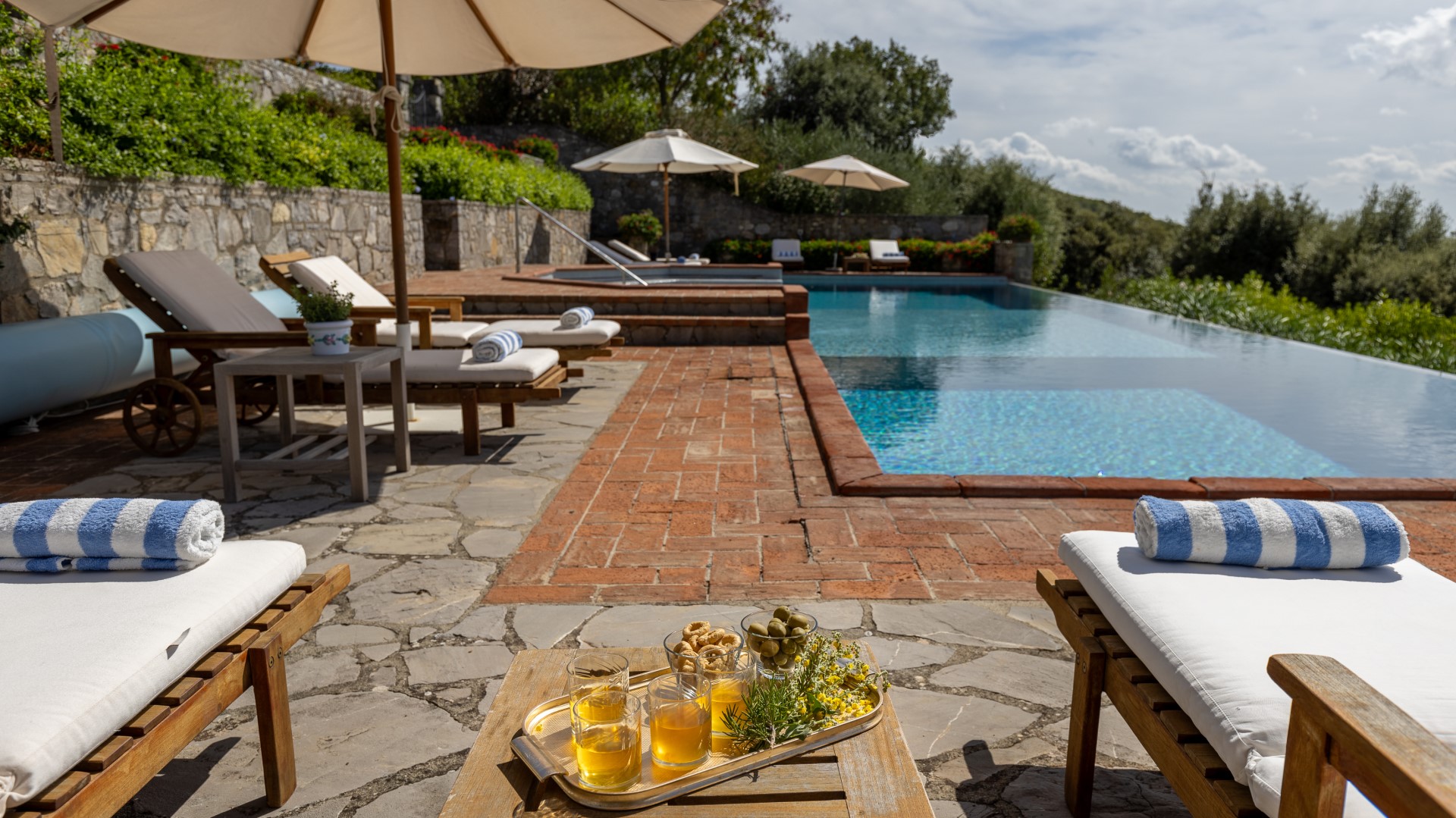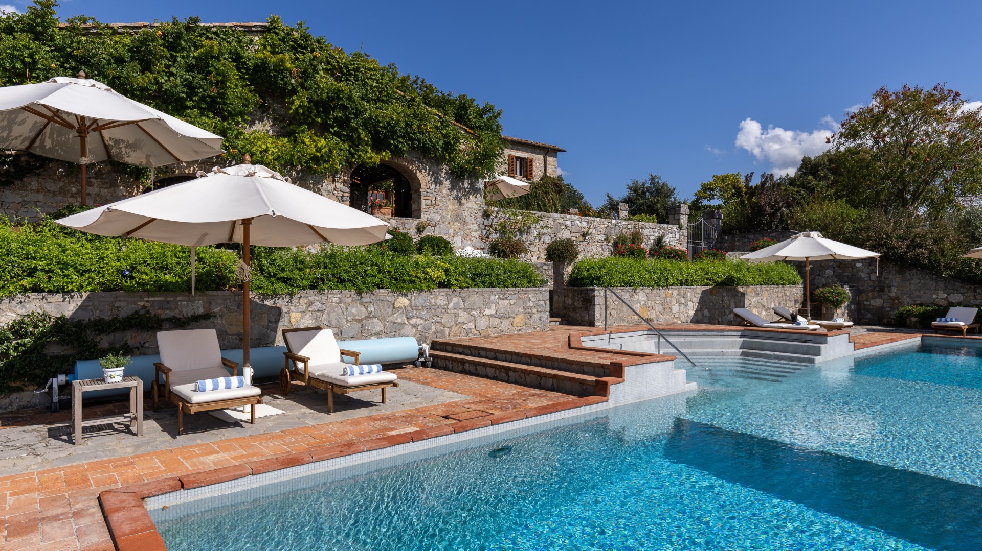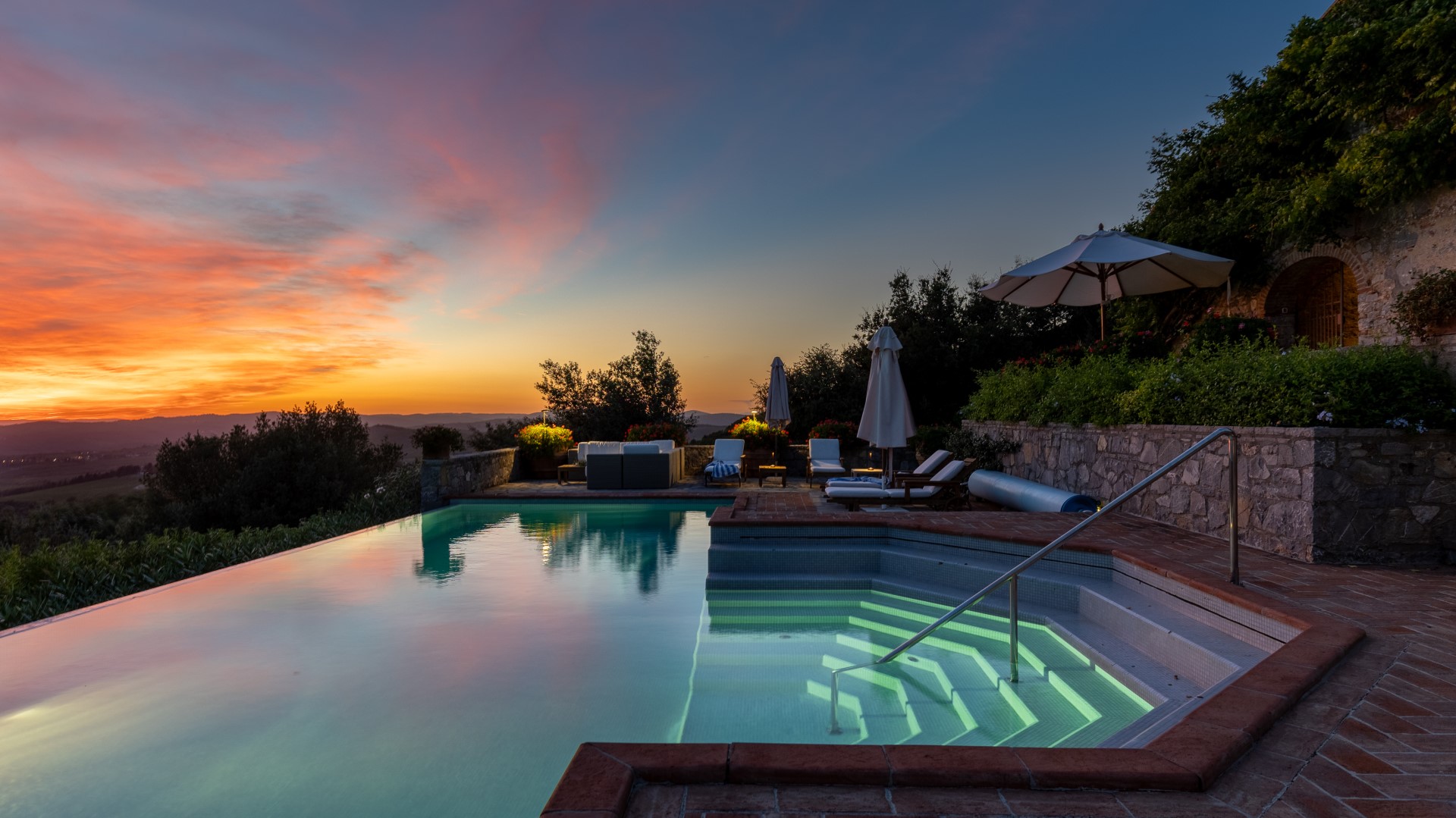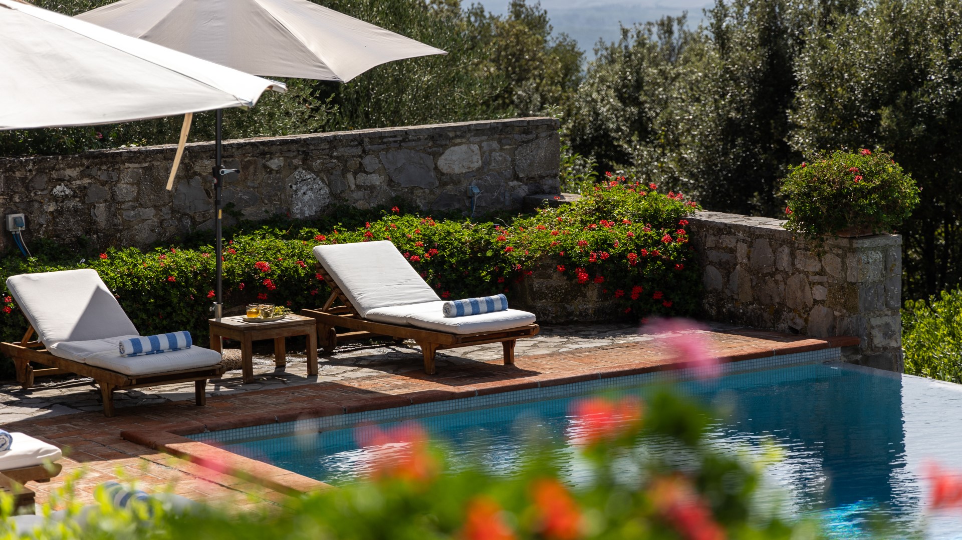 The infinity pool occupies a front row seat in the heart of the garden and in the most panoramic point of the property: facing south-west it offers magnificent sunsets over the Chianti hills. Set on the lower terrace of the park, it can be reached from the villa, which is about 30 m away, down one of the two flights of steps located on both sides of the area. This spectacular rectangular pool, measuring 5 x 17 m with the depth ranging from 1.5 m in the centre up to 2.5 m on both sides, is lined with mosaic and has Roman steps with a handrail for access and a cover for the night. The beautiful, terracotta-paved solarium which surrounds it, bordered by flowerbeds of geraniums, oleanders and blue plumbago bushes, is equipped with umbrellas, a sitting area and elegant sunbeds; on one side is a cold-water shower. The pool is sanitised with salt and can also be used at night thanks to the lighting both inside and outside the pool. It is available from the last Saturday in April until the first Saturday in October.