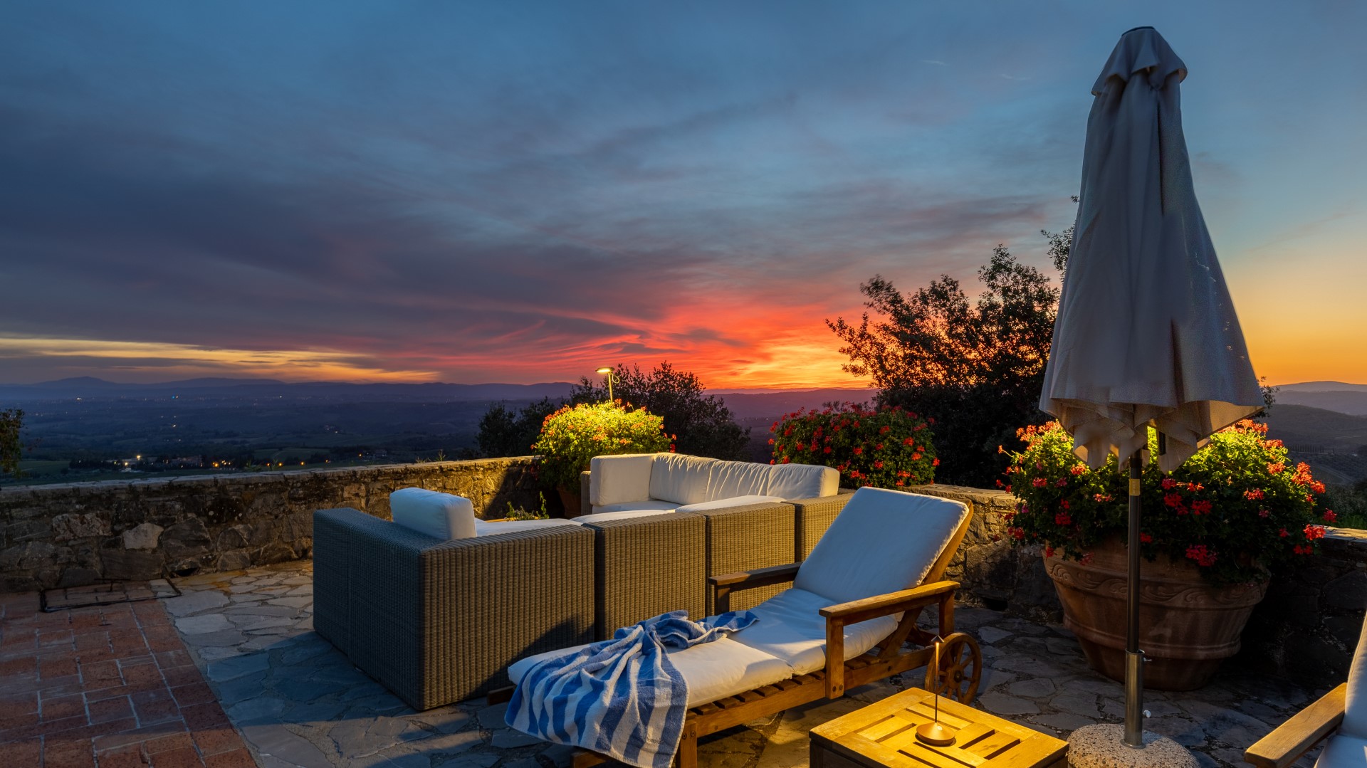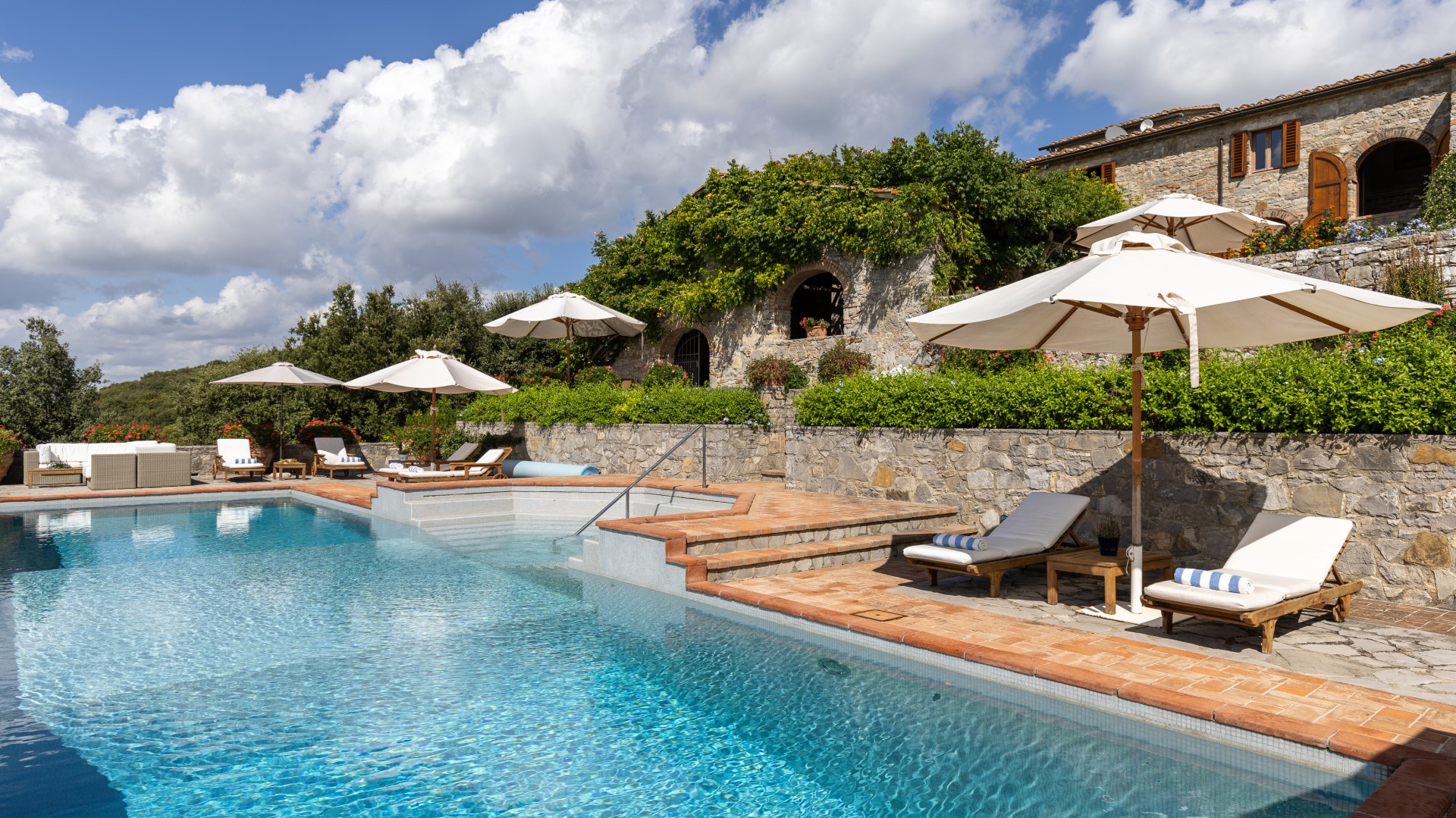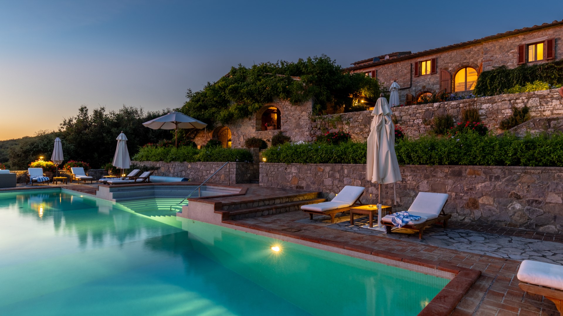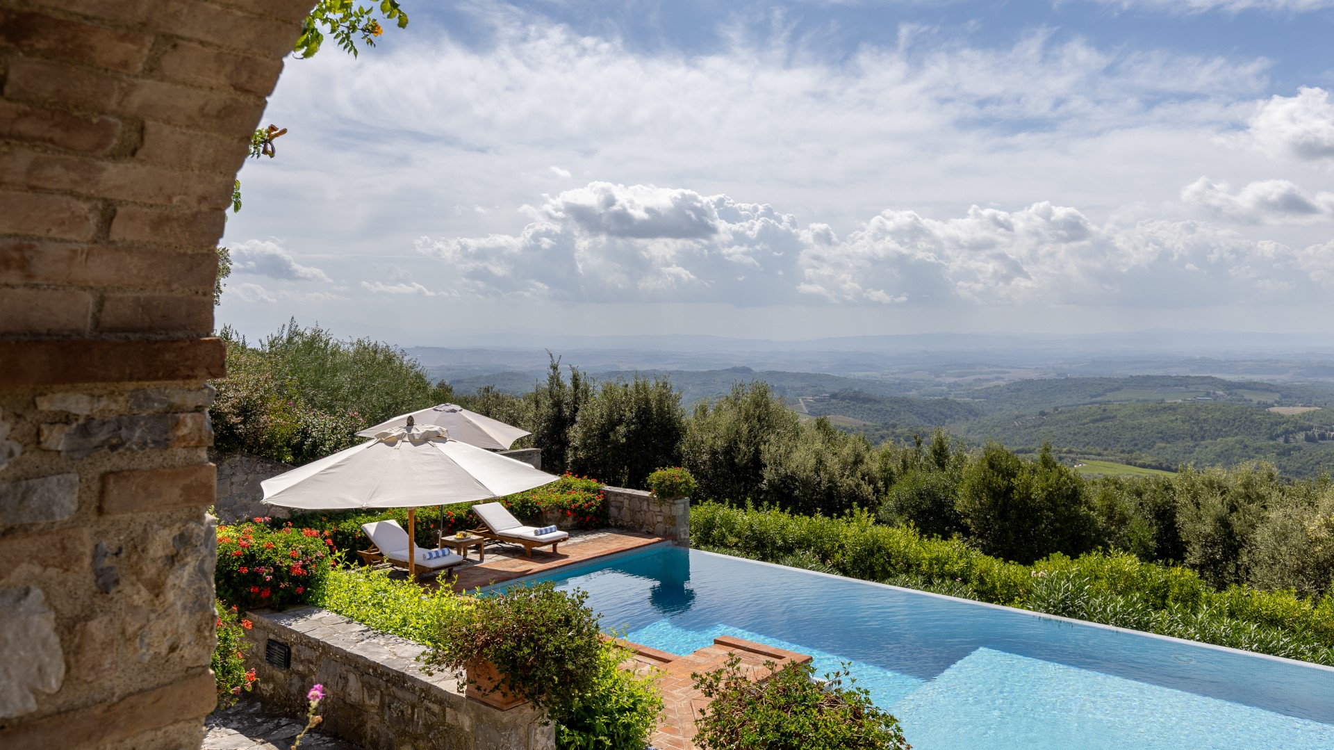 The infinity pool occupies a front row seat in the heart of the garden and in the most panoramic point of the property: facing south-west it offers magnificent sunsets over the Chianti hills. Set on the lower terrace of the park, it can be reached from the villa, which is about 30 m away, down one of the two flights of steps located on both sides of the area. This spectacular rectangular pool, measuring 5 x 17 m with the depth ranging from 1.5 m in the centre up to 2.5 m on both sides, is lined with mosaic and has Roman steps with a handrail for access and a cover for the night. The beautiful, terracotta-paved solarium which surrounds it, bordered by flowerbeds of geraniums, oleanders and blue plumbago bushes, is equipped with umbrellas, a sitting area and elegant sunbeds; on one side is a cold-water shower. The pool is sanitised with salt and can also be used at night thanks to the lighting both inside and outside the pool. It is available from the last Saturday in April until the first Saturday in October.