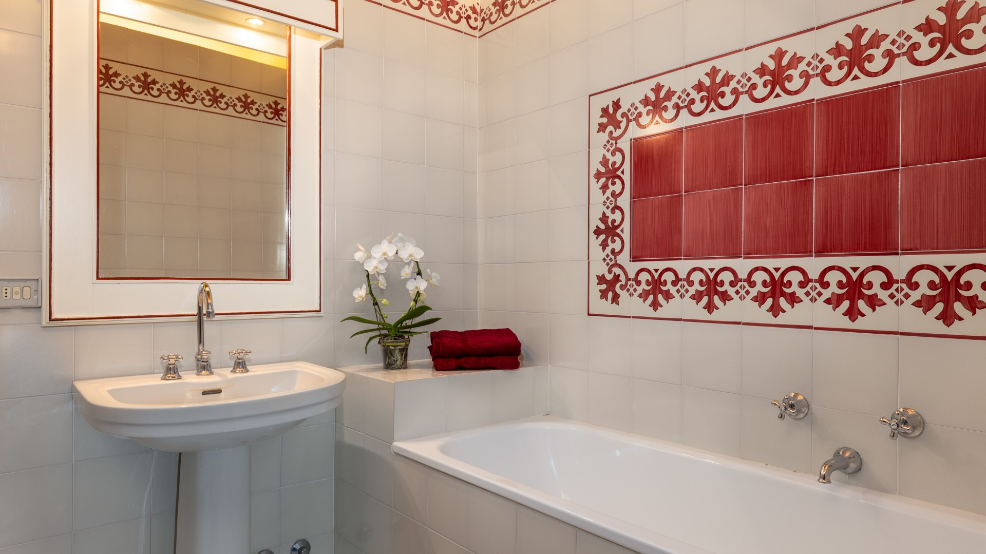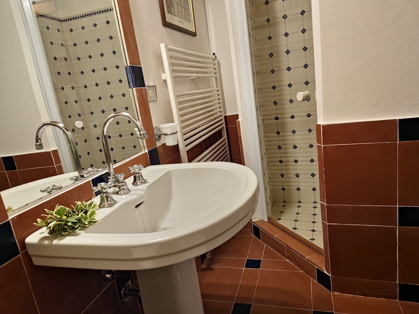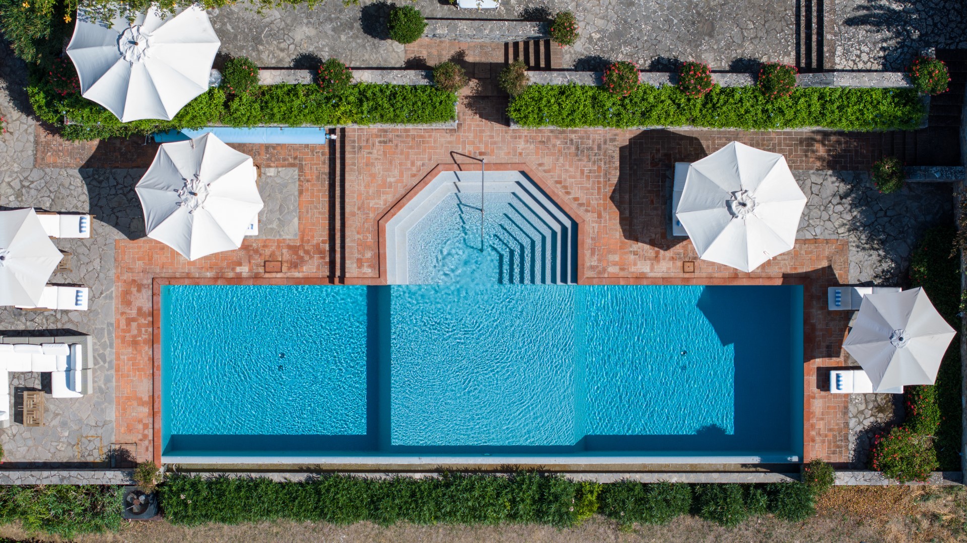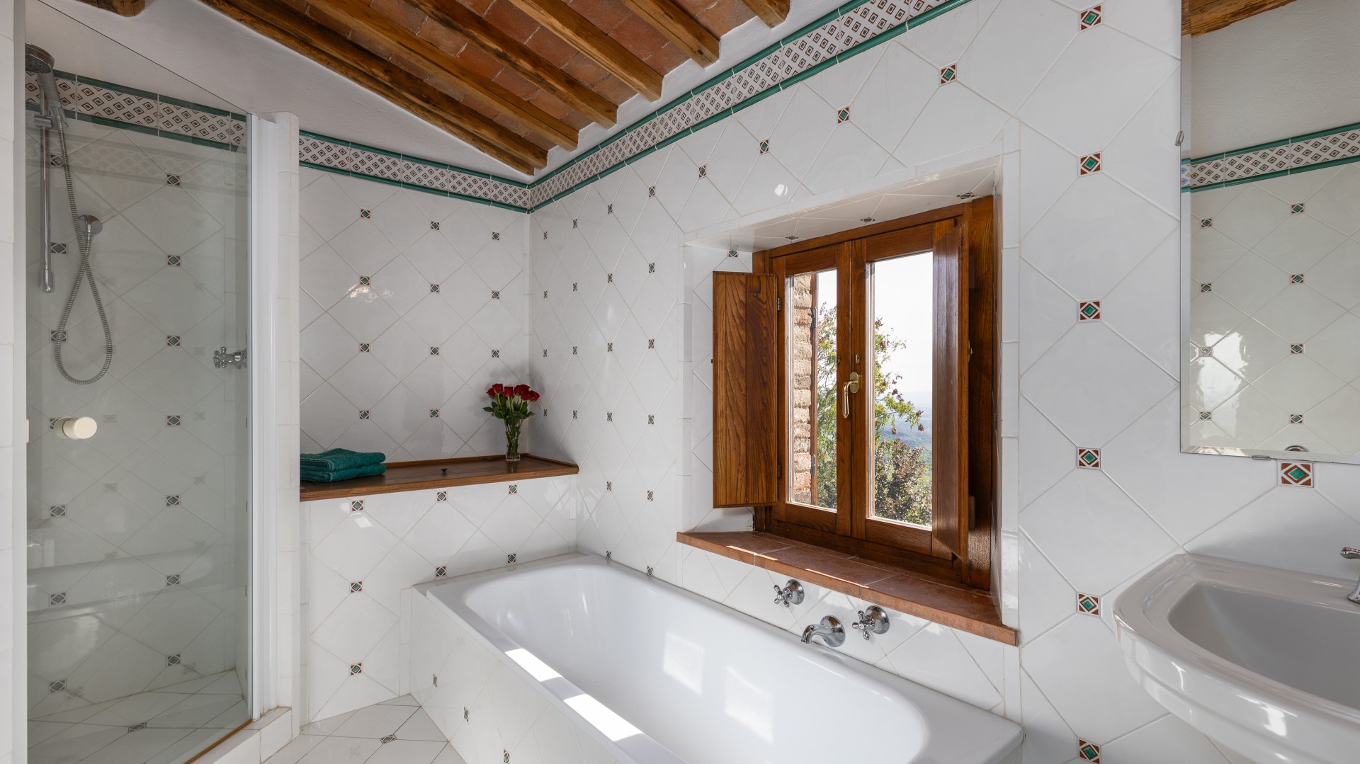 The infinity pool occupies a front row seat in the heart of the garden and in the most panoramic point of the property: facing south-west it offers magnificent sunsets over the Chianti hills. Set on the lower terrace of the park, it can be reached from the villa, which is about 30 m away, down one of the two flights of steps located on both sides of the area. This spectacular rectangular pool, measuring 5 x 17 m with the depth ranging from 1.5 m in the centre up to 2.5 m on both sides, is lined with mosaic and has Roman steps with a handrail for access and a cover for the night. The beautiful, terracotta-paved solarium which surrounds it, bordered by flowerbeds of geraniums, oleanders and blue plumbago bushes, is equipped with umbrellas, a sitting area and elegant sunbeds; on one side is a cold-water shower. The pool is sanitised with salt and can also be used at night thanks to the lighting both inside and outside the pool. It is available from the last Saturday in April until the first Saturday in October.