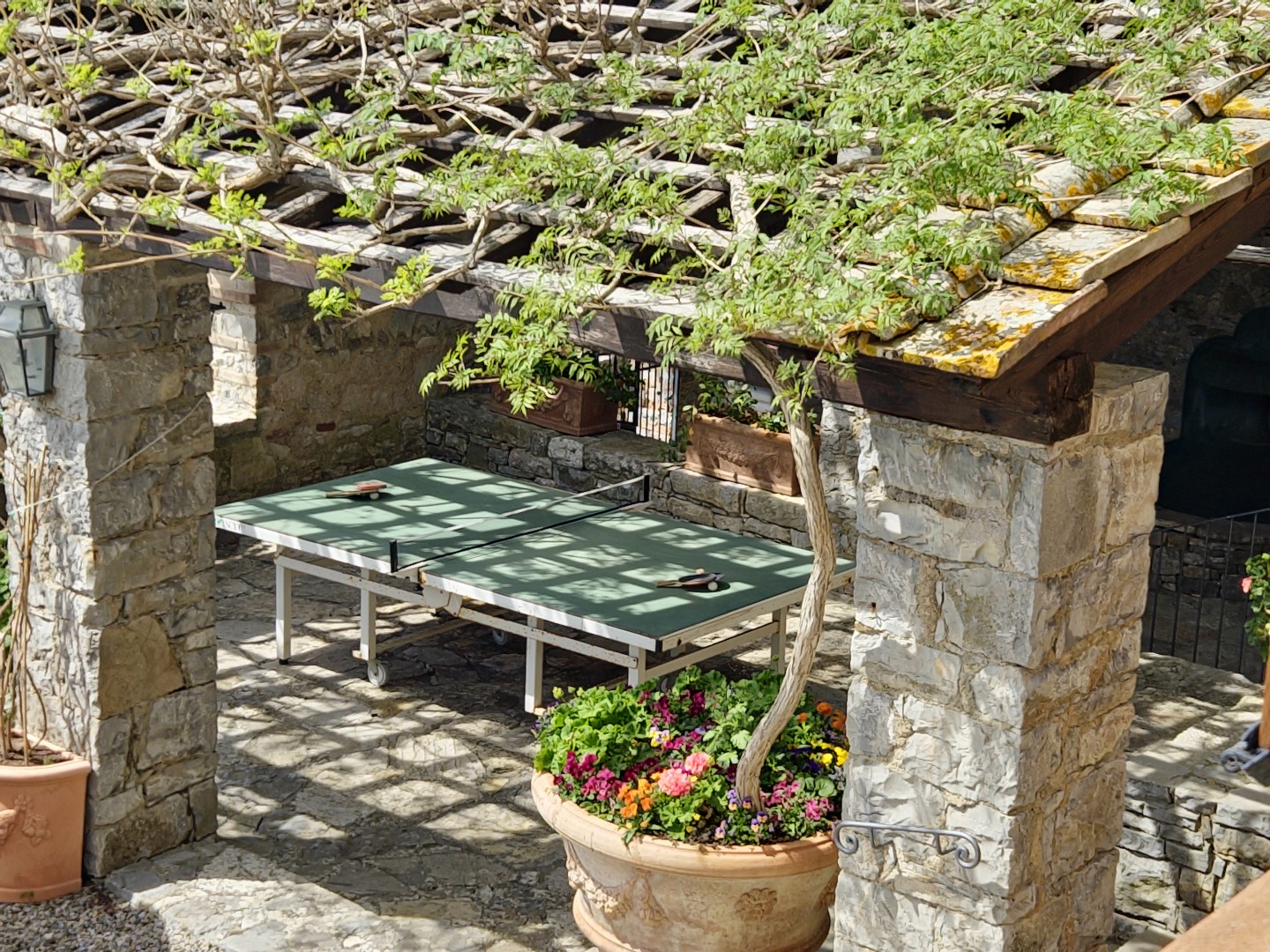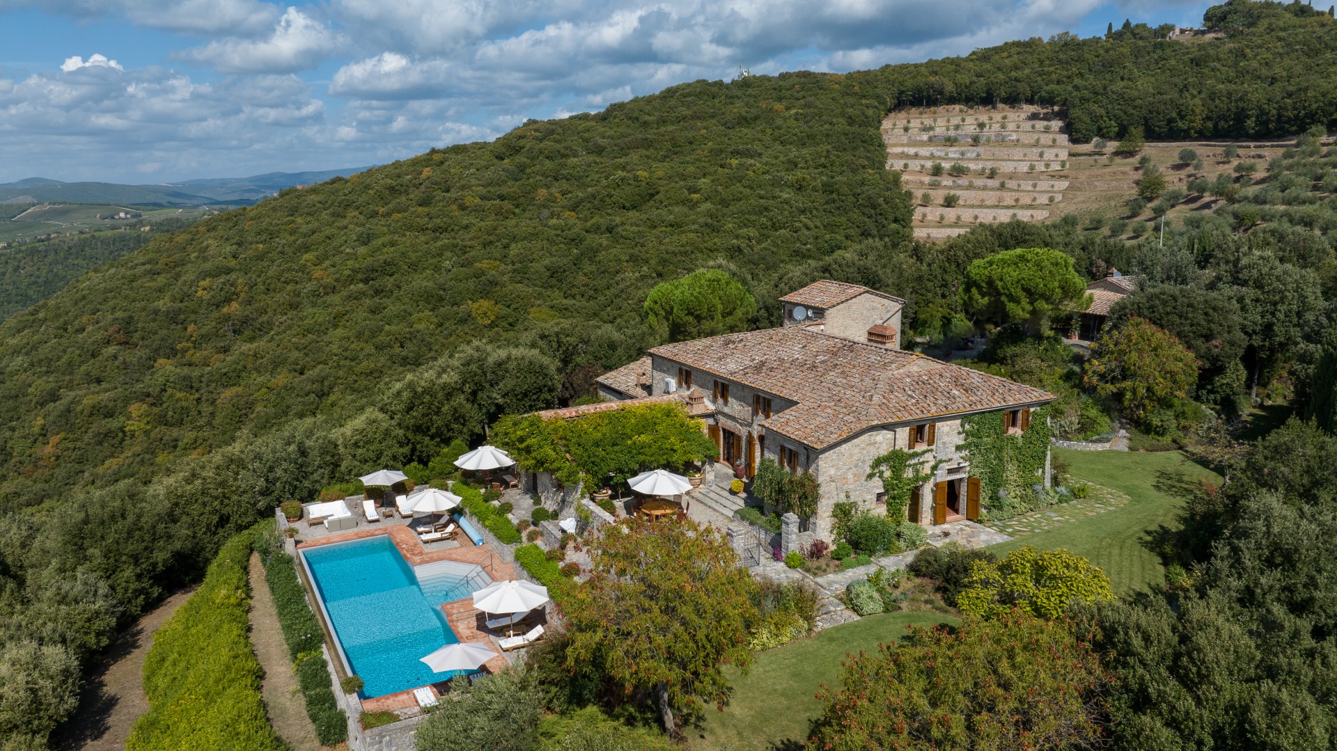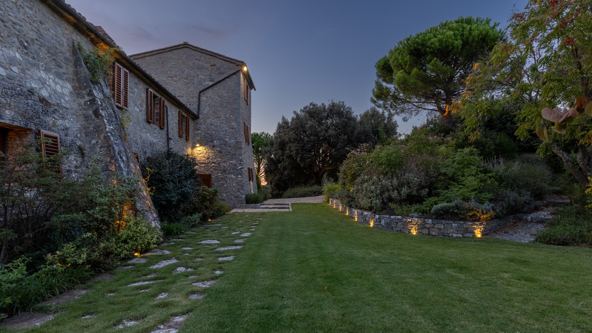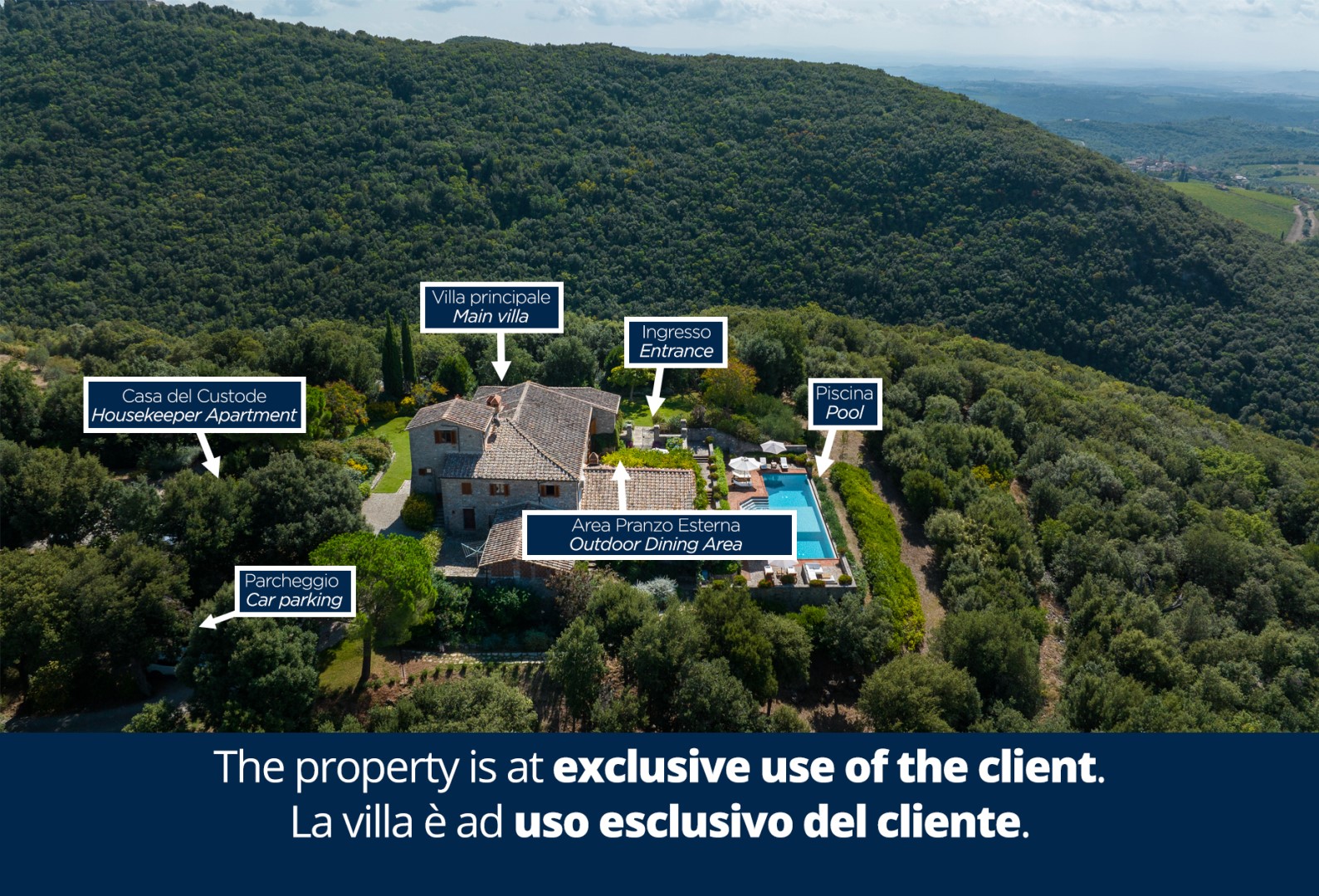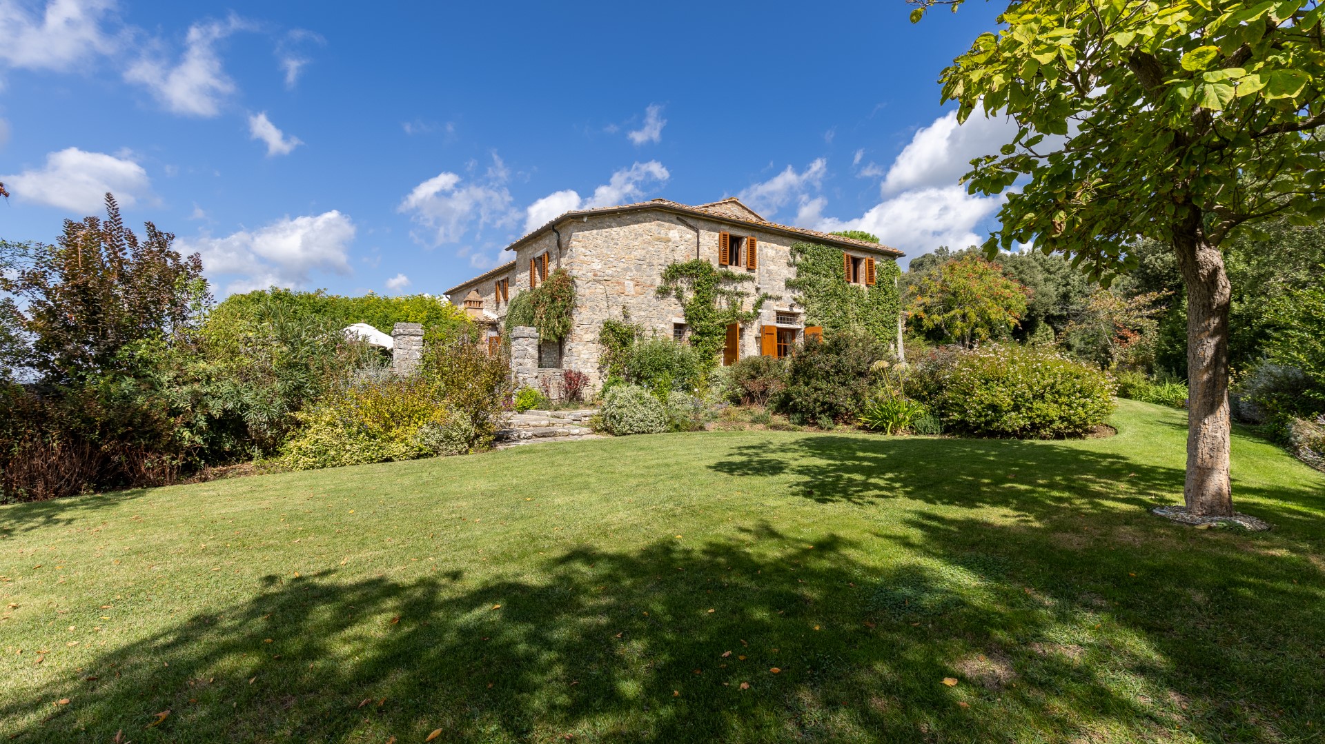 Just under 40 hectares of land delimit the immense spaces of this estate, an authentic green lung where an extensive patch of woodland (for the most part walkable) alternates with garrisons of olive trees planted along a terraced ridge. At the centre lies the majestic fenced park that frames the villa, extending for approximately one hectare on several well-connected levels which guarantee total and continuous use of all the set-up areas. Walking through it, along paved paths, stone steps and grassy surfaces, you come to a true botanical garden, designed to always be in bloom and enlivened by a multitude of variegated flowers and tall trees: lavender and rosemary bushes, agapantus, passion fruit, climbing roses, oleanders, geraniums, blue plumbago and rows of hydrangeas that border a wonderful path that encircles the villa. From the electric gate, at the end of a beautiful avenue of cypresses and then a short driveway leading to the parking area, you come to the charming entrance of the villa, surrounded by climbing ivy and wisteria. At the back is a large area with a table for outdoor dining, protected by a large umbrella, a barbecue, a ping pong table and various relaxation areas. The lower terrace, reached down two flights of steps, contains the beautiful pool area.Please notice that photos are taken in spring, therefore flower blossoming, and the colours of the gardens' grass could be different at the moment of your arrival at the villa.