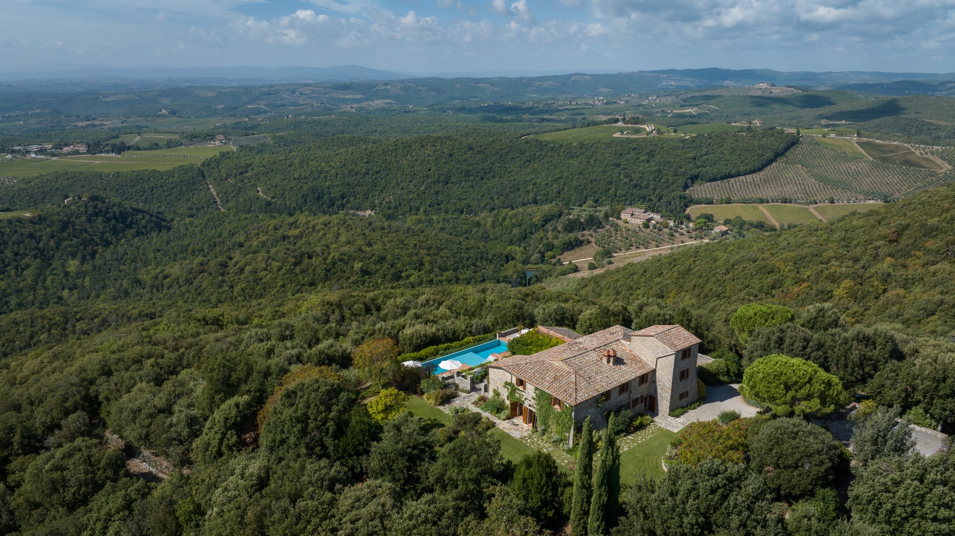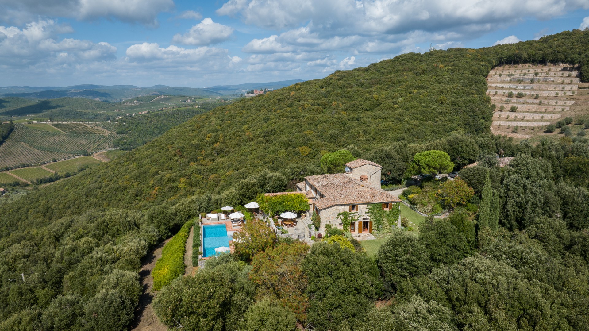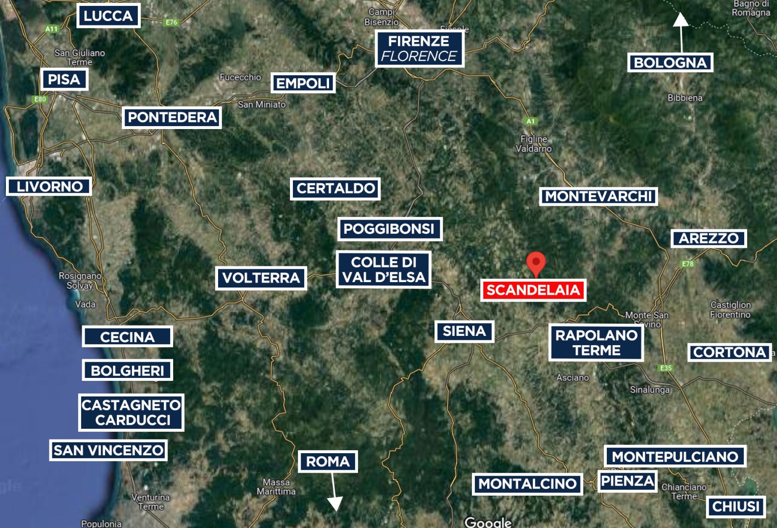 From the top of its hilly position, 547 m above sea level, Scandelaia stands as sentinel of an unparalleled landscape, capturing in all its depth the alluring, never-ending scenery which, stretching across the sinuous Chianti hills on which lie tiny villages of age-old charm, ends on the ancient towers of Siena and on the verdant peaks of the Colline Metallifere.