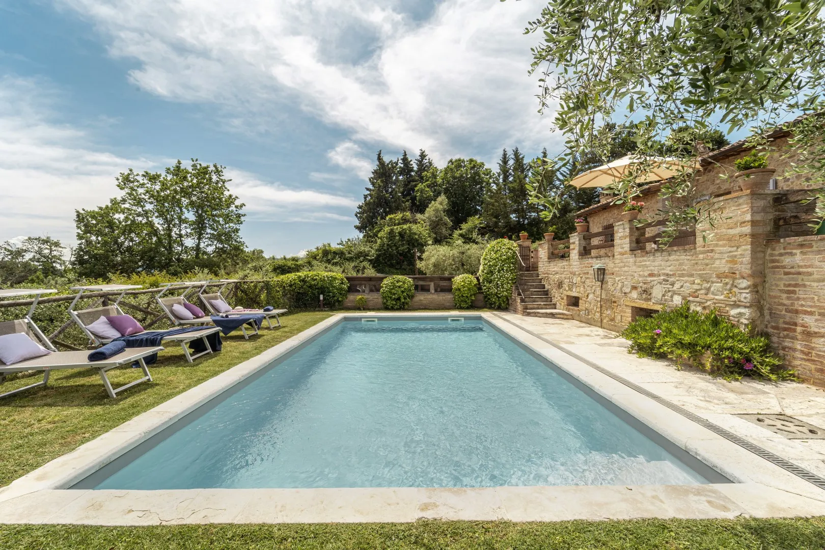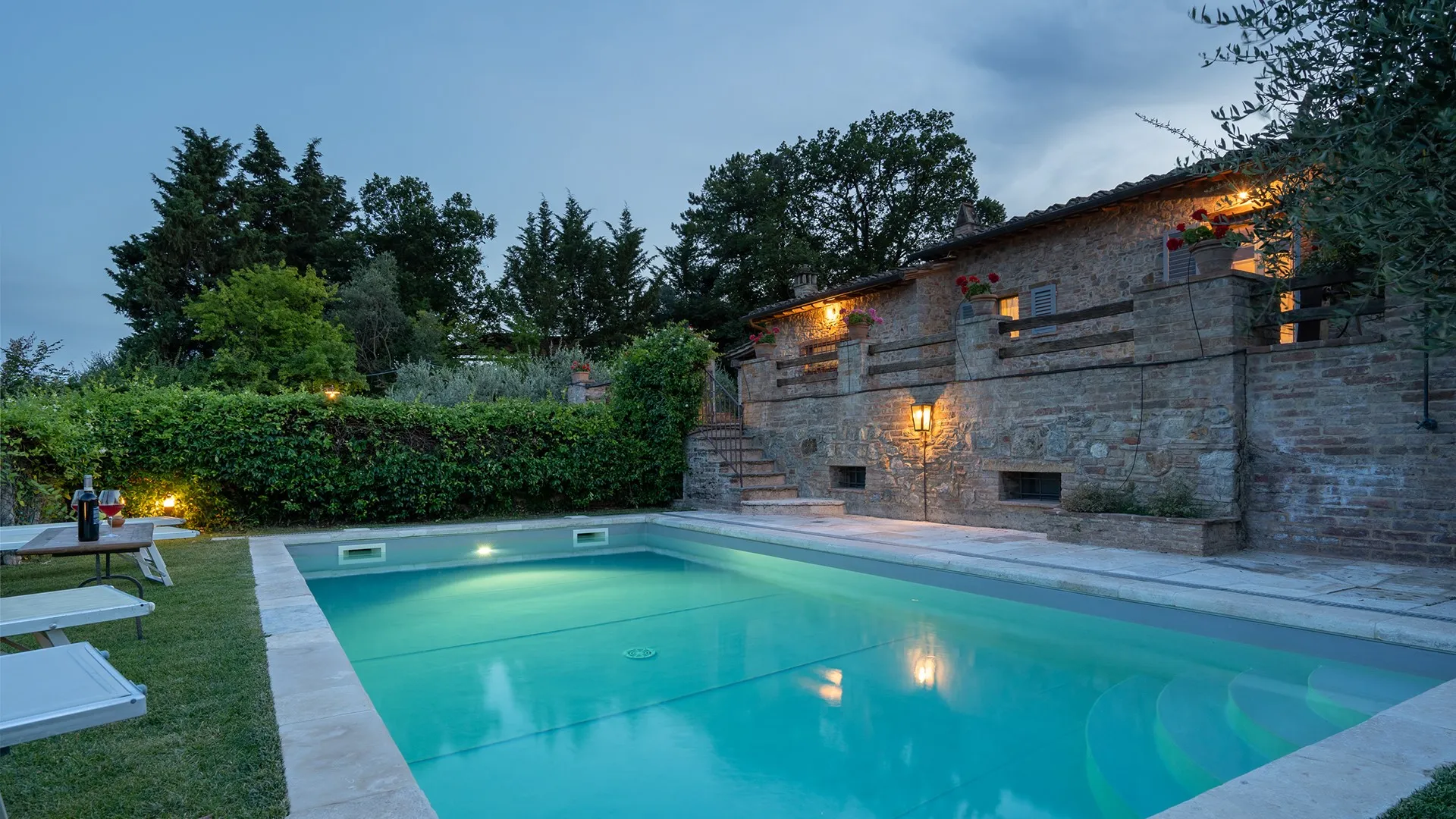 In the most secluded area of the property, set on a lower terrace about 15 m from the house and reached across the garden and then down a short flight of steps, is the swimming pool, completely enclosed by a fence and hedges that do not impede the panoramic view. The rectangular pool measures 4 x 8 m with a constant depth of 1.50 m. Lined in PVC with a stone edge, it has submerged steps for access to the water, chlorine purification and internal lights, also present throughout the surrounding area. An umbrella, small tables, comfortable sunbeds and a cold-water shower are the perfect complement to the lawn area. The pool is open from the last Saturday of April until the first Saturday of October.