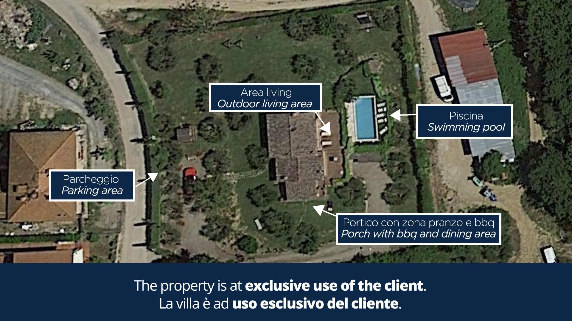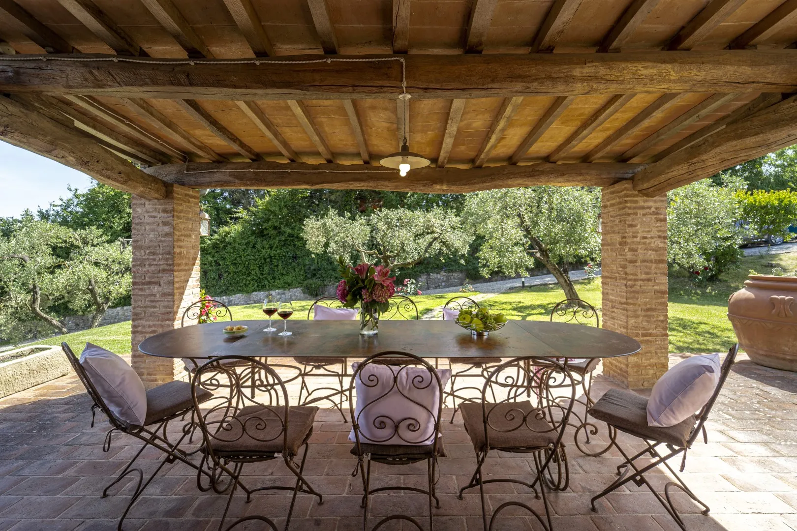 The park and garden for the exclusive use of the guests, completely enclosed by a fence and hedges guaranteeing privacy, extend for about 2500 sq m and include the 2-car parking area just past the entrance gate. The garden surrounding the house consists for the most part of large areas of lawn, suitable for children's play, and brightly-coloured flowering bushes, lots of olive trees and tall shady trees. The large stone portico at the entrance to the house is equipped with a table, chairs and barbecue for outdoor dining while on one side is a large terraced panoramic area suitable for relaxing.Please notice that photos are taken in spring, therefore flower blossoming, and the colours of the gardens' grass could be different at the moment of your arrival at the villa.