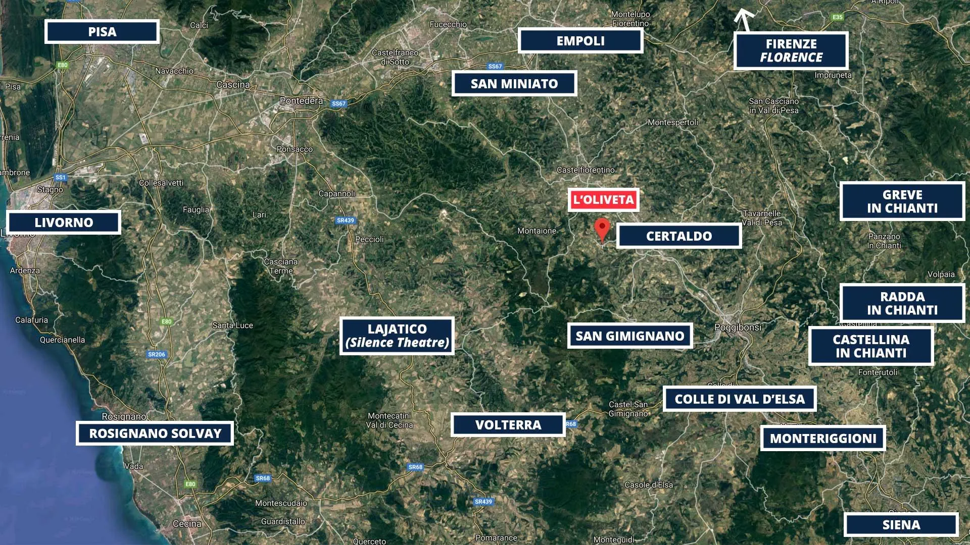 L'Oliveta is located about 6 km from Gambassi Terme and Certaldo, two little towns rich in history and culture in the beautiful setting of the Florentine Val d'Elsa, an area facing the valley of the Elsa river which extends to the northern area of Siena that winds through old borghi and castles and is characterised by green rolling hills alternating with expanses of olive groves and vineyards. The area, dotted with a vast network of paths, allows sports lovers to explore the numerous historical and artistic attractions of the area by bike, on horseback or simply on foot (the immediate surroundings are full of riding stables, sports centres and golf courses). The house is easily accessible from the airports of the region as well as the more distant ones, thanks to the motorway connections. The airports of Florence and Pisa are less than an hour away. Finally, for those wishing to take advantage of public transport, the railway station in Certaldo guarantees quick and easy