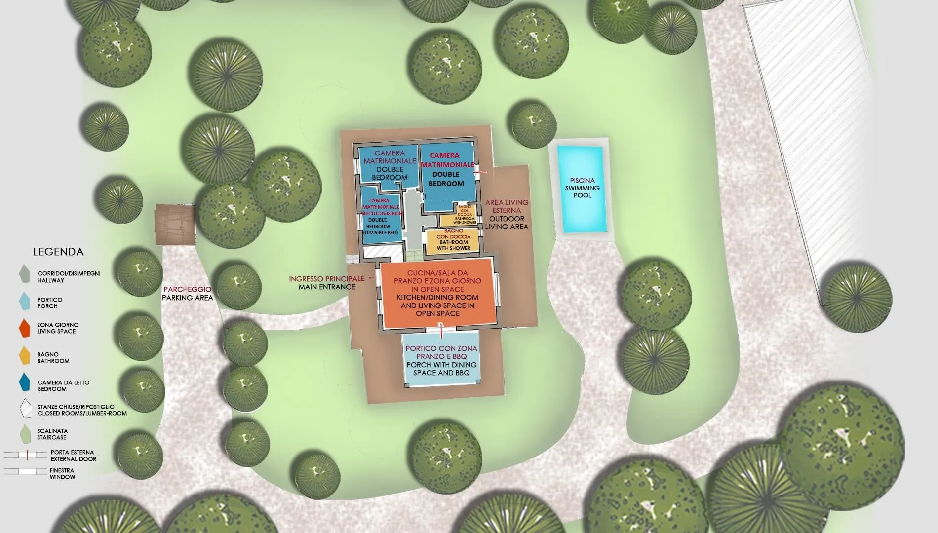 The house has a single floor. The main entrance leads from the portico into the spacious living room with seating area, dining table and modern kitchen. Three steps lead to the sleeping area, consisting of two double bedrooms, of which one with divisible bed, sharing a bathroom with shower and a double bedroom with ensuite bathroom with shower and direct access to the garden.