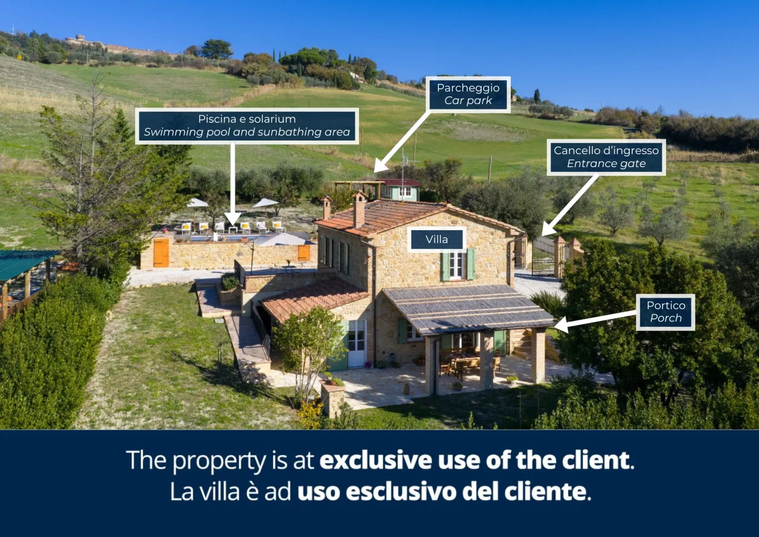 The property extends over approximately two hectares of rolling hills, with large, well-organised outdoor spaces. Surrounding the villa, a fenced area of about 1,000 sq m combines lawn and surfaces in gravel, with walkways that conveniently connect all the outdoor areas and a footpath along the entire perimeter of the house. The electric gate leads to the 2-car covered parking area, from where you can get to a 70 sq m natural wood solarium terrace with swimming pool. On the opposite side is the first entrance to the villa on the upper level, overlooking a panoramic terrace with views of the Val di Cecina. Continuing along the gravel path or the paved walkway, you come to the main portico, equipped with a dining table and connected directly to the kitchen and living room through two French windows. Opposite the portico is the barbecue area with a brick oven. A second, manually-opening, gate leads to a panoramic hillock from where you can admire Volterra and its ancient walls.Please notice that photos are taken in spring, therefore flower blossoming, and the colours of the gardens' grass could be different at the moment of your arrival at the villa.