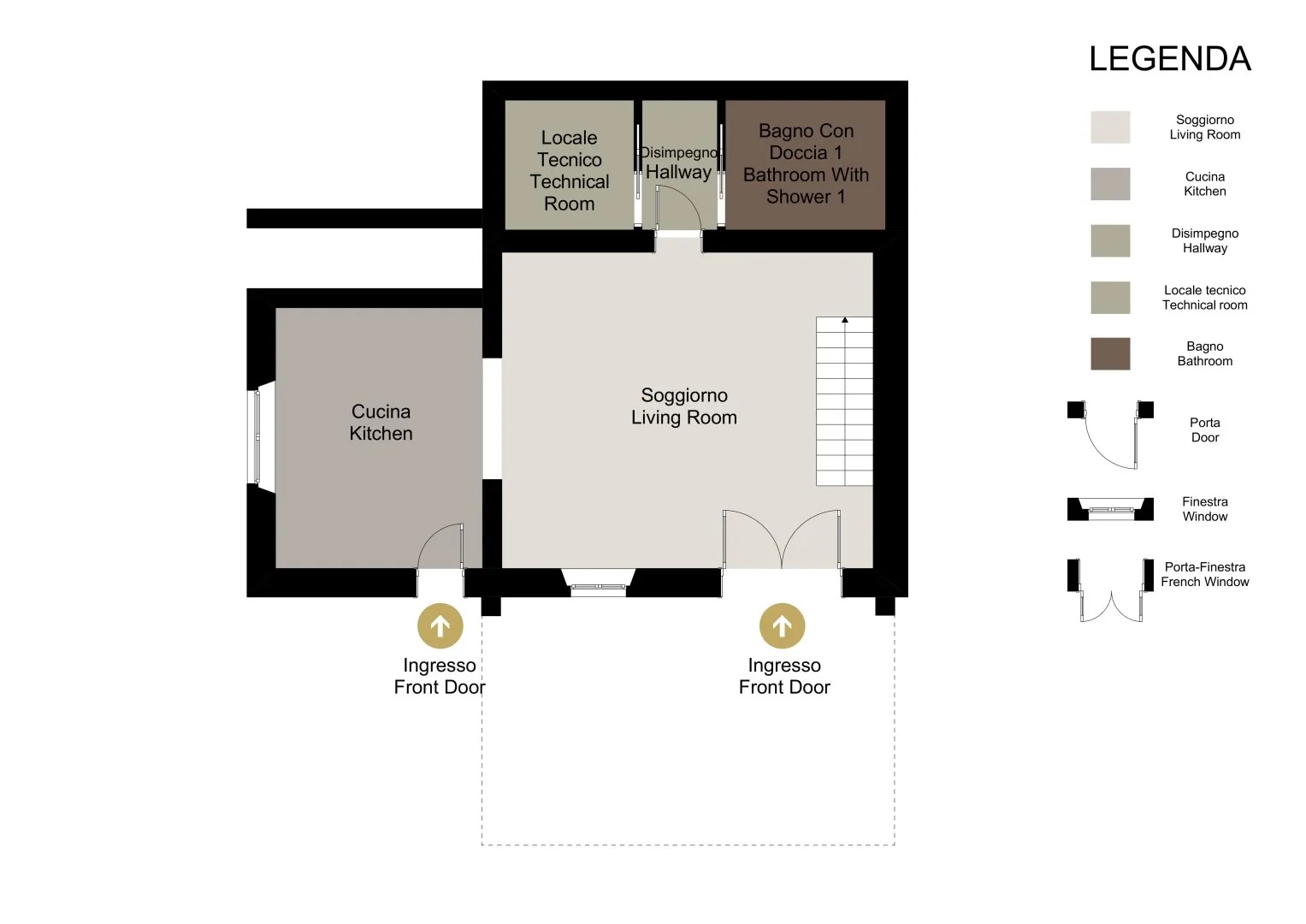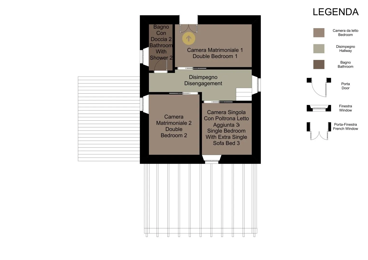 The villa extends over two levels (on a hilly surface) connected by an internal staircase in steel and wood. GROUND FLOOR (approx. 51 sq m) - Main entrance; modern kitchen with central island and direct access to the well-equipped outdoor portico; large living room with ornamental fireplace, sitting area and dining table; bathroom with shower; laundry room. FIRST FLOOR (approx. 40 sq m) - Two double bedrooms, one with direct access to the garden; a single bedroom (1.20m wide bed) with additional single sofa bed; bathroom with shower.